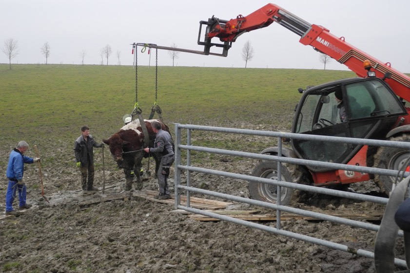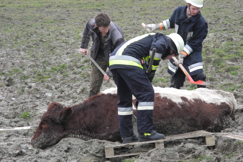 Als die Helfer aus der Kreisstadt eintrafen, hatten die Kameraden der örtlichen Wehr bereits einen Behelfs-Steg durch die unwegsame Wiese errichtet. Gemeinsam legten die Einsatzkräfte dem Rind ein Tierberge-Geschirr an. "Mit einem geländegängigen Teleskoplader war es schließlich möglich, die Kuh aus ihrer misslichen Lage zu befreien", so ein Feuerwehr-Sprecher. Der herbeigerufene Tierarzt hatte die Kuh zuvor medikamentös ruhiggestellt. Nach rund einer Stunde konnte das Tier erschöpft, aber unversehrt im Stall abgelegt werden.