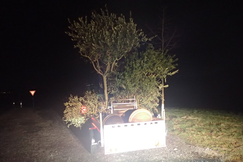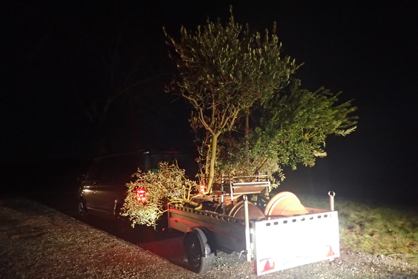 „Die Baumkronen ragten deshalb über den Anhänger hinaus“, so ein Polizei-Sprecher. „Nur die Pflanztöpfe hielten die Bäume noch auf dem Anhänger.“ Das Gespann wurde von den Gesetzeshütern in langsamer Fahrt zur nächsten Anschlussstelle begleitet und dort abgestellt, bis der 55-Jährige ein geeignetes Transport-Fahrzeug für seine Olivenbäume organisiert hatte.