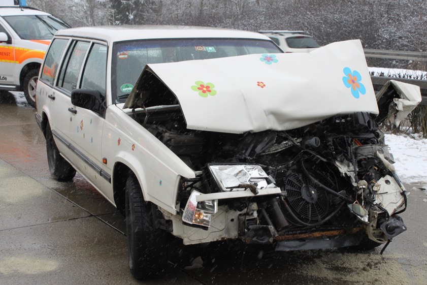Nur wenige Minuten später gab es – ebenfalls in Richtung Regensburg und ebenfalls zwischen Hausen und Bad Abbach einen Crash, als ein 39-jähriger Pkw-Fahrer aus Regensburg wegen vorausgegangener Unfälle sein Auto aufgrund nicht angepasster Geschwindigkeit bei von Schneematsch- bedeckter Strecke nicht mehr rechtzeitig stoppen konnte. Das Auto kollidierte laut Bericht der Polizei zunächst mit der linken sowie der rechten Schutzplanke und prallte dann ins Heck eines anderen Pkw.