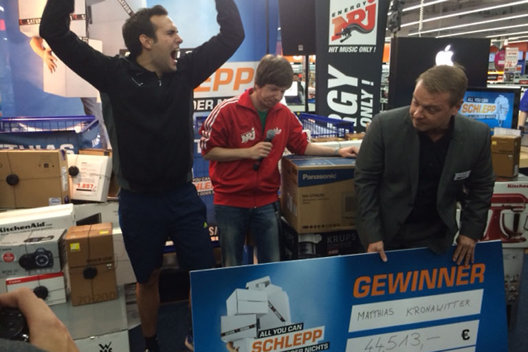 70 000 Menschen aus ganz Deutschland hatten sich beworben für diese Einkaufstour der besonderen Art, bei der es darum ging, in 150 Sekunden so viele im Idealfall teure Waren in die Zielzone zu schleppen, wie nur eben möglich. Denn der Kandidat mit dem höchsten Warenwert gewinnt. Drei war es letztlich, die Saturn ausgelost hatte, zwei Männer und eine Frau. Und die traten heute um 12.30 Uhr zum großen Vergleichskampf in Ingolstadt gegeneinander an.