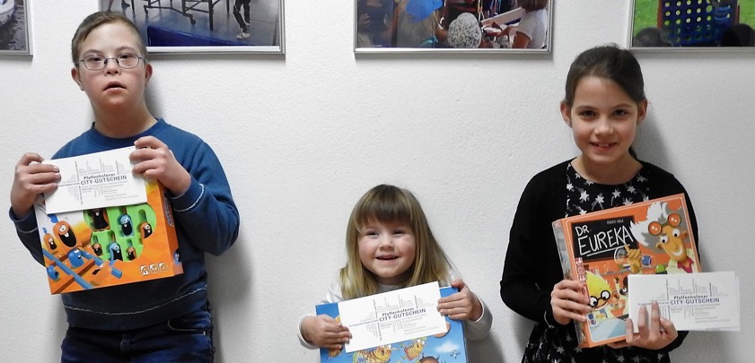 (ty) Im Rahmen der Brettspiel-Wanderausstellung des Pfaffenhofener Kreisjugendrings (KJR), die in den vergangenen Monaten in verschiedenen Gemeinden des Landkreises Station gemacht hat, konnten die Kinder dem KJR das Spiel nennen, das ihnen am besten gefallen hat, und auf diese Weise zugleich an einem Gewinnspiel teilnehmen. Am Ende erhielten Michael Eder (Foto, von links), Amelie Öttl und Lena Tschirn die drei Hauptpreise: jeweils ein Pfaffenhofener City-Gutschein und das zuvor gewählte Lieblingsspiel. (Foto: Kestel)