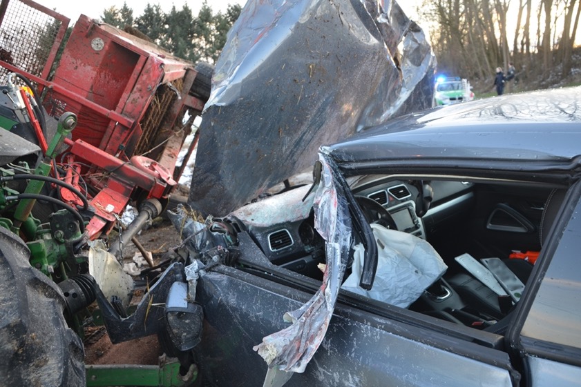 Der junge Pkw-Lenker krachte frontal in ein Traktor-Gespann und kam mit leichten Verletzungen davon.