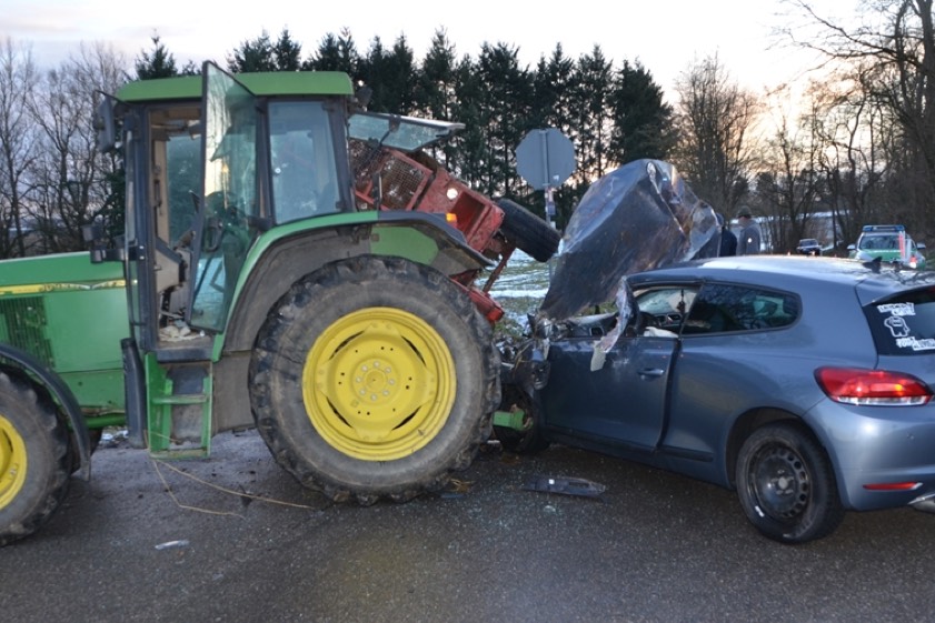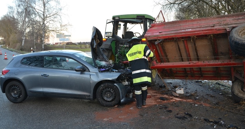 Der junge Mann, der aus dem Landkreis Fürstenfeldbruck stammt, war den Angaben zufolge gegen 15.45 Uhr von Reichertshofen in Richtung Starkertshofen unterwegs, als es schepperte. Wie es heißt, übersah er das landwirtschaftliche Gespann eines 54-Jährigen aus Reichertshofen, der auf der Vorfahrtsstraße fuhr. Der Pkw prallte gegen den Anhänger. Wie massiv die Kollision war, zeigt sich nicht nur an den Fotos, sondern auch daran, dass der Anhänger umkippte und der Pkw total demoliert wurde.