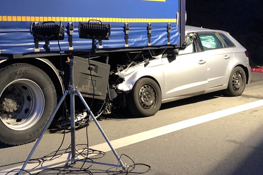 Gestern gegen 16.40 Uhr ereignete sich auf der A 3 zwischen Kirchroth und Wörth/Donau (Kreis Regensburg) in Fahrtrichtung Regensburg ein schwerer Unfall, bei dem eine Person ums Leben gekommen ist. Ein 51-jähriger Ungar befuhr mit seinem Lkw die rechte Spur mit 88 km/h, er hatte den Tempomat eingestellt. Plötzlich und für ihn völlig unerwartet verspürte er einen heftigen Anprall auf sein Heck. Er bremste seinen Laster daraufhin ab und fuhr auf den Seitenstreifen. Dort stellte er fest, dass ein Pkw unter seinem Lkw eingeklemmt war (Foto oben).