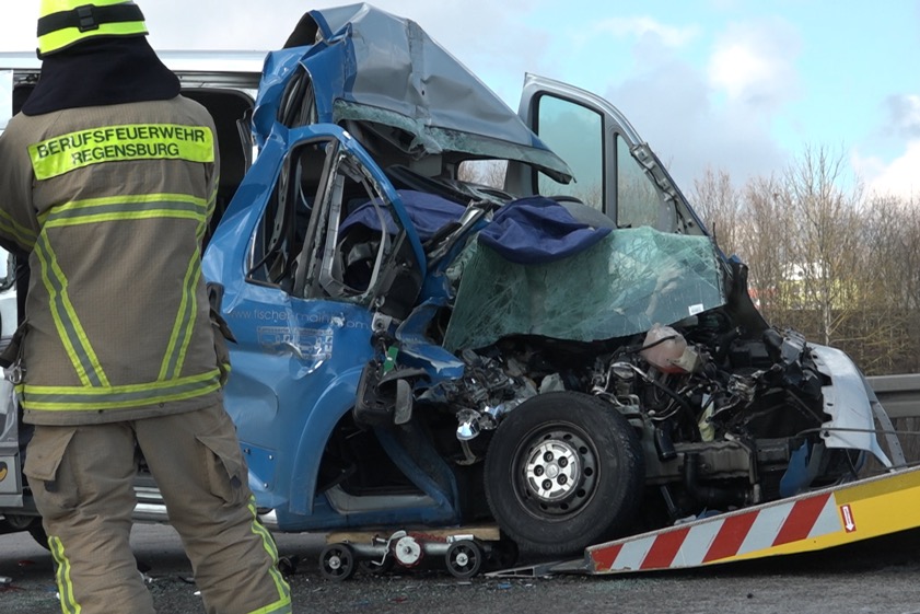 Fast zeitglich ereignete sich unmittelbar auf Höhe der Anschlussstelle Regensburg-Burgweinting ebenfalls ein Auffahr-Unfall. Ein Sprinter, besetzt mit drei Rumänen, samt Autohänger, krachte ins Heck eines abbremsenden Lkw (Foto oben). Die drei Personen wurden im Sprinter eingeklemmt und mussten von der Feuerwehr aus dem stark demolierten Wrack befreit werden. Zwei von ihnen waren schwer verletzt, sie kamen in ein Krankenhaus.
