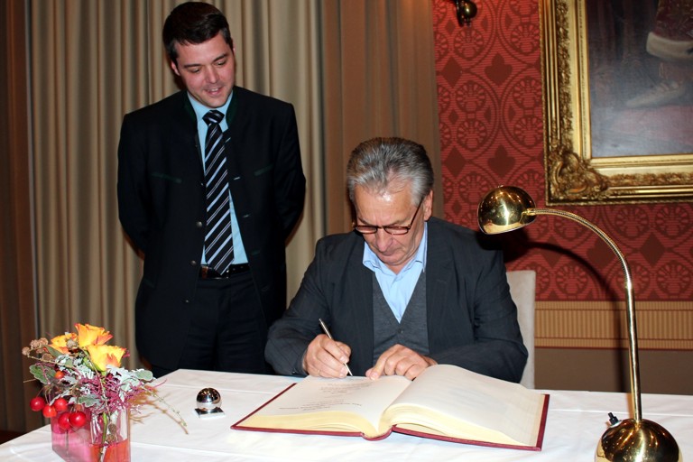 Werner Roß war der Festredner gekommen und trug sich unter den Augen von Bürgermeister Thomas Herker (SPD) ins Buch der Stadt ein.