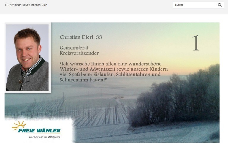 „Unsere Bewerber stellen sich kurz vor und sprechen die besten Wünsche aus“, erklärt der kürzlich nach dem Rücktritt von Claudia Jung zum neuen Kreisvorsitzenden gewählte Christian Dierl das Konzept. Der 33-Jährige hat am 1. Dezember den Anfang gemacht: „Ich wünsche Ihnen allen eine wunderschöne Winter- und Adventszeit sowie unseren Kindern viel Spaß beim Eislaufen, Schlittenfahren und Schneemann bauen“, steht da. Kreisrat Max Hechinger (64) wünschte hinter dem zweiten Türchen „viel Freunde den schönen Christkindlmärkten“; am 3. Dezember verkündete Herbert Nerb (48), Bürgermeister von Manching und Kreisrat: „Ich wünsche Ihnen und Ihrer Familie eine schöne Adventszeit sowie etwas Zeit zur Entspannung und Besinnung.“