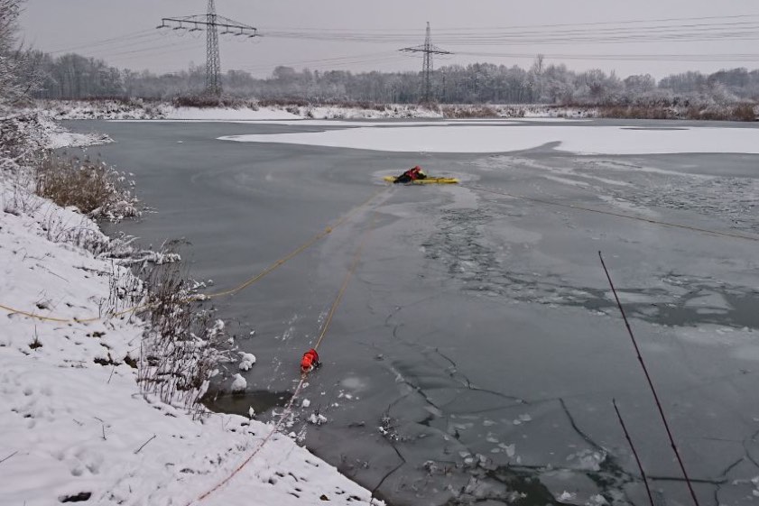 Wasserretter, gesichert mit einer Leine und auf einem so Eisrettungs-Schlitten führten die Oberflächenrettung durch. Da alle Wasserretter ausgebildete Schnorchler sind, wurde auch ein so genannter Nottauch-Versuch trainiert. Gesichert mit einer Signalleine tauchen die Wasserretter in das Eisloch ab und suchen nach der untergegangenen Person. Ist ein solcher Nottauch-Versuch nicht ausreichend, dann kommen Einsatztaucher zum Einsatz. Diese sind zwar viel schwerer, jedoch aufgrund ihres Tauchgeräts in der Lage, eine längere Suche durchzuführen.