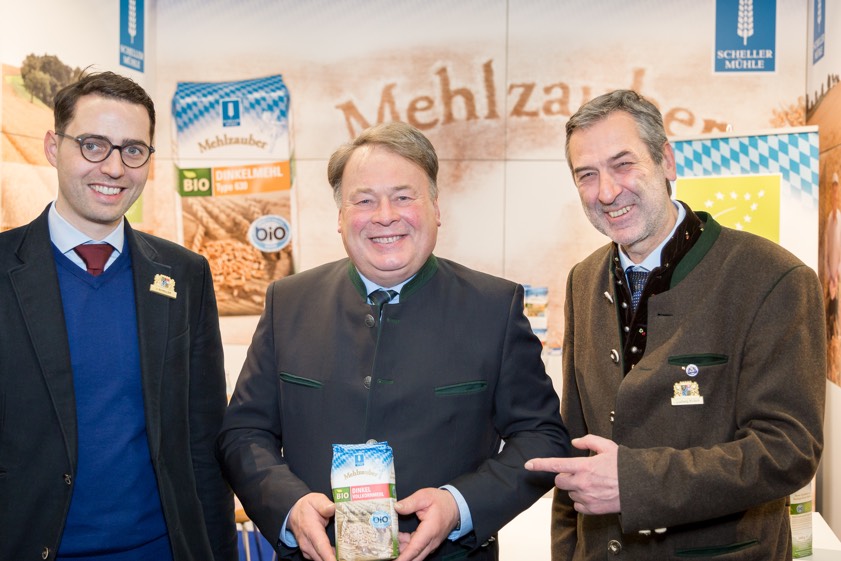 (ty) Bei seinem Messerundgang auf der "Biofach" in Nürnberg hat der bayerische Landwirtschaftsminister Helmut Brunner (CSU) auch am Stand der Scheller-Kunstmühle aus Reisgang (Gemeinde Hettenshausen) vorbeigeschaut und sich von Firmeninhaber Josef Scheller über die aktuelle Produktpalette an Biomehlen informieren lassen (Foto oben). Das Familien-Unternehmen ist bereits seit Jahren auf dem Bayernstand der Öko-Fachmesse vertreten und gehörte zu den ersten Zeichennutzern des 2015 eigeführten bayerischen Bio-Siegels.