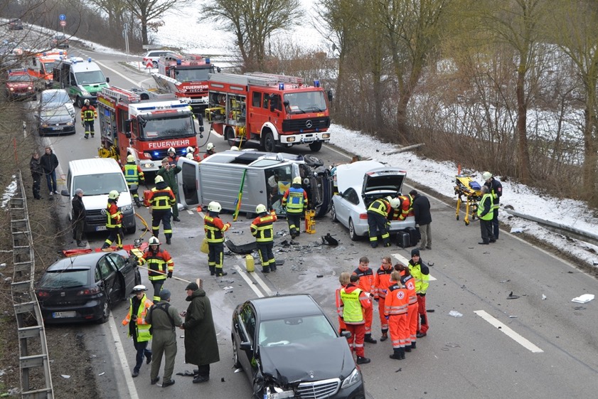 (ty) Mehrere Verletzte hat am heutigen Vormittag ein schwerer Verkehrsunfall auf der B 16 bei Manching gefordert. Neben einem Großaufgebot von Feuerwehren und Rettungswagen ist auch ein Rettungshubschrauber am Unglücksort bei der Brücke an der Mitterstraße eingetroffen. Die Vollsperrung der Bundesstraße wird voraussichtlich noch bis weit in die Nachmittags-Stunden andauern.