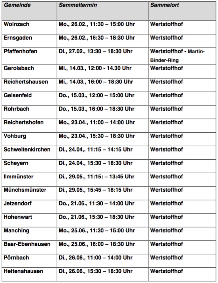 Alle wichtigen Infos und Daten zu den speziellen Abgabe-Möglichkeiten im Kreis Pfaffenhofen.