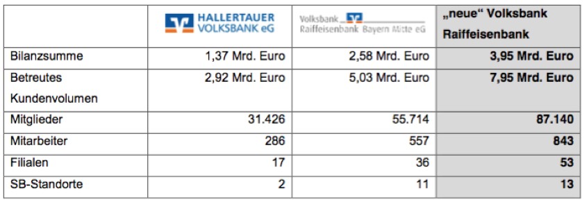 Die Hallertauer Volksbank beschäftigte zum Ende vergangenen Jahres 286 Mitarbeiter und zählte 31 426 Mitglieder, die Volksbank-Raiffeisenbank Bayern-Mitte hatte 557 Personen auf der Gehaltsliste und vermeldete 55 714 Mitglieder. Beide Kreditinstitute betreiben aktuell insgesamt 53 Filialen und 13 Selbstbedienungs-Standorte. Im Factory-Outlet-Center „Ingolstadt Village“ ist die Fusion übrigens schon seit Jahren vorweggenommen – dort betreibt man bereits gemeinsam einen Geldautomaten.