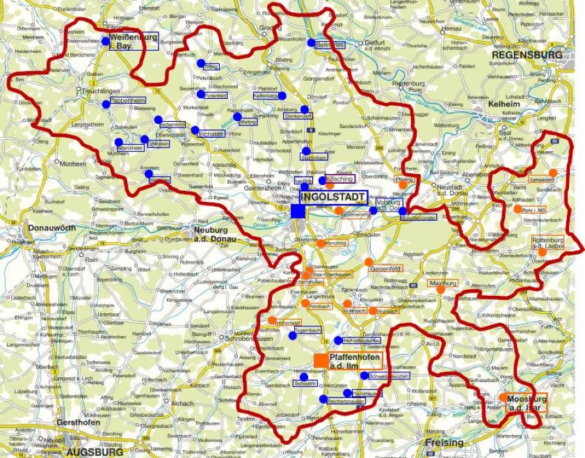 Die aktuellen Standorte der beiden Banken „ergänzen sich gut“, heißt es in der Pressemitteilung. Von Weißenburg im Norden bis Moosburg/Isar im Süden sowie von Pappenheim (im Westen) bis Langquaid im Osten biete man ein dichtes Filial-Netz – das wäre grob die Ausdehnung des Geschäftsgebiets nach der Fusion (siehe Karte oben).