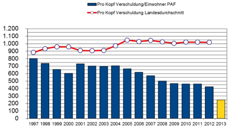 Hier die Entwicklung der Pro-Kopf-Verschuldung in Pfaffenhofen im Vergleich zum Landesschnitt: