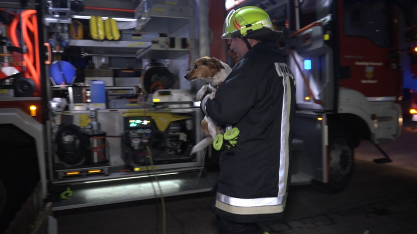 Auch zu einer tierischen Rettungsaktion kam es in dem Brandhaus. Die Einsatzkräfte fanden in einer der verrauchten Wohnungen einen Hund und dessen Besitzerin. Während die Frau von den ersten beiden Atemschutzträgern mit Hilfe einer Fluchthaube die Treppe hinunter ins Freie geführt werden konnte, kümmerte sich der dritte Feuerwehrler um den stark verängstigten Vierbeiner. Fest umschlungen mit den Armen konnte auch der Hund nur wenige Sekunden später aus dem lebensbedrohlichen Rauch gerettet werden.