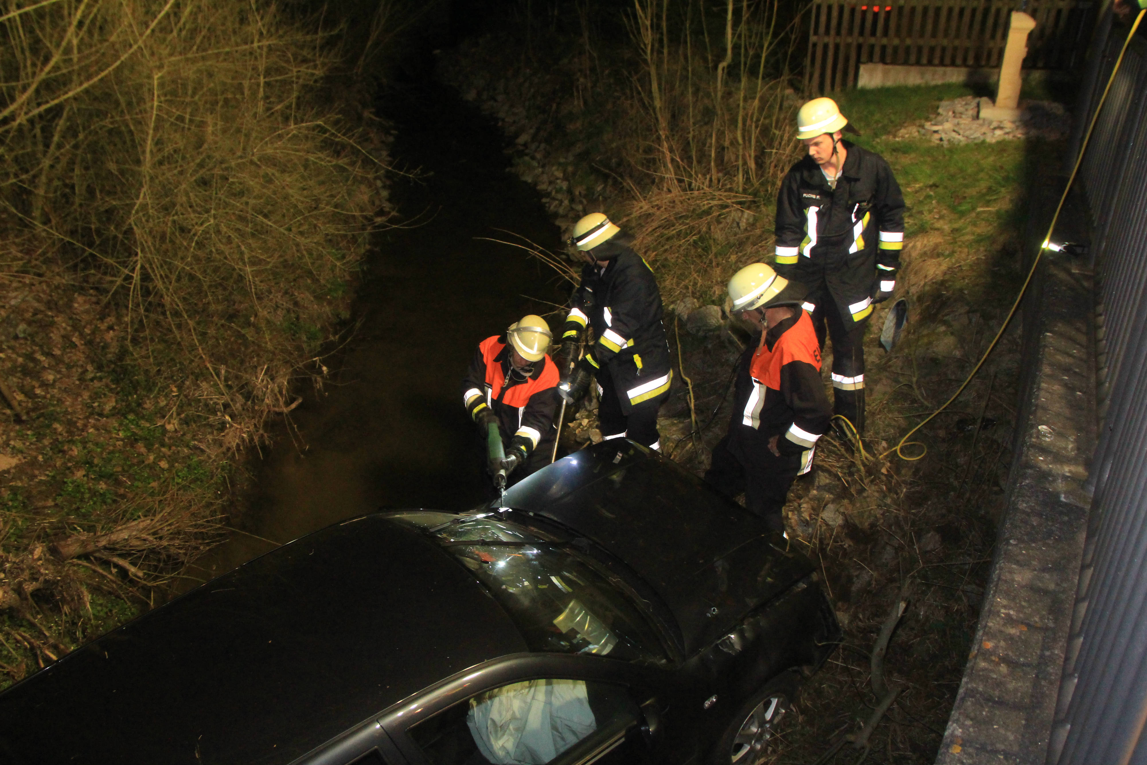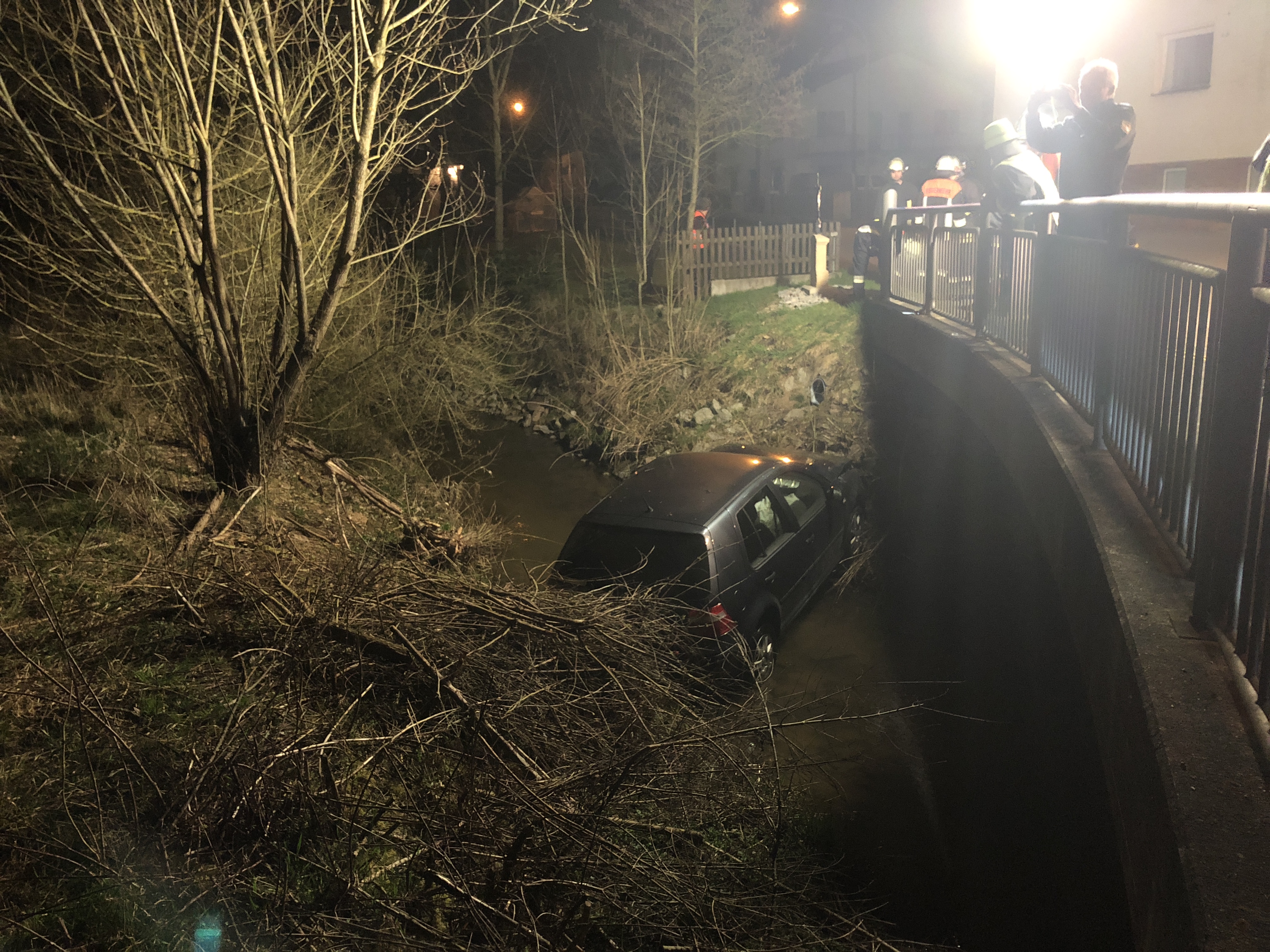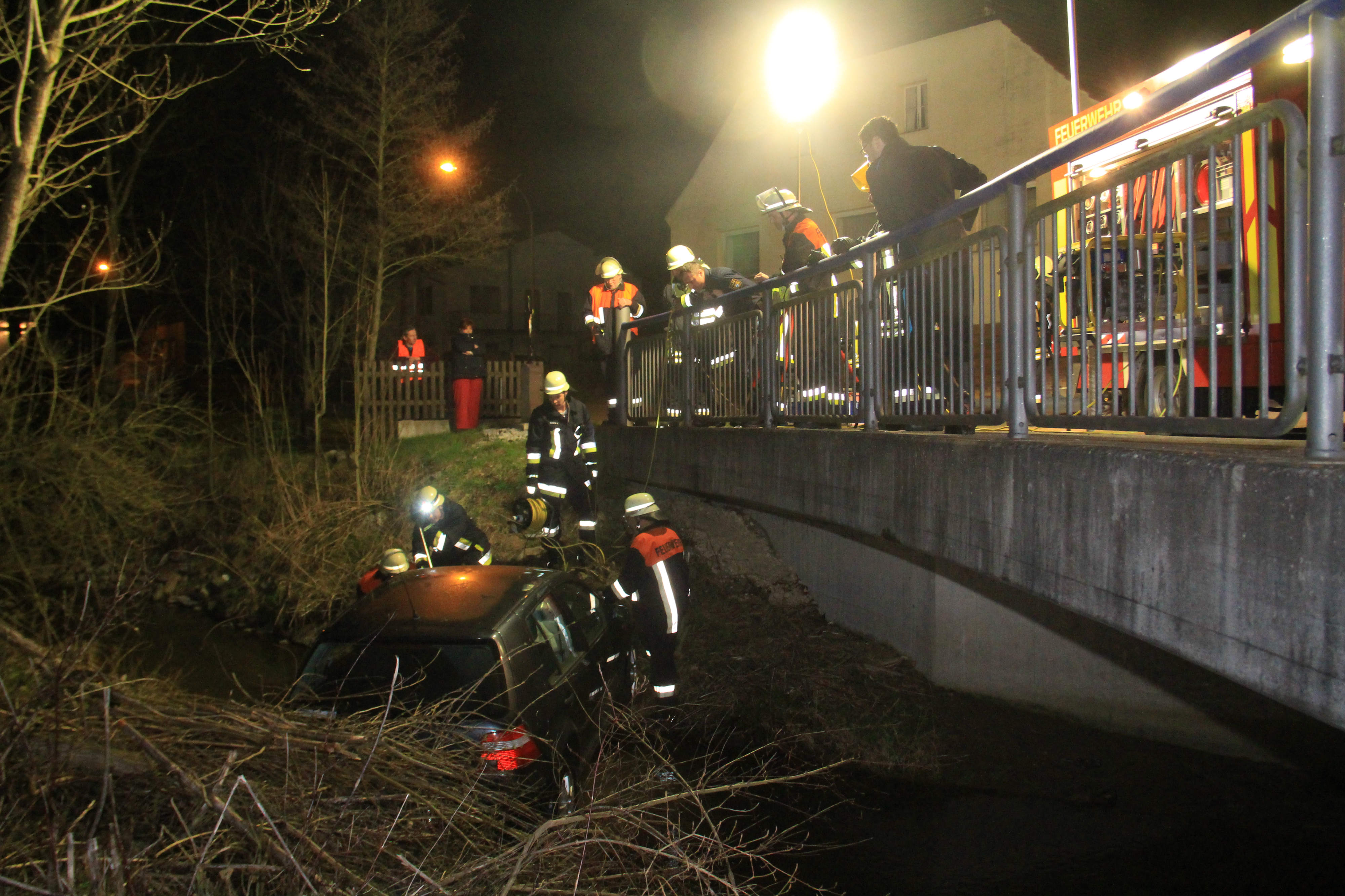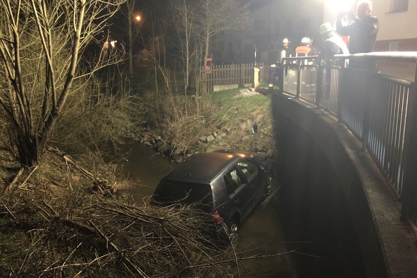 (aa) Sowas hatte selbst der Kreisbrandmeister noch nicht erlebt. Am gestrigen Abend gegen 20.45 Uhr wurden die Feuerwehren aus Altenthann, Lichtenwald, Sulzbach/Donau und Donaustauf nach Unterlichtenwald (Kreis Regensburg) alarmiert – wegen eines Pkw im Bach und einer eingeklemmten Person. Vor Ort bestätigte sich die Lage, ein VW befand sich im rund drei Meter tiefen Bachbett neben der Staatsstraße. Glücklicherweise hatte ein Ersthelfer das Licht aus der Tiefe neben der Straße gesehen und so das Unfall-Auto bemerkt. Der couragierte Mann zögerte nicht, sprang ins kühle Nass und befreite die 60-jährige Autofahrerin aus ihrer misslichen Lage.
