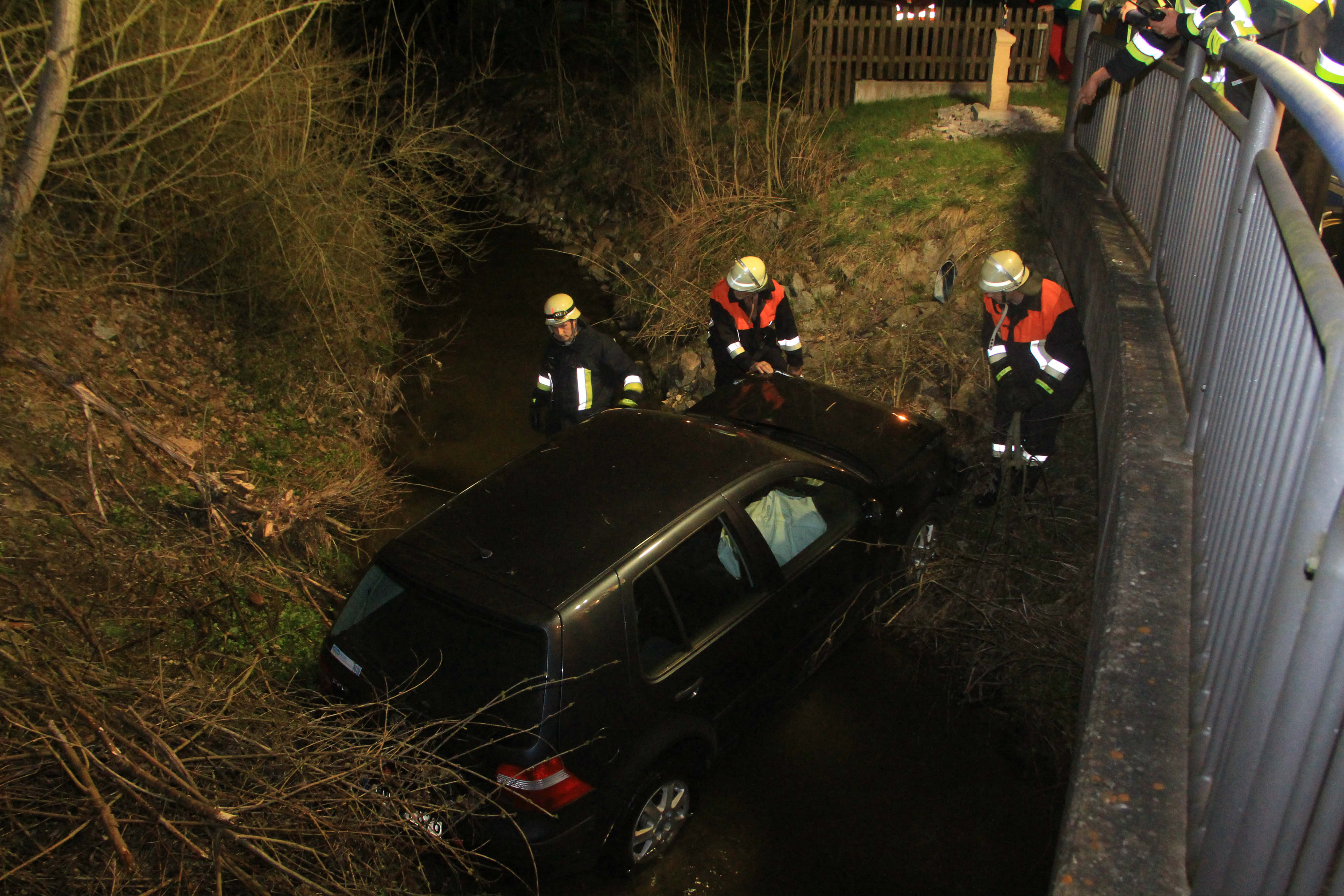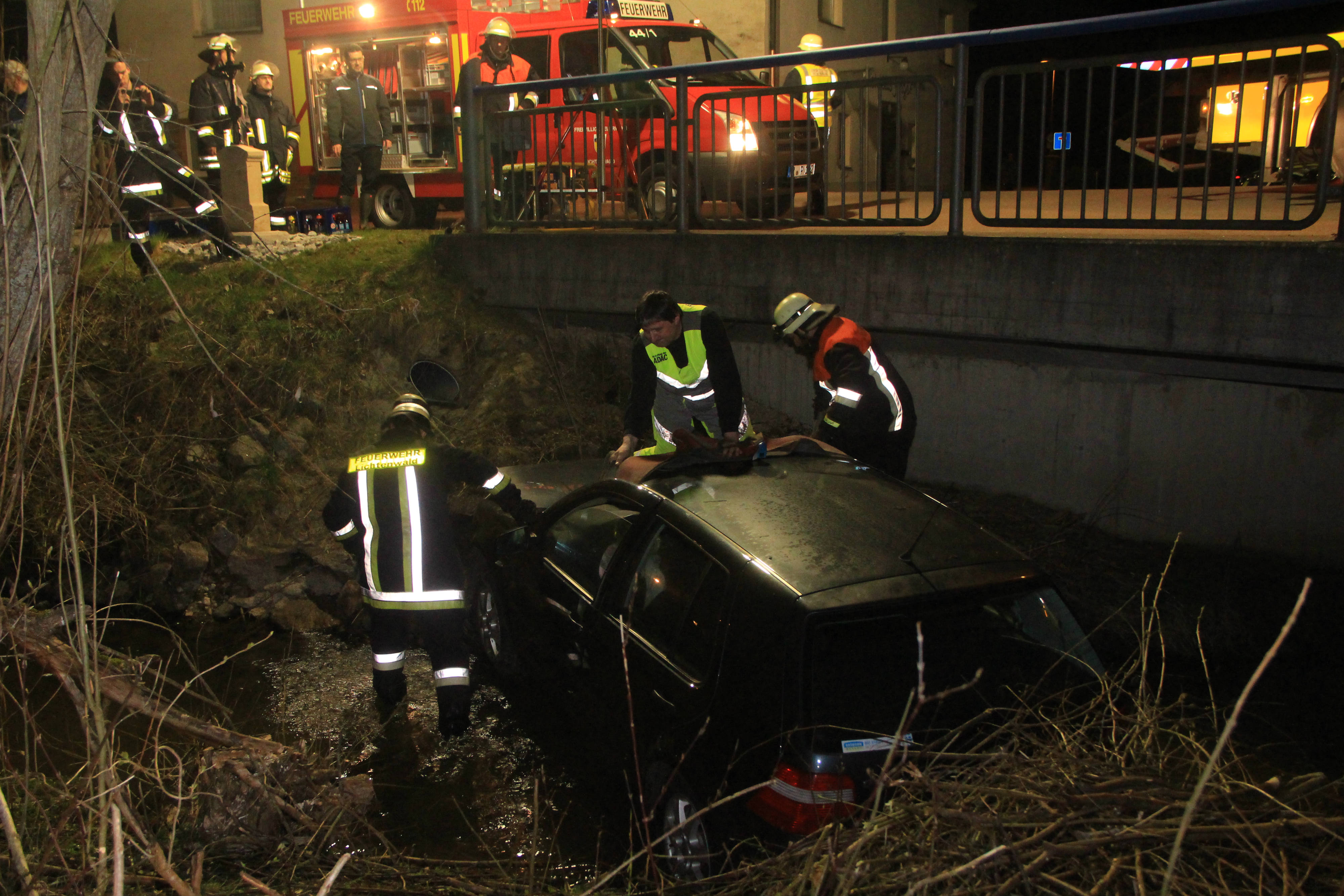 60-Jährige landete gestern Abend mit ihrem Pkw in einem Bach, ein Ersthelfer rettete sie. Aufwändige Bergungs-Maßnahmen.