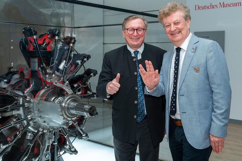 Flughafen-Chef Michael Kerkloh (links) und der Generaldirektor des Deutschen Museums, Professor Dr. Wolfgang M. Heckl, neben einem Sternmotor (BMW 132), der unter anderem als Antrieb für die Junkers JU 52 genutzt wurde. (Foto: Flughafen München)