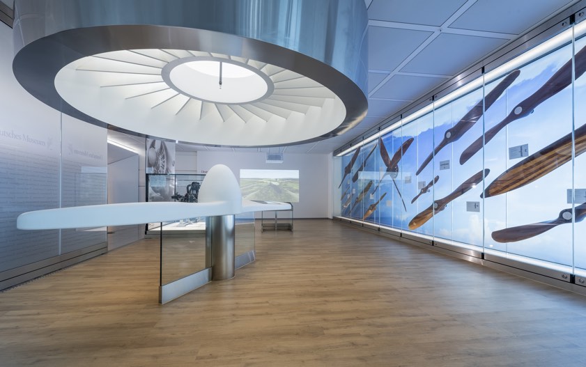 Natürlich geht es in dieser neuen Außenstelle des Deutschen Museums vor allem um das Thema Luftfahrt. In einer Großvitrine sind 16 Holzpropeller ausgestellt – darunter sogar einer der Gebrüder Wright. In einer weiteren Vitrine kann ein BMW-Flugzeugmotor der legendären „Tante Ju“ in Augenschein genommen werden. Und gleich neben der Ausstellungsfläche hat man einen fantastischen Blick auf das Vorfeld des Airports mit den hier parkenden und rollenden Passagier-Maschinen.