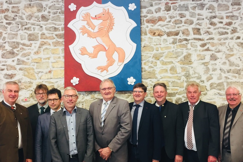 Die Vorstands-Riege des Pfaffenhofener Kreisverbands im bayerischen Gemeindetag mit Landrat Martin Wolf: Reinhard Heinrich (von links, Bürgermeister von Reichertshausen), Landrat Martin Wolf, Helmut Bergwinkel (Pörnbach), Franz Dirnberger (Geschäftsführender Direktor des bayerischen Gemeindetags), Manfred Russer (Hohenwart), Albert Vogler (Schweitenkirchen), Jens Machold (Wolnzach), Martin Schmid (Vohburg), Christian Staudter (Geisenfeld).