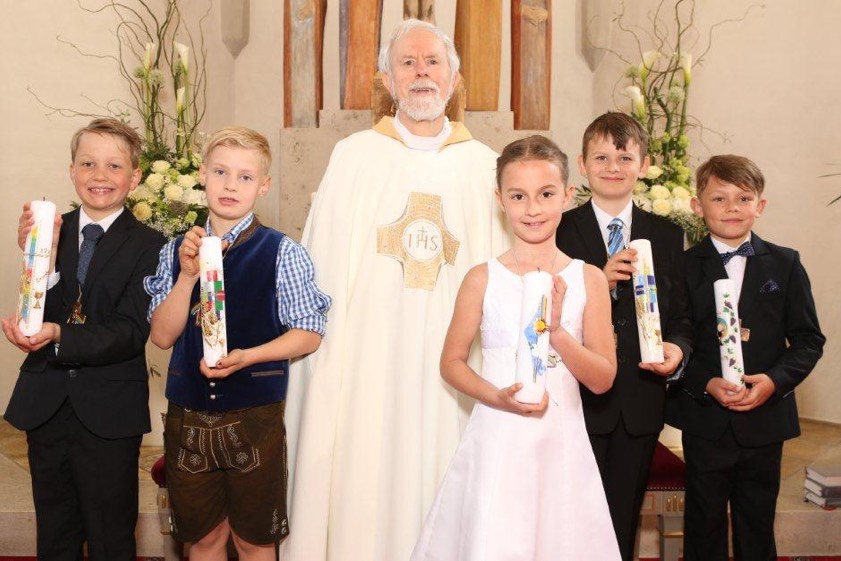 (ty) Fünf Kinder aus Geisenhausen und Walkersbach haben am gestrigen Sonntag mit ihren Verwandten, Freunden und der Pfarrgemeinde ihren großen Tag der Erstkommunion gefeiert. Mit dem Thema "Öffne dein Herz unter Gottes Regenbogen" empfingen sie aus der Hand von Pfarrer Karl Bräutigam in der Kirche St. Emmeram in Geisenhausen ihre erste heilige Kommunion. Der Festgottesdienst wurde vom Singkreis Geroldshausen stimmungsvoll mitgestaltet und umrahmte den Tag, auf den sich die Kinder intensiv vorbereitet hatten.