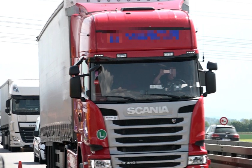 Lkw-Lenker filmt mit dem Handy während der Fahrt die Unfallstelle.