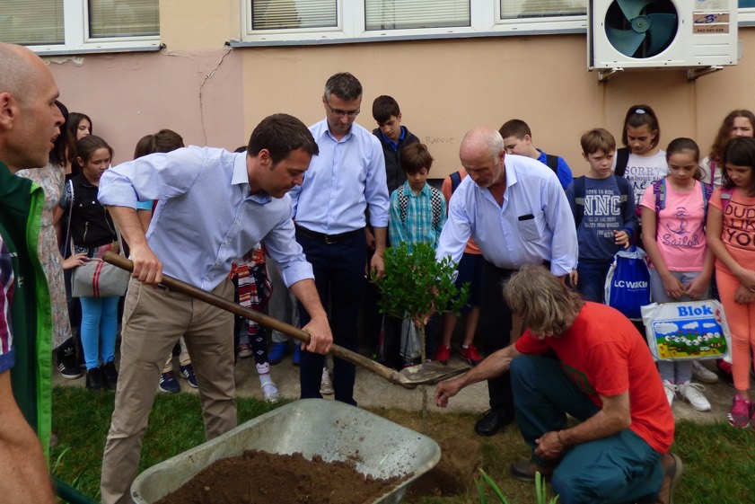 Unter Leitung von Bürgermeister Thomas Herker (SPD) nahmen der Stadtrats-Referent für Grünanlagen, Manfred „Mensch“ Mayer (GfG), Theo Abenstein von der "Bayerischen Arbeitsgemeinschaft Demokratischer Kreise" als Vertreter der Zivilgesellschaft sowie der Mario Dietrich von den Stadtwerken an dem Informations-Austausch teil. Ihre direkten Ansprechpartner waren während des gesamten Aufenthalts die dortigen Projekt-Verantwortlichen Miroslav Pimic und Aleksandra Tomic, die vor kurzem die Pfaffenhofener Nachhaltigkeits-Aktivitäten kennengelernt hatten. Unter Anteilnahme der Medien und der schulischen Öffentlichkeit gab es eine Auftakt-Veranstaltung zum Projekt mit einer anschließenden Baumpflanz-Aktion (Foto oben) auf dem Gelände der Grundschule von Valjevo.