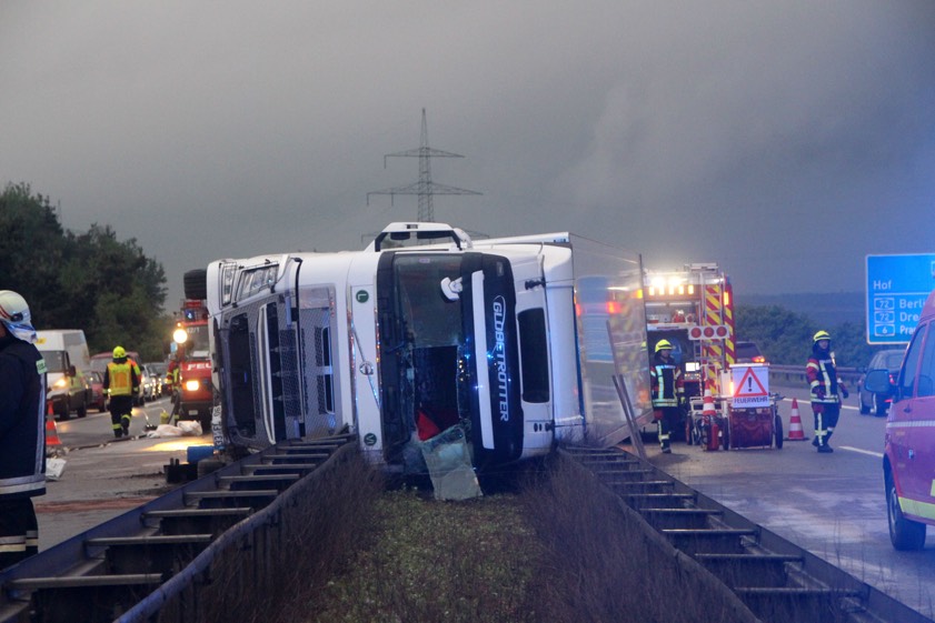 (aa) Kurz vor 20 Uhr kam es gestern Abend auf der A93 zu einem schweren Verkehrsunfall. Ein Lkw kollidierte mit einem Pkw und krachte anschließend in die Mittelleitplanke. Dort kippte der Sattelzug– vollbeladen mit Eiern – auf die Leitplanke und die Gegenfahrbahn um (Foto oben). Die Feuerwehren aus Regenstauf, Diesenbach und Ponholz konnten den eingeschlossenen Fahrer schnell befreien. Auch der Pkw-Lenker verletzte sich bei dem Unfall. Der Autofahrer und der Lkw-Fahrer wurden in ein Regensburger Krankenhaus gebracht. Während der Unfallaufnahme überschattete die Arbeiten der Einsatzkräfte eine spektakulär aufziehende Gewitterfront. Nur wenige Minuten später ergoss sich einige Minuten lang Starkregen über die Einsatzkräfte auf der Autobahn. Die A93 musste für rund eine Stunde komplett in beide Richtungen gesperrt werden.