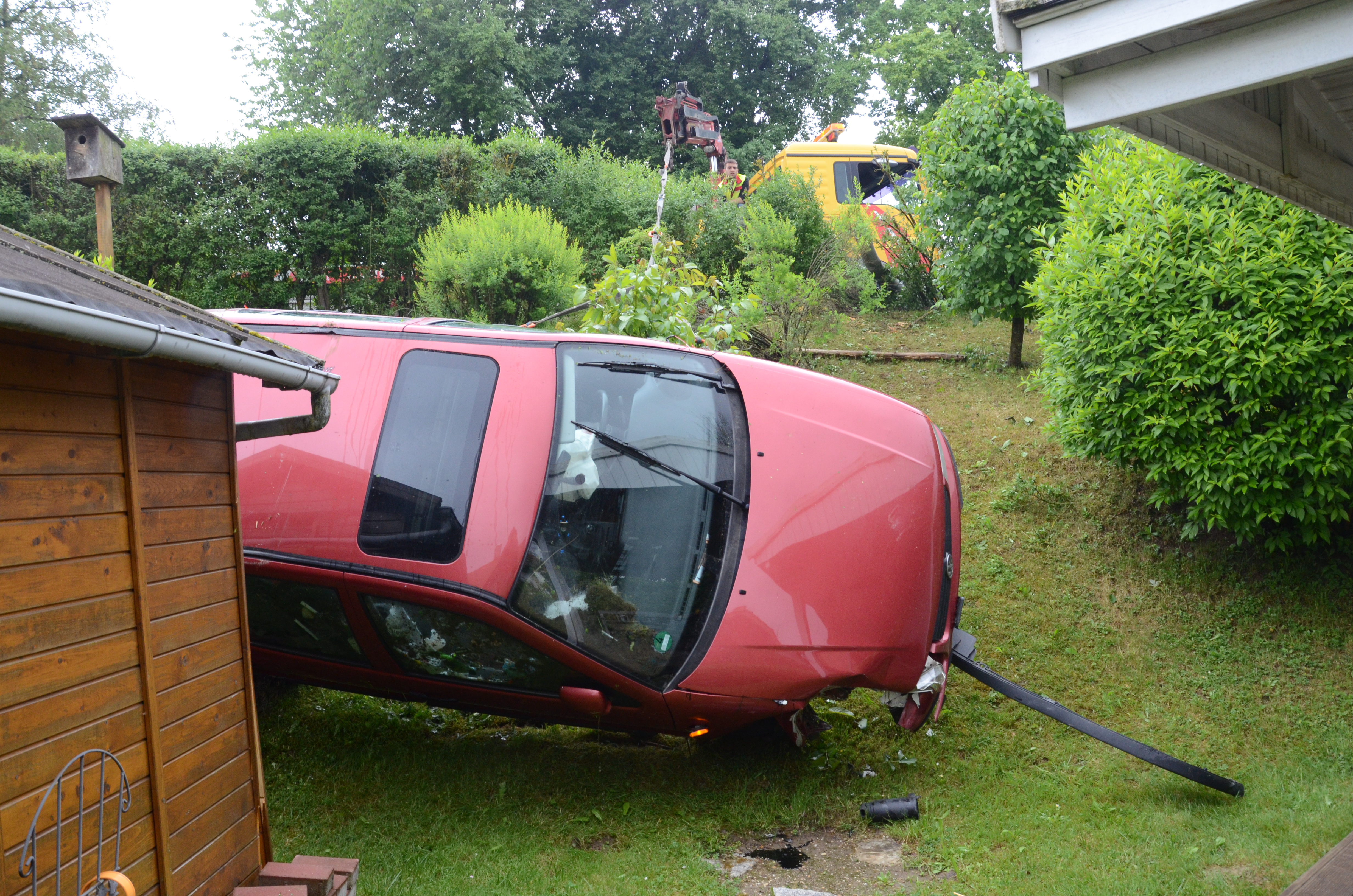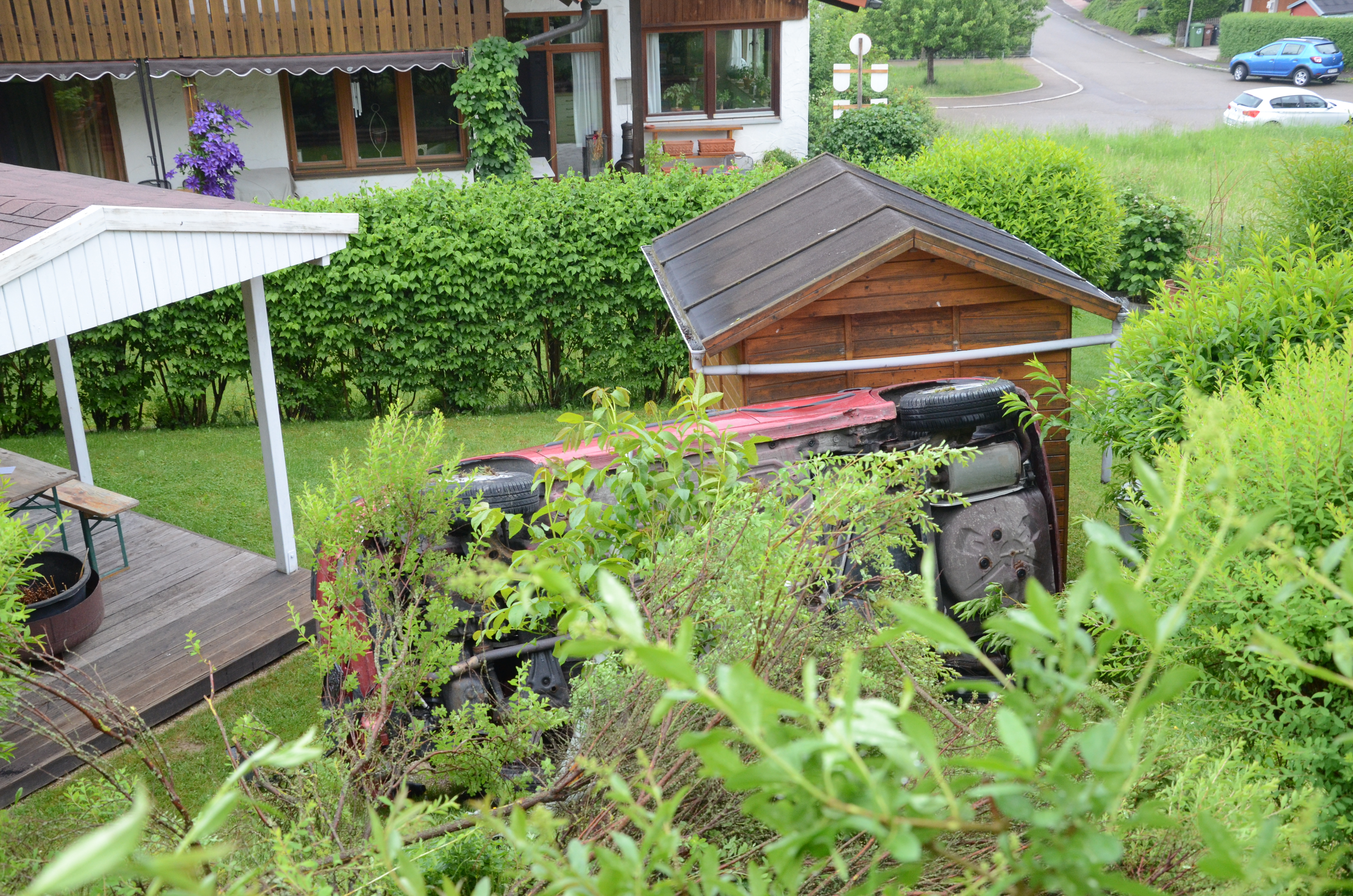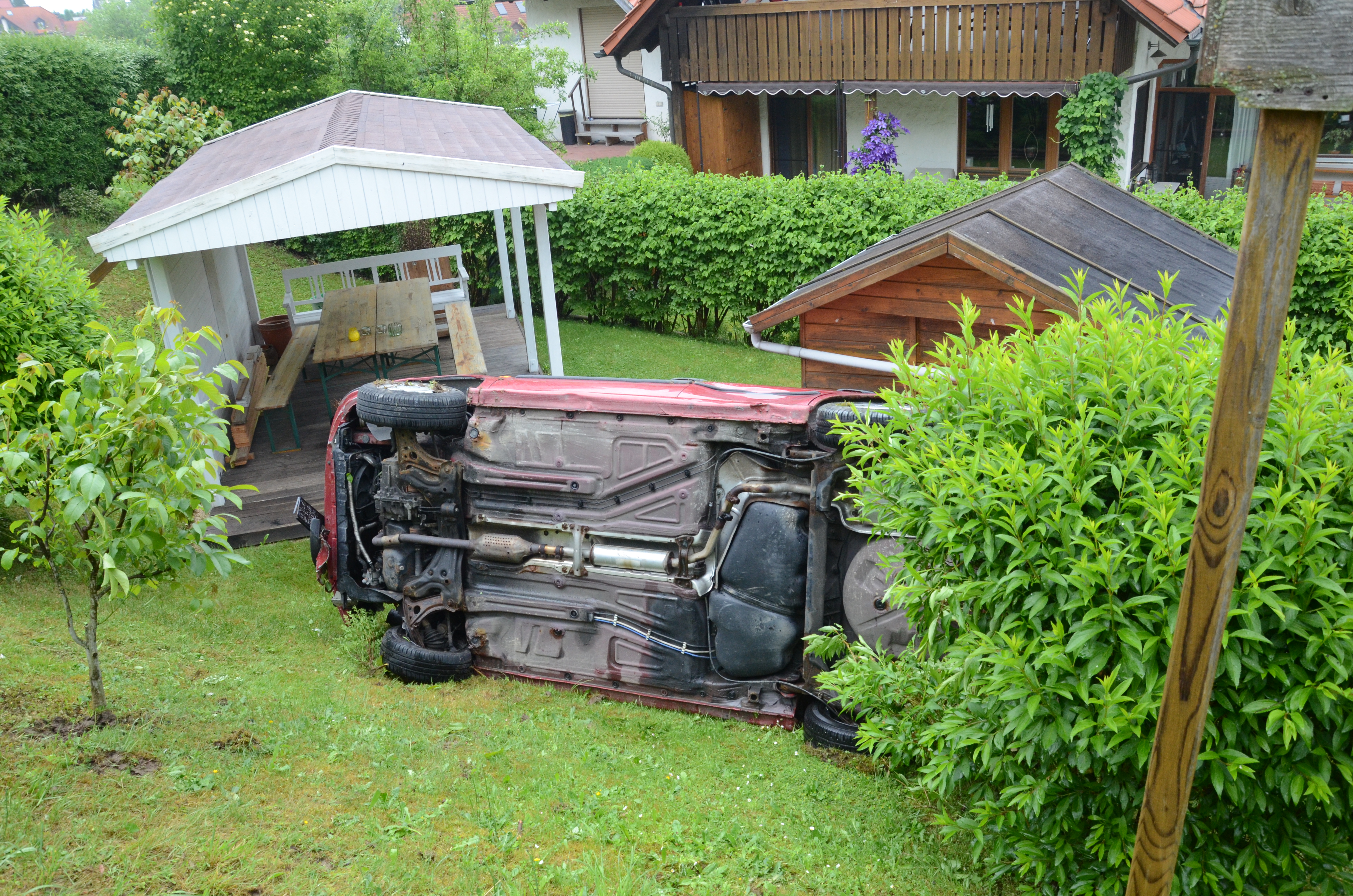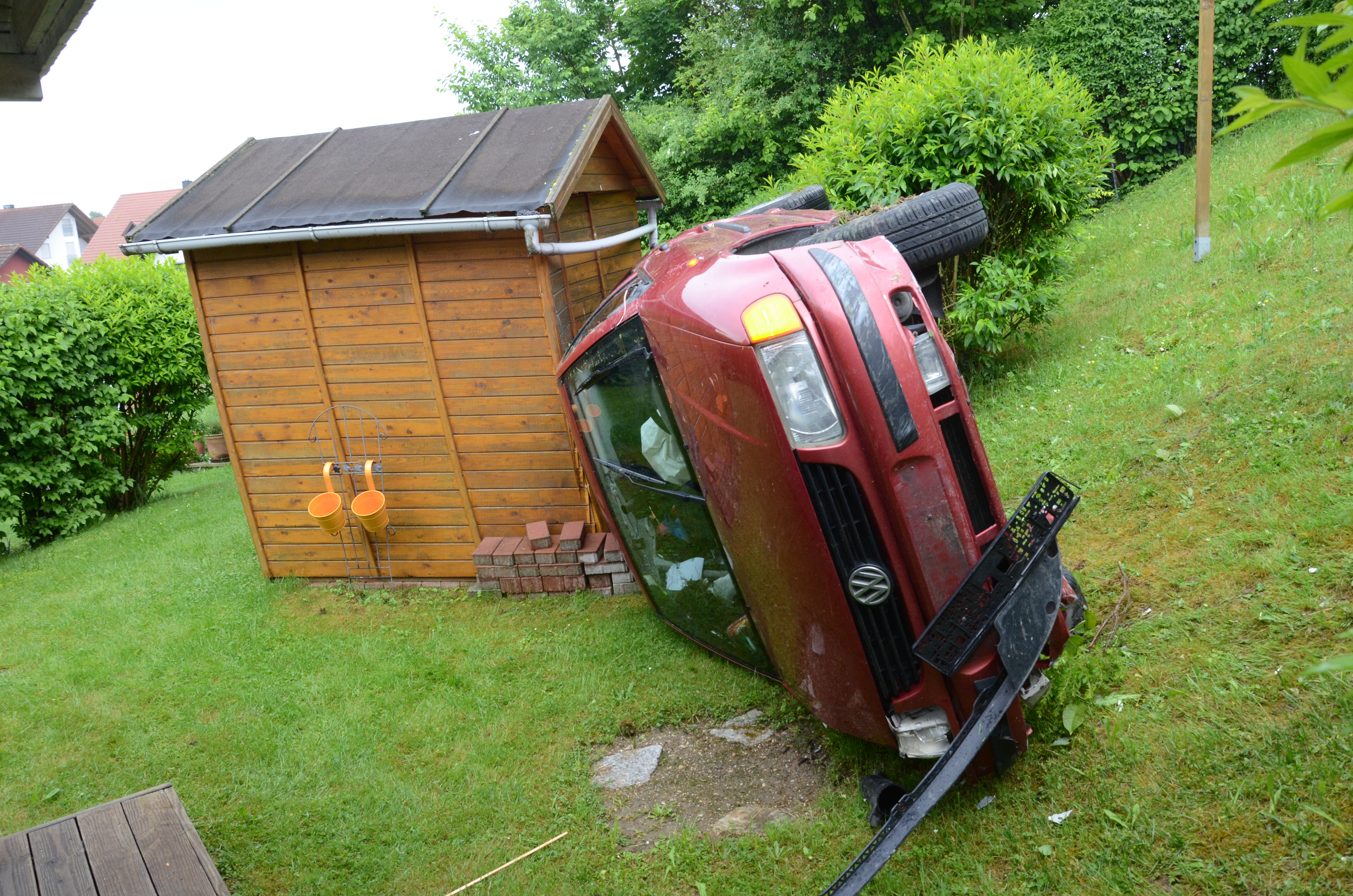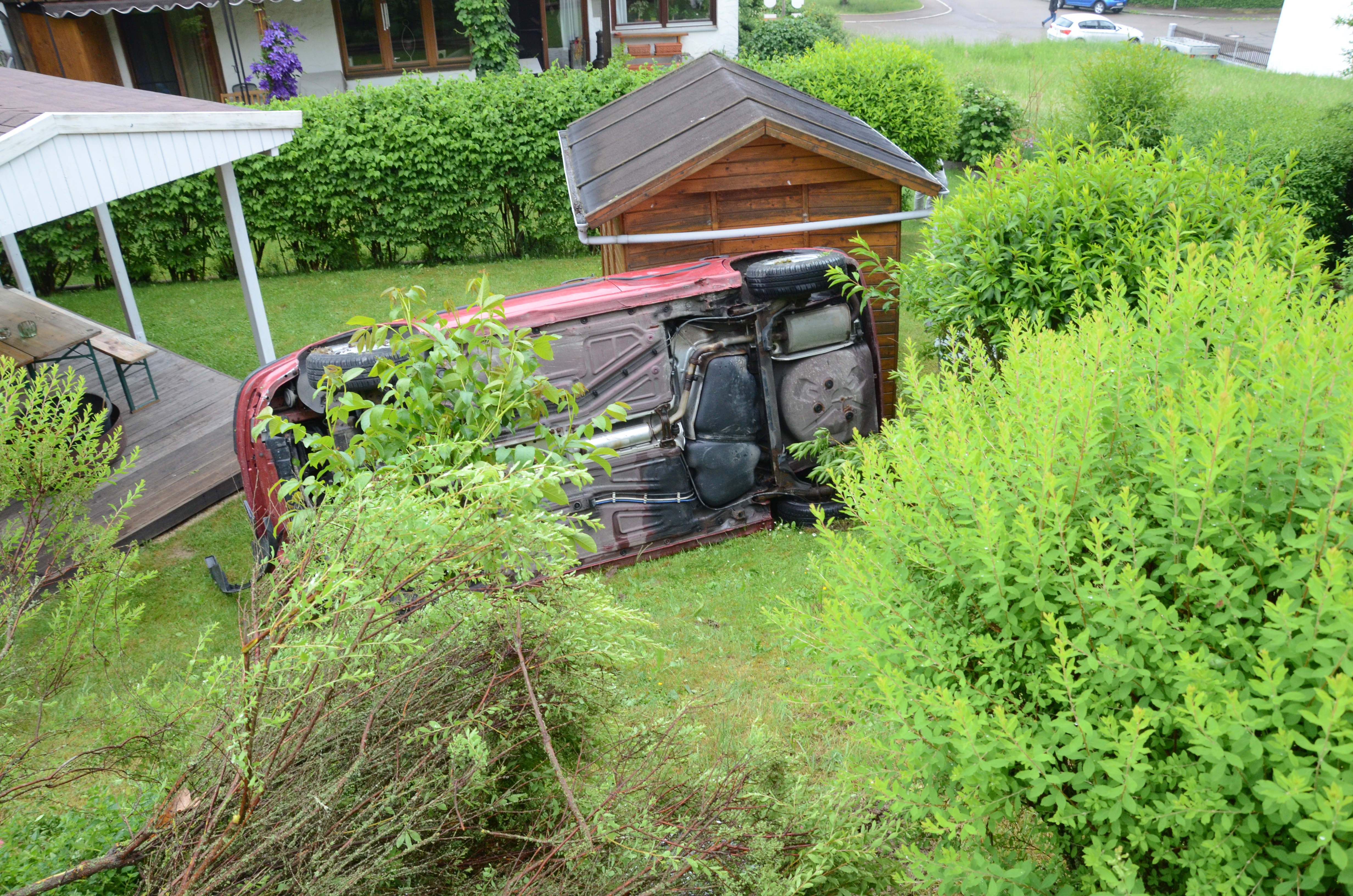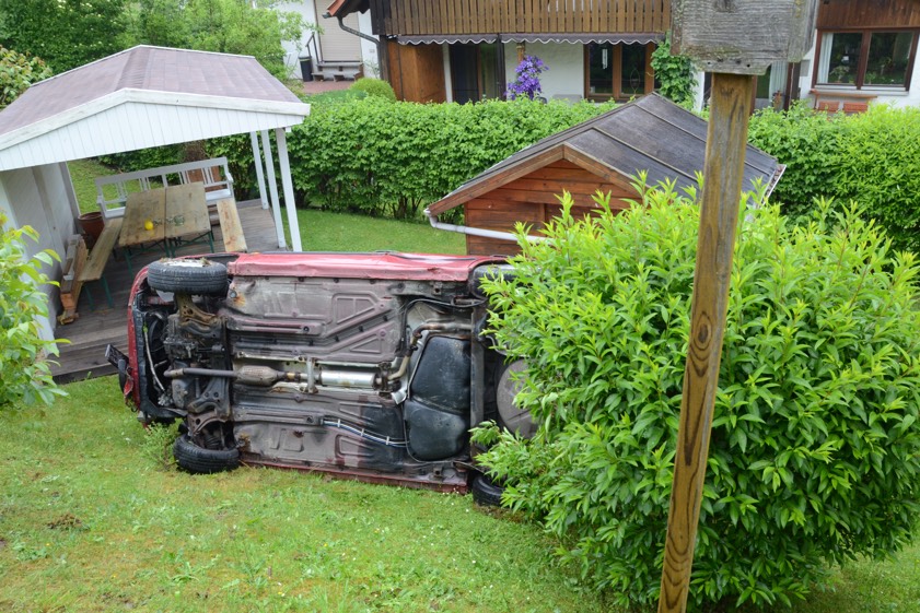 Der Wagen krachte zunächst gegen einen Lichtmasten, der dabei völlig demoliert wurde, durchbrach im Folgenden einen Gartenzaun und stürzte dann einen Hang hinab – in den mehrere Meter tiefer gelegenen Garten eines Wohnhauses. Nachdem sich das Auto dabei auch noch überschlagen hatte, blieb es letztlich seitlich an einem Gartenhäuschen liegen. Die kleine Holzhütte wurde durch den Aufprall um ungefähr 20 Zentimeter versetzt und dabei ebenfalls massiv beschädigt. Das Auto selbst dürfte nur mehr Schrottwert haben.