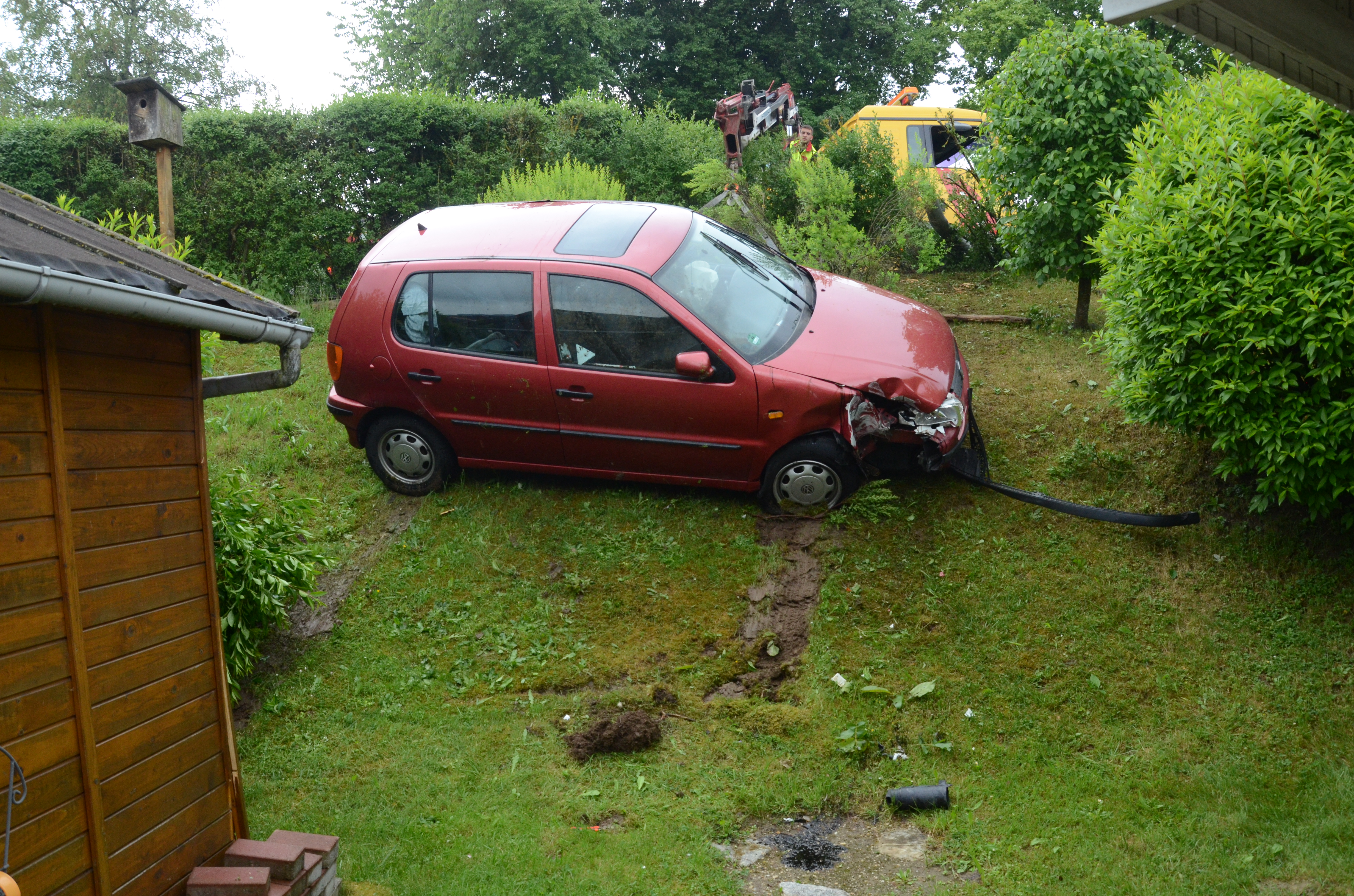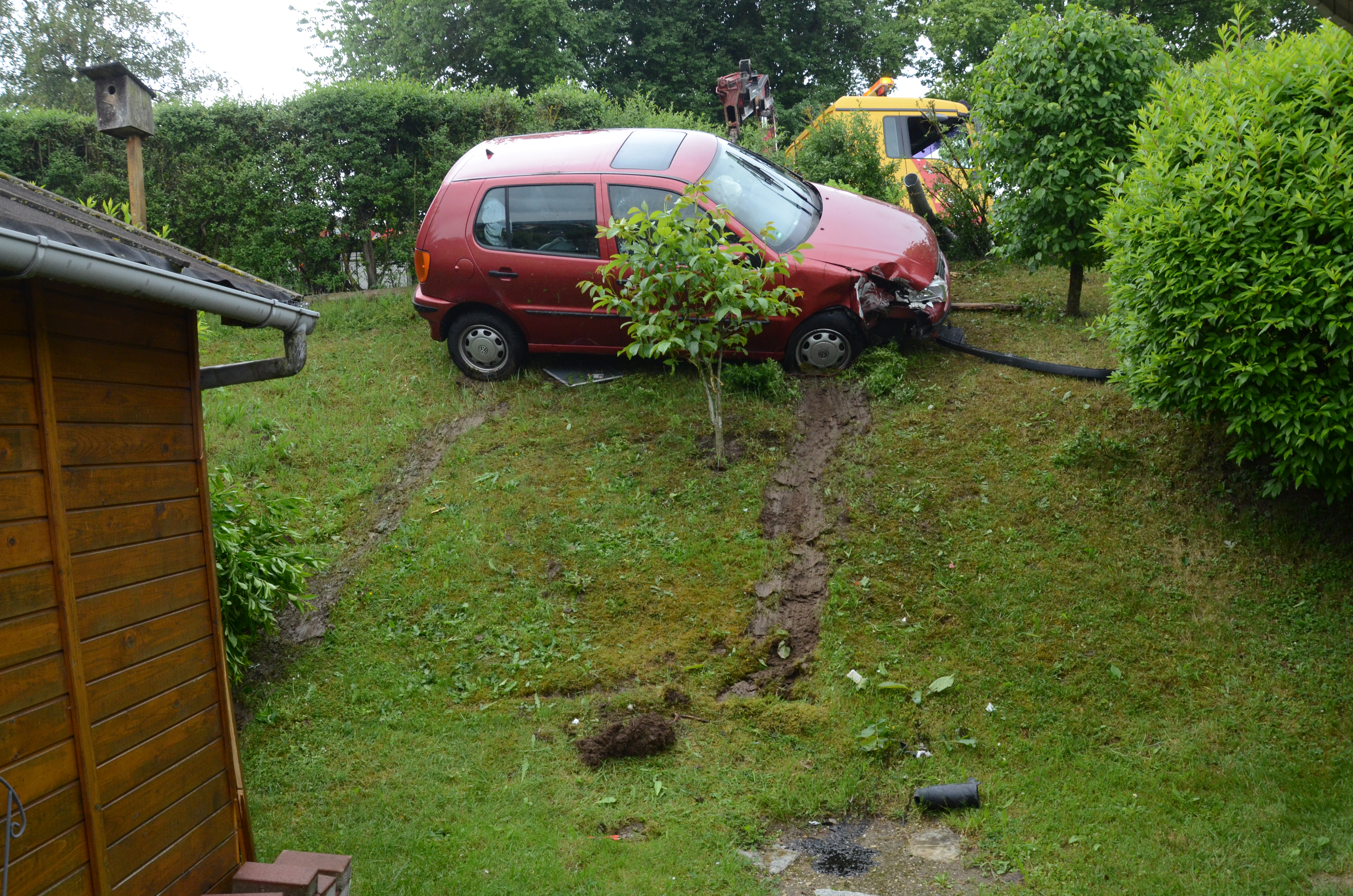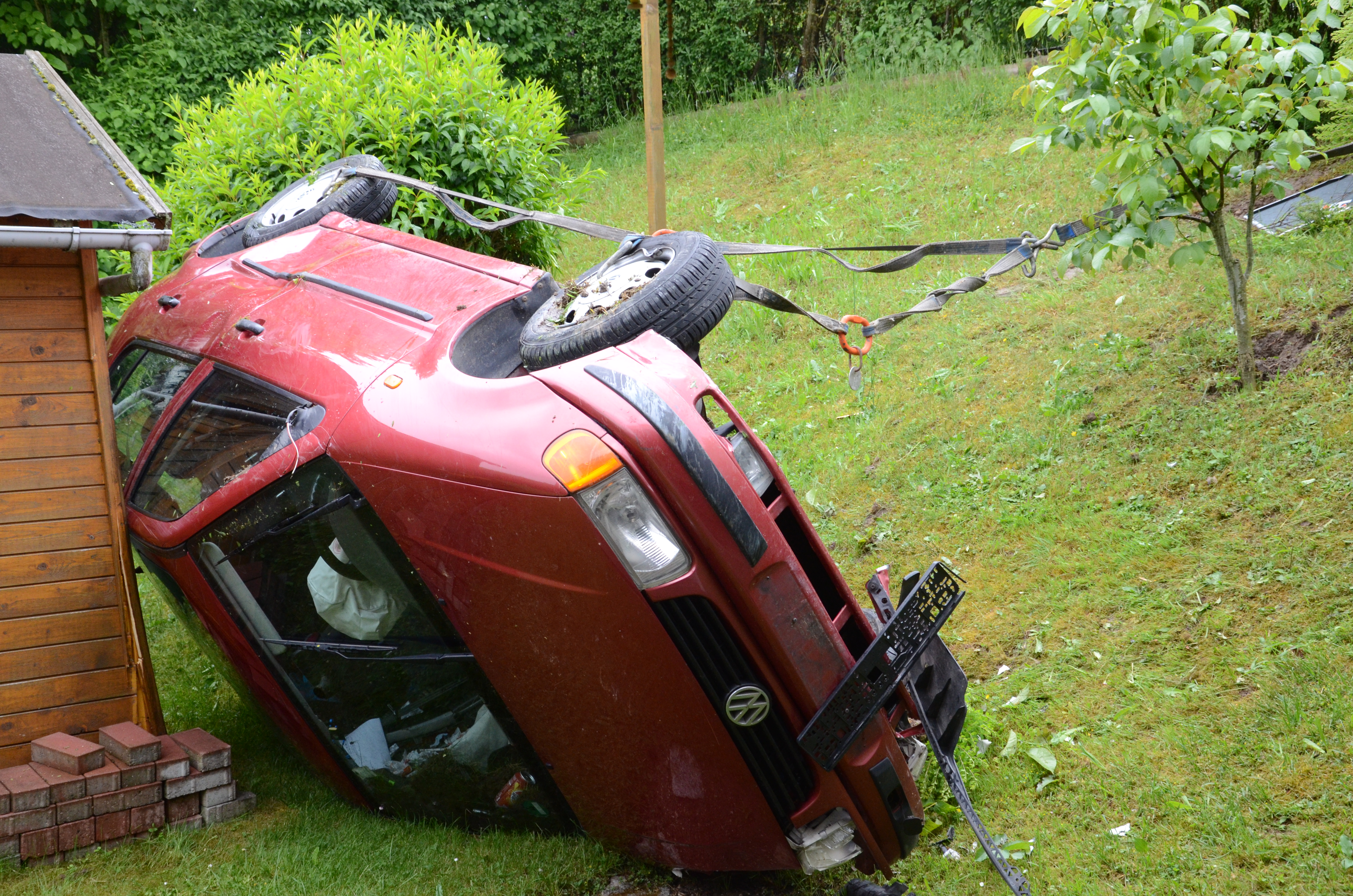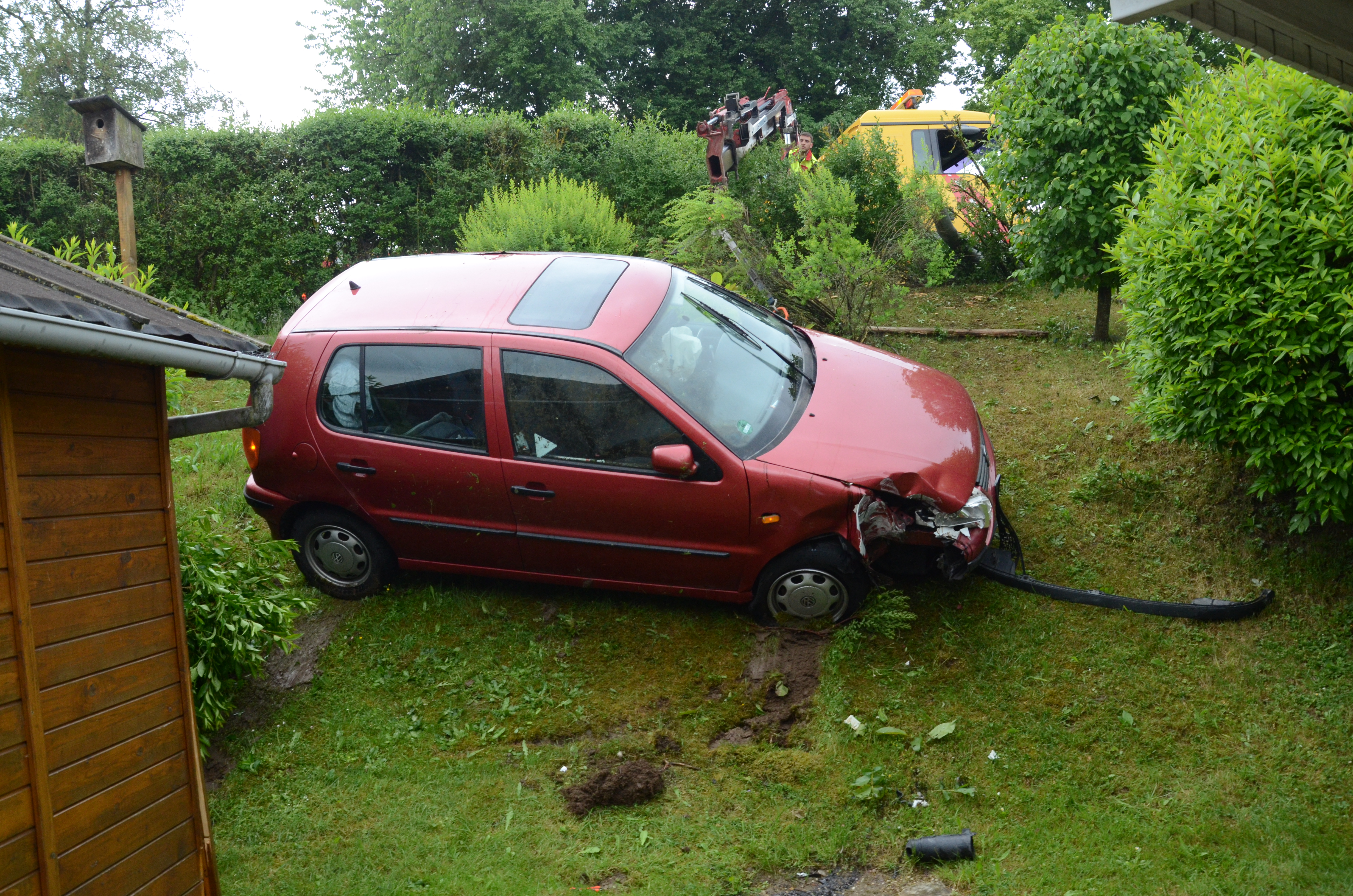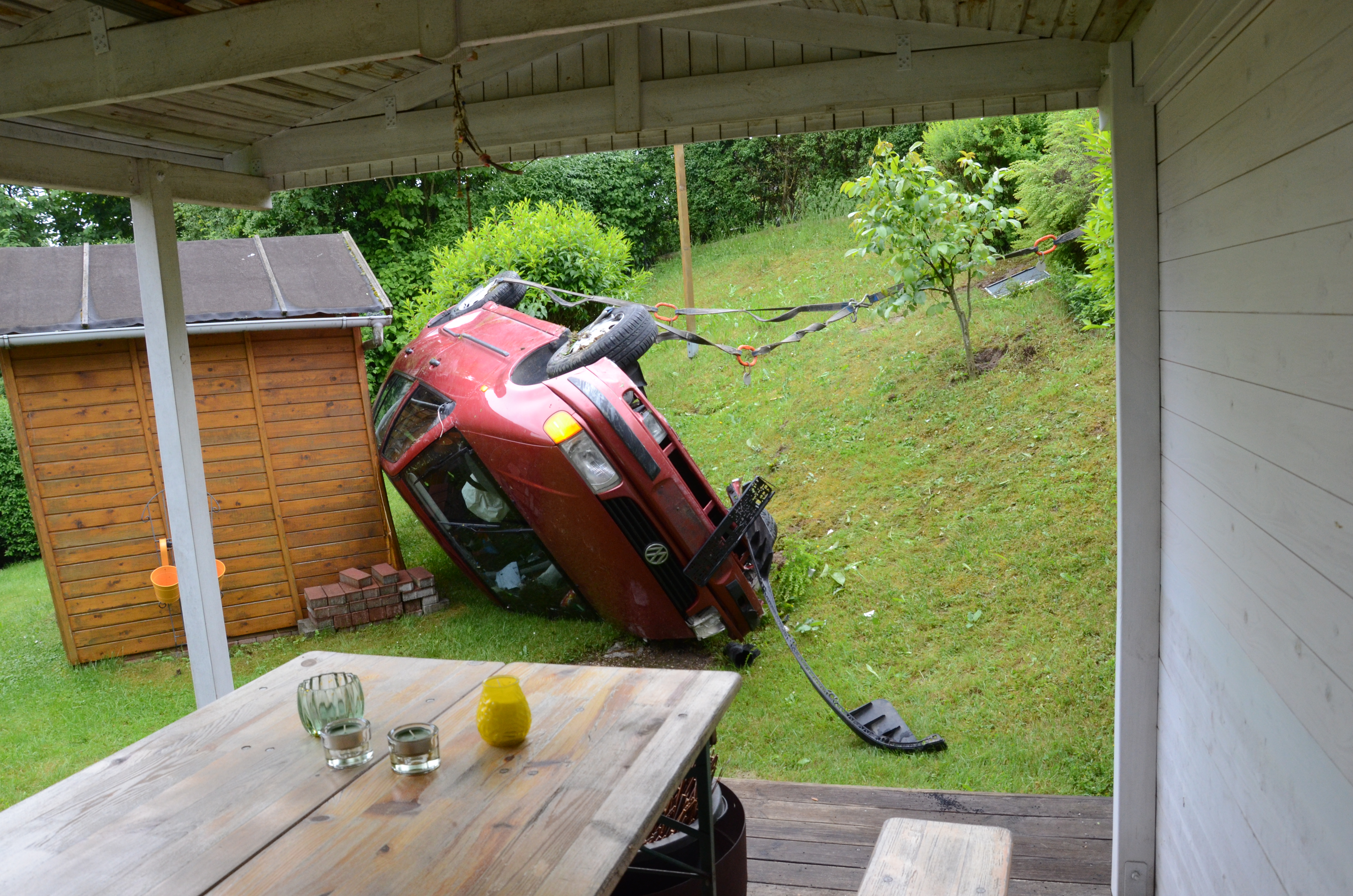 Der Wagen krachte zunächst gegen einen Lichtmasten, der dabei völlig demoliert wurde, durchbrach im Folgenden einen Gartenzaun und stürzte dann einen Hang hinab – in den mehrere Meter tiefer gelegenen Garten eines Wohnhauses. Nachdem sich das Auto dabei auch noch überschlagen hatte, blieb es letztlich seitlich an einem Gartenhäuschen liegen. Die kleine Holzhütte wurde durch den Aufprall um ungefähr 20 Zentimeter versetzt und dabei ebenfalls massiv beschädigt. Das Auto selbst dürfte nur mehr Schrottwert haben.