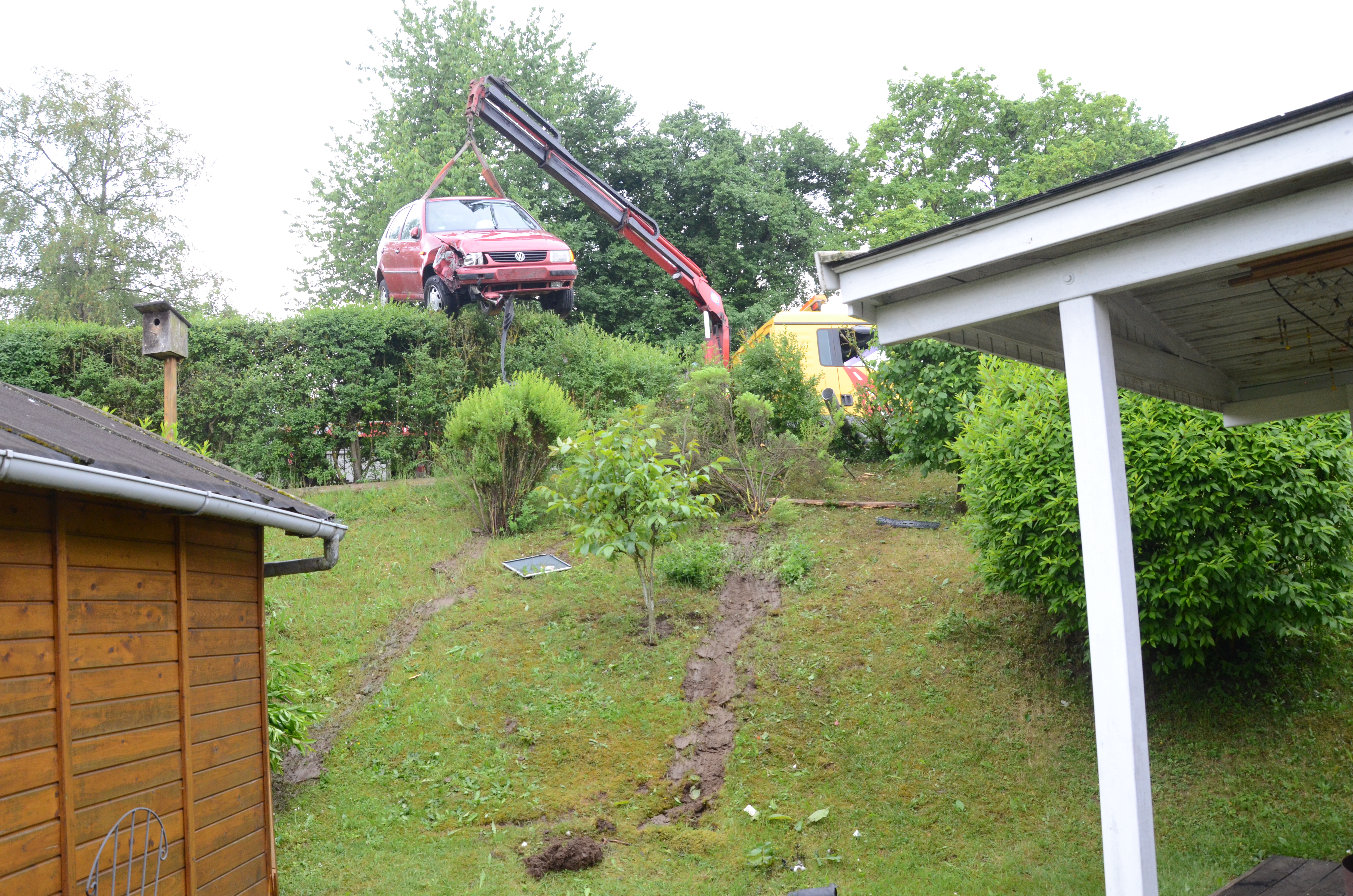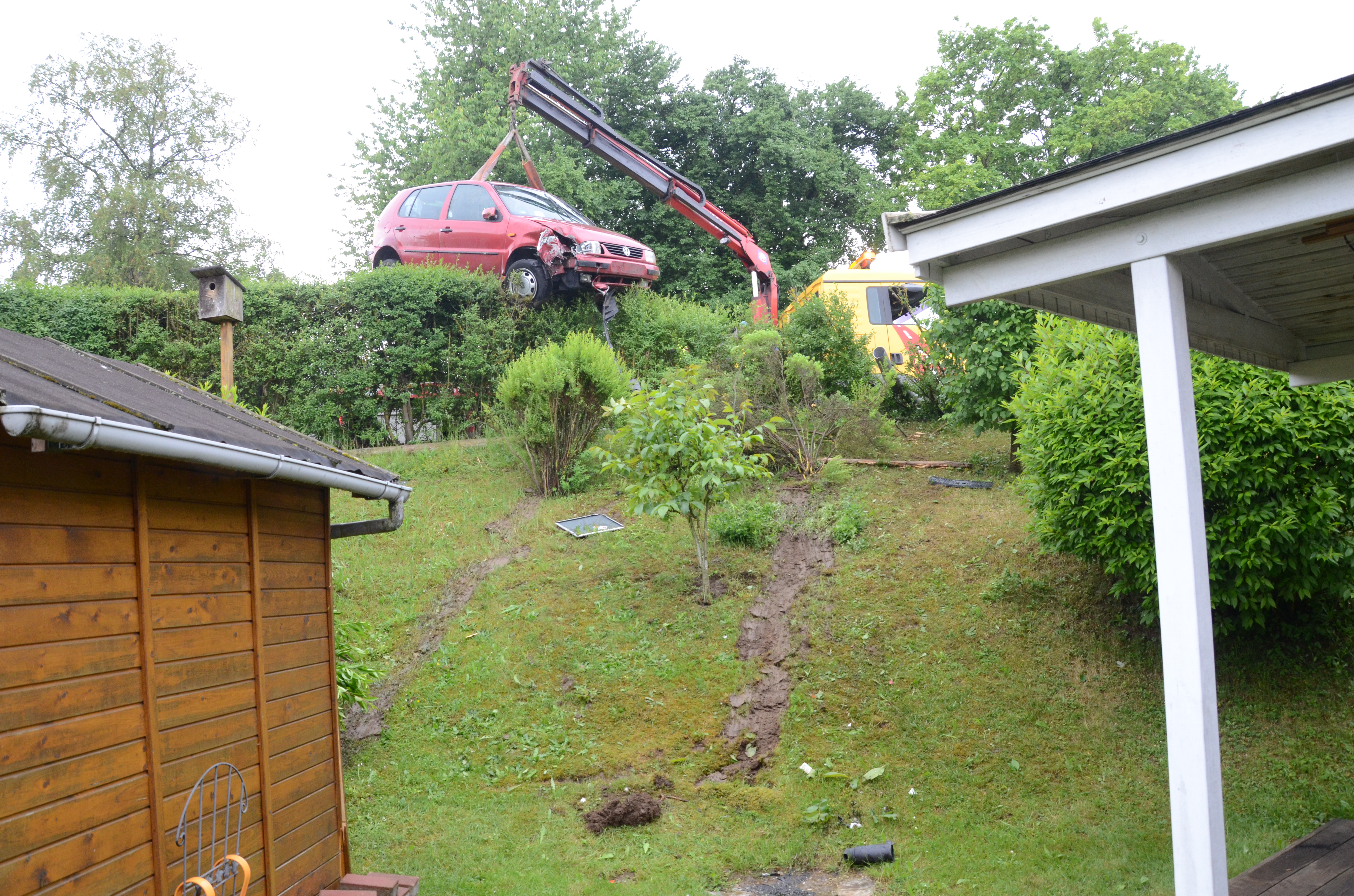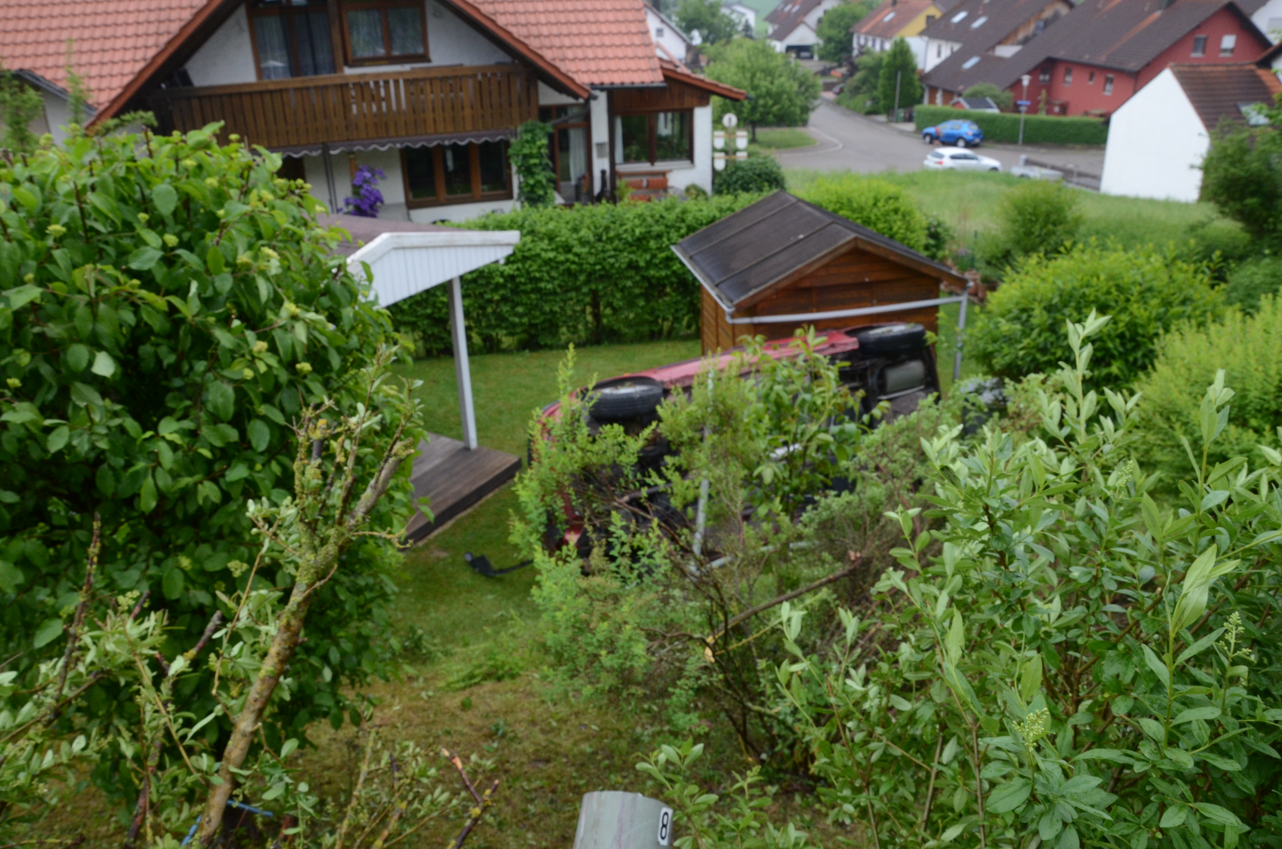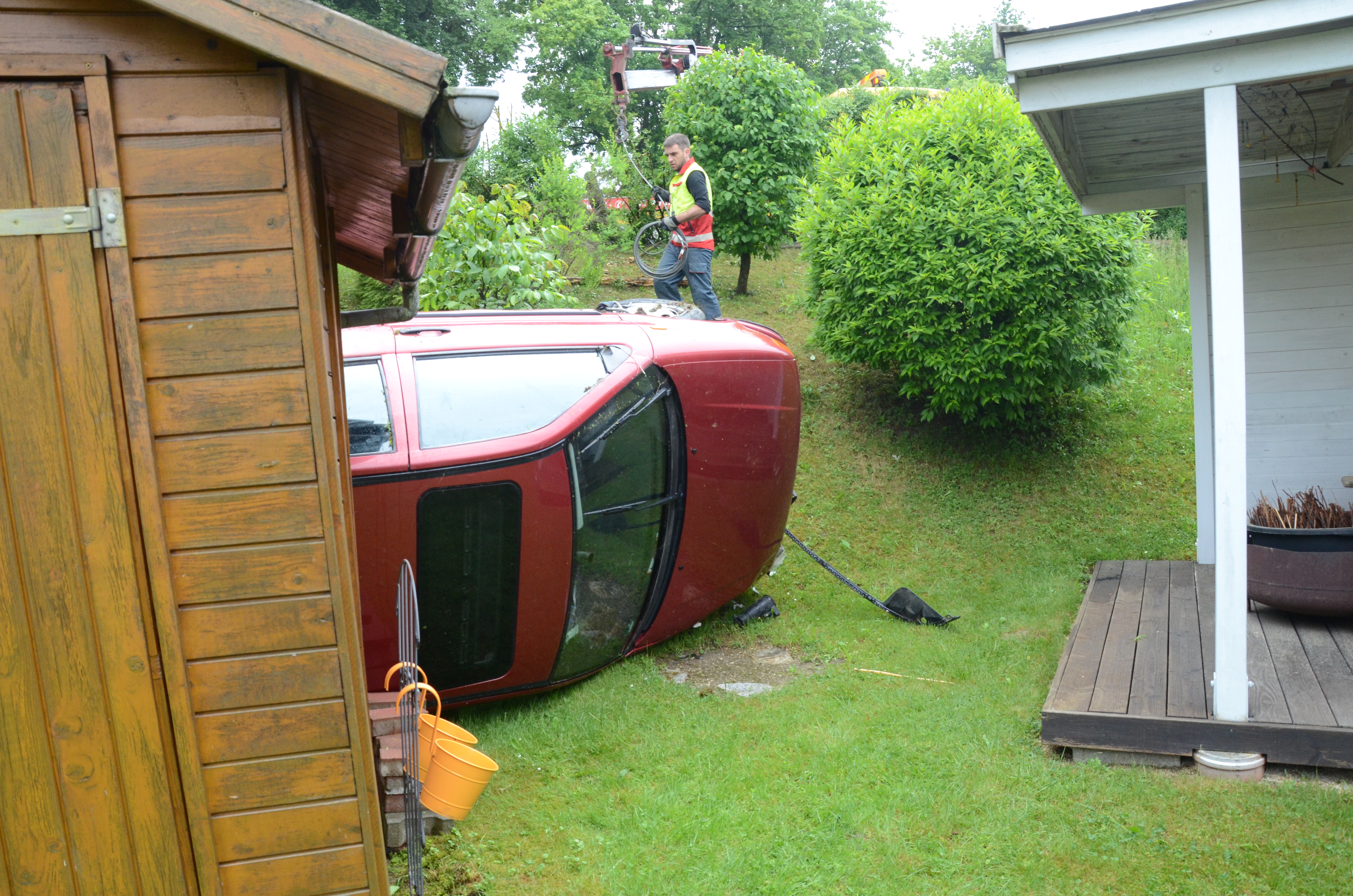 Der Wagen krachte zunächst gegen einen Lichtmasten, der dabei völlig demoliert wurde, durchbrach im Folgenden einen Gartenzaun und stürzte dann einen Hang hinab – in den mehrere Meter tiefer gelegenen Garten eines Wohnhauses. Nachdem sich das Auto dabei auch noch überschlagen hatte, blieb es letztlich seitlich an einem Gartenhäuschen liegen. Die kleine Holzhütte wurde durch den Aufprall um ungefähr 20 Zentimeter versetzt und dabei ebenfalls massiv beschädigt. Das Auto selbst dürfte nur mehr Schrottwert haben.