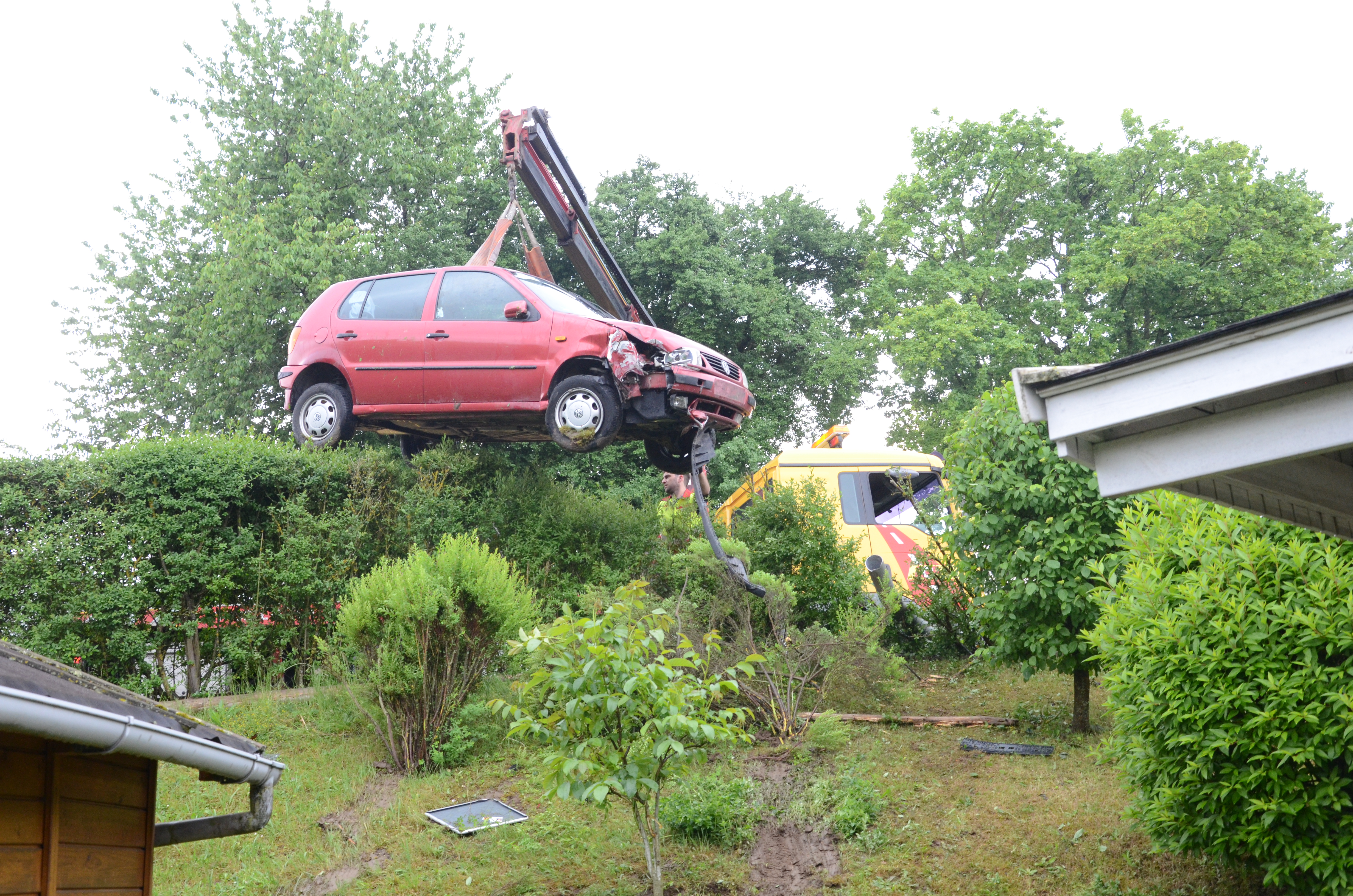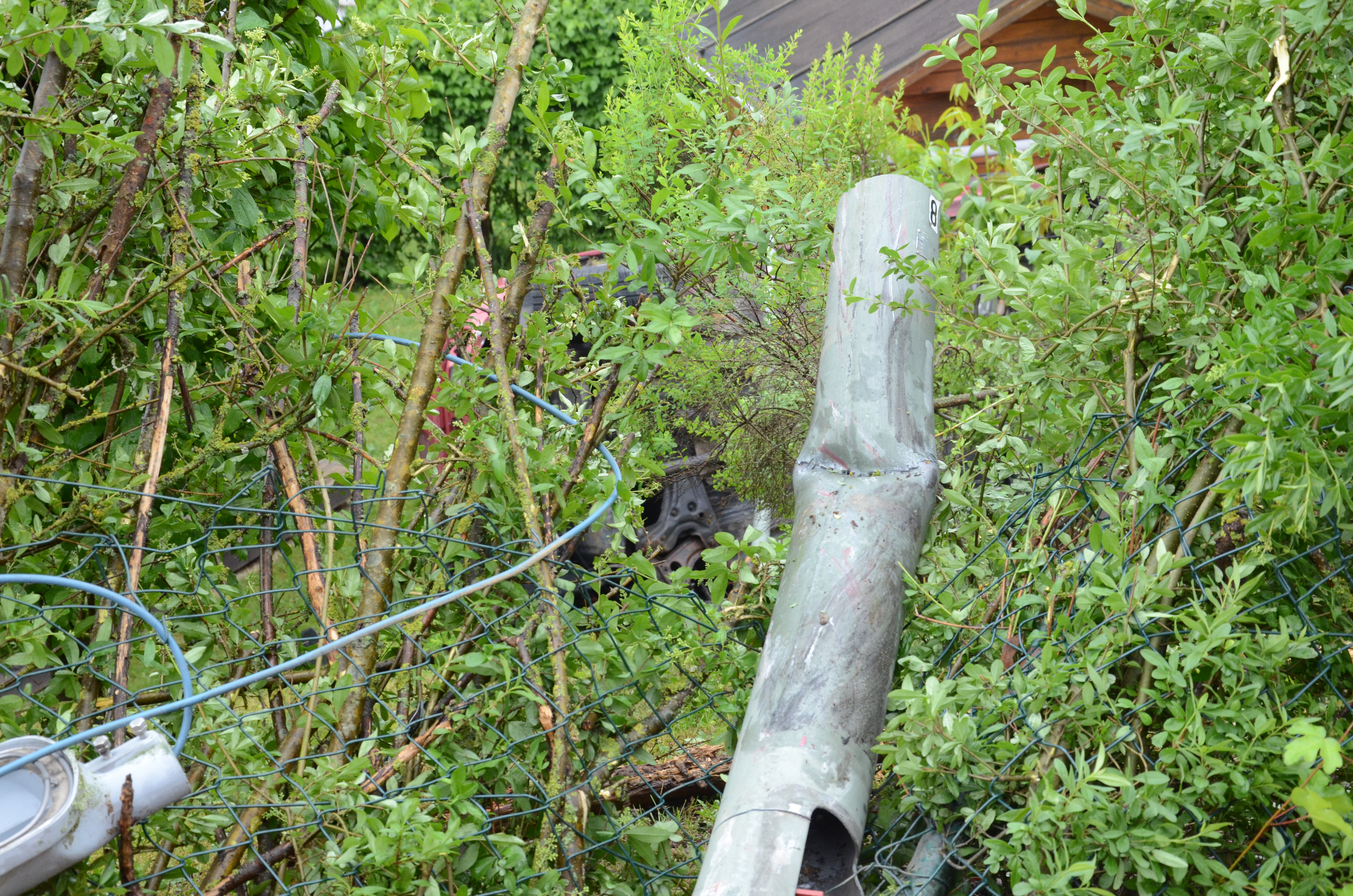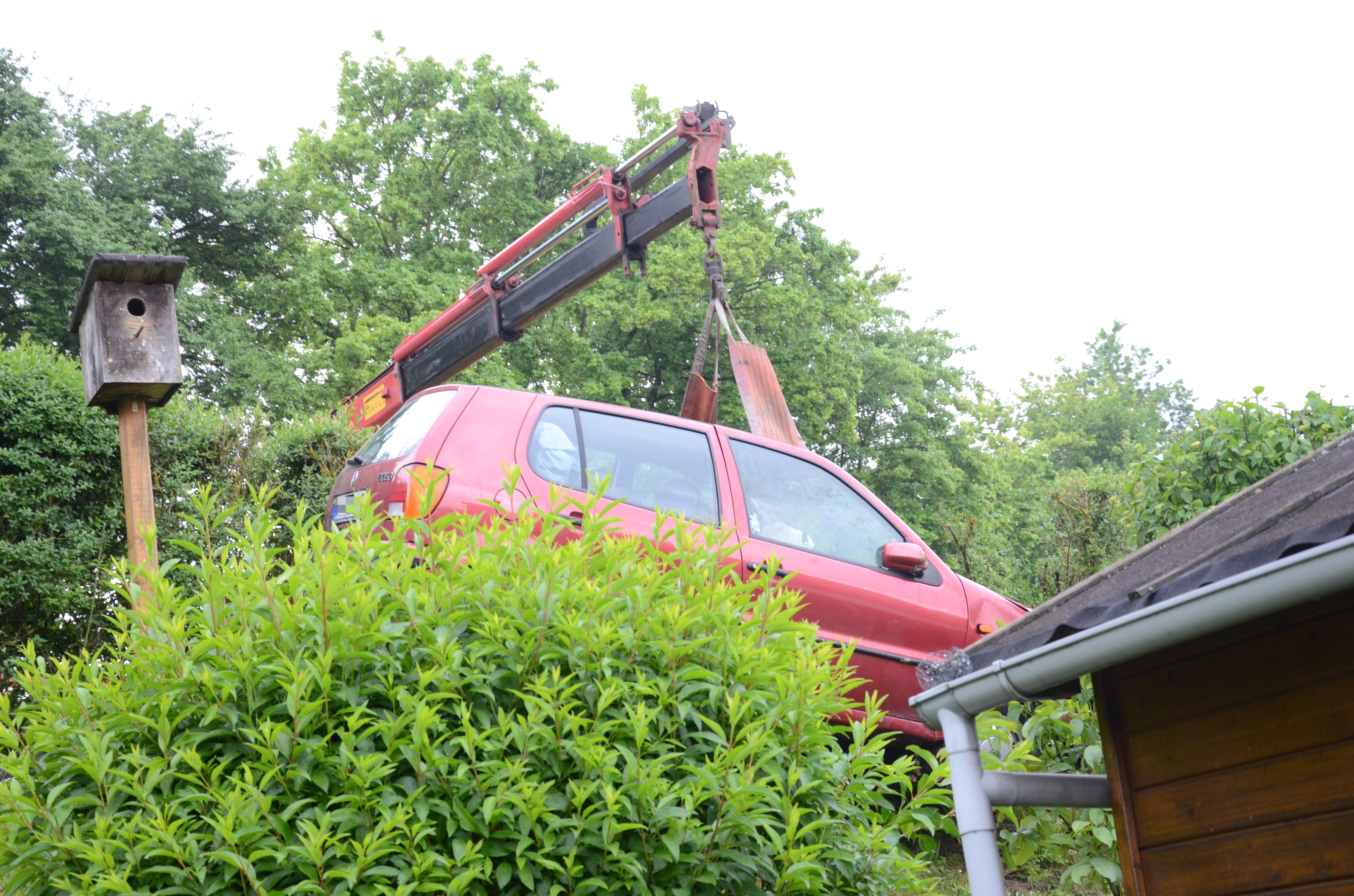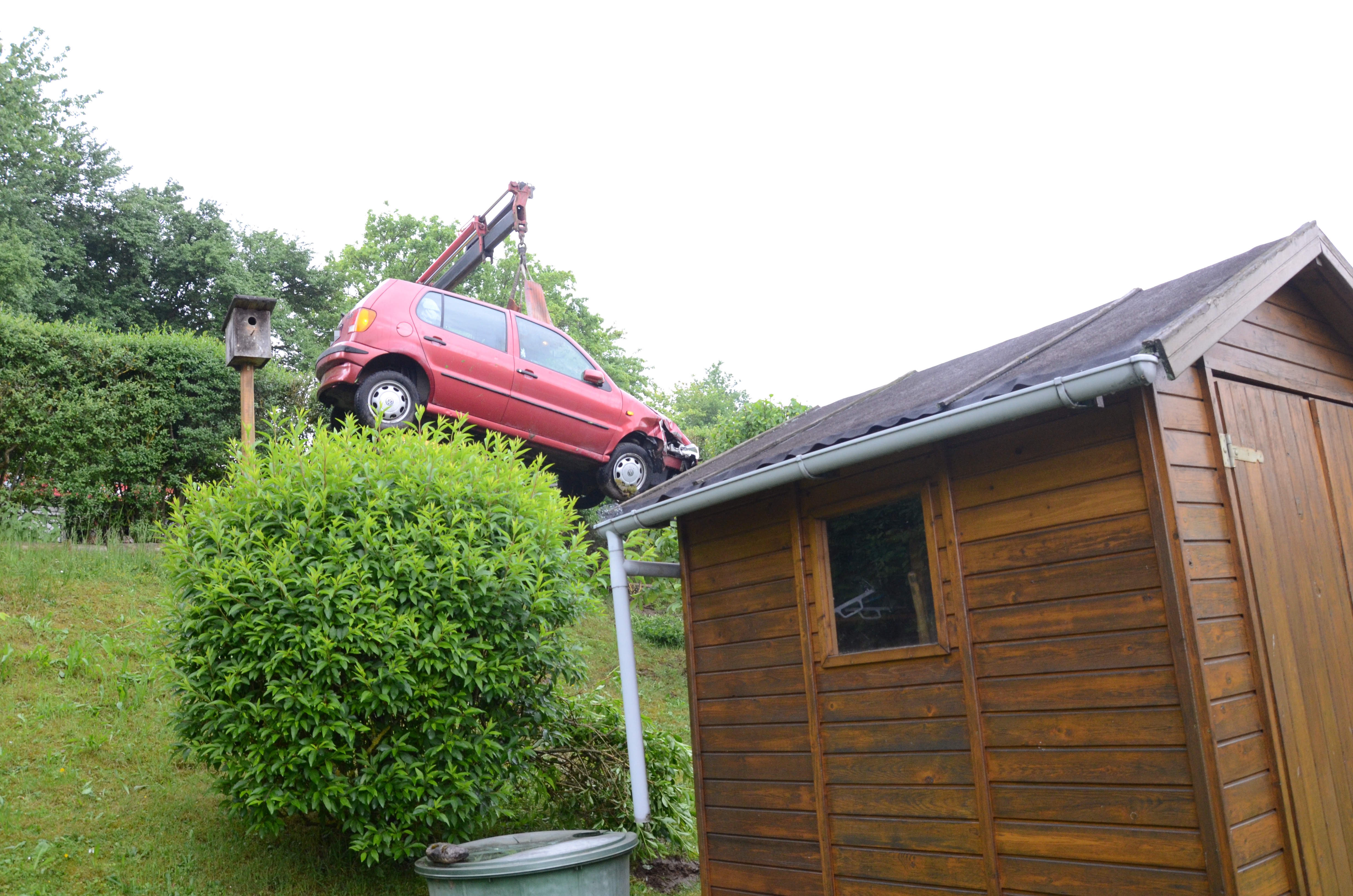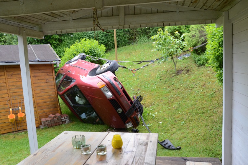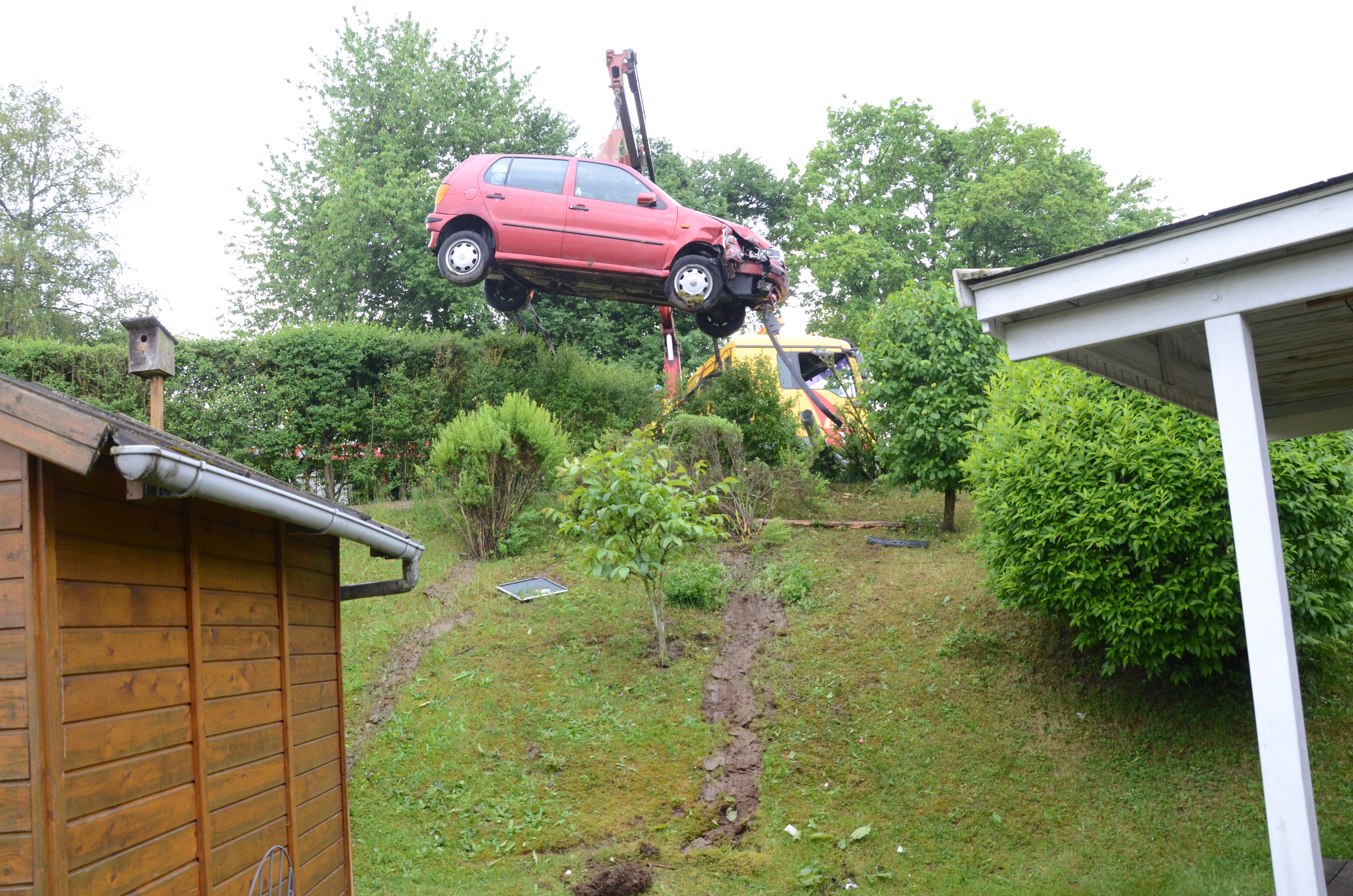 Der Wagen krachte zunächst gegen einen Lichtmasten, der dabei völlig demoliert wurde, durchbrach im Folgenden einen Gartenzaun und stürzte dann einen Hang hinab – in den mehrere Meter tiefer gelegenen Garten eines Wohnhauses. Nachdem sich das Auto dabei auch noch überschlagen hatte, blieb es letztlich seitlich an einem Gartenhäuschen liegen. Die kleine Holzhütte wurde durch den Aufprall um ungefähr 20 Zentimeter versetzt und dabei ebenfalls massiv beschädigt. Das Auto selbst dürfte nur mehr Schrottwert haben.
