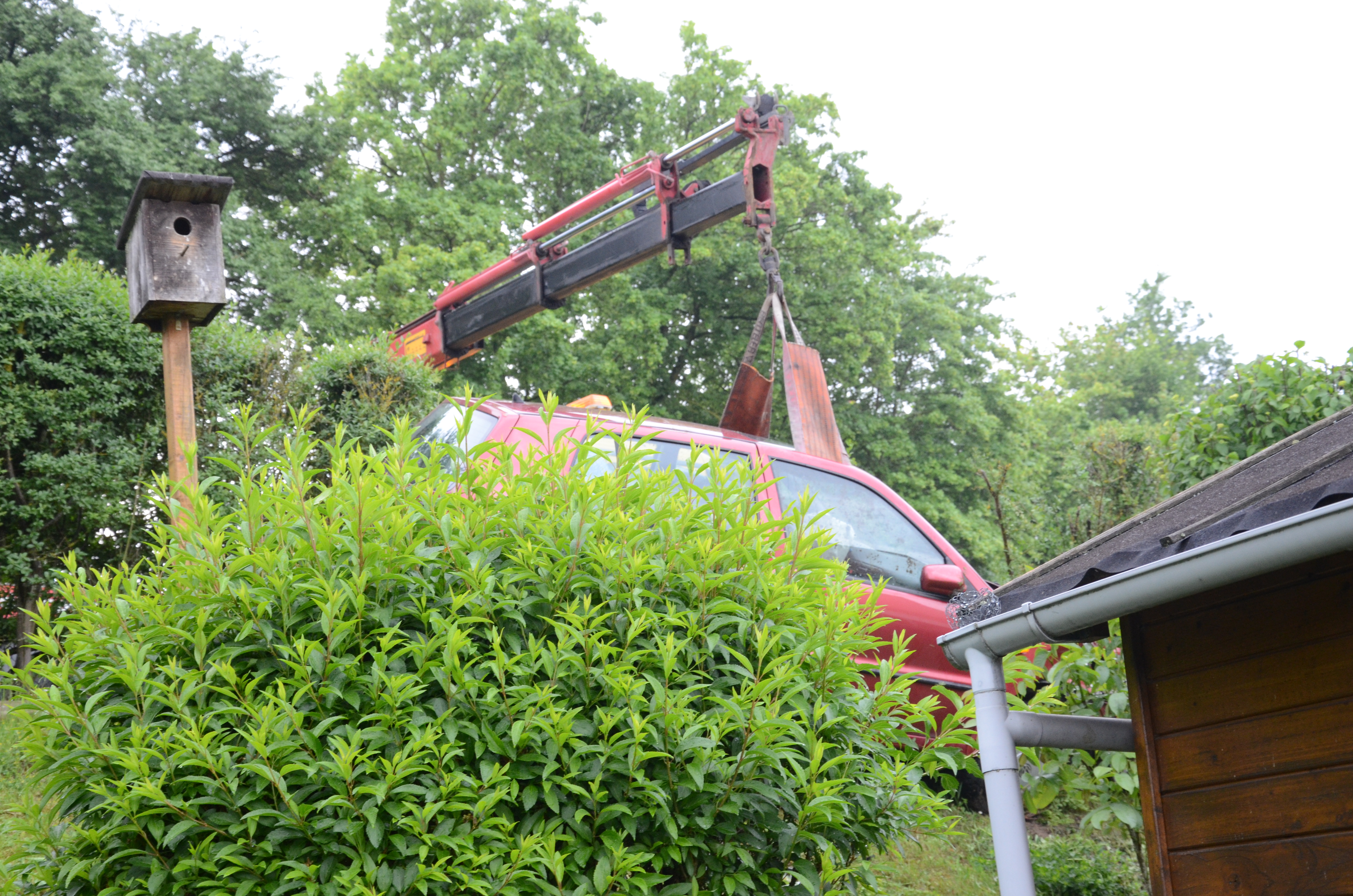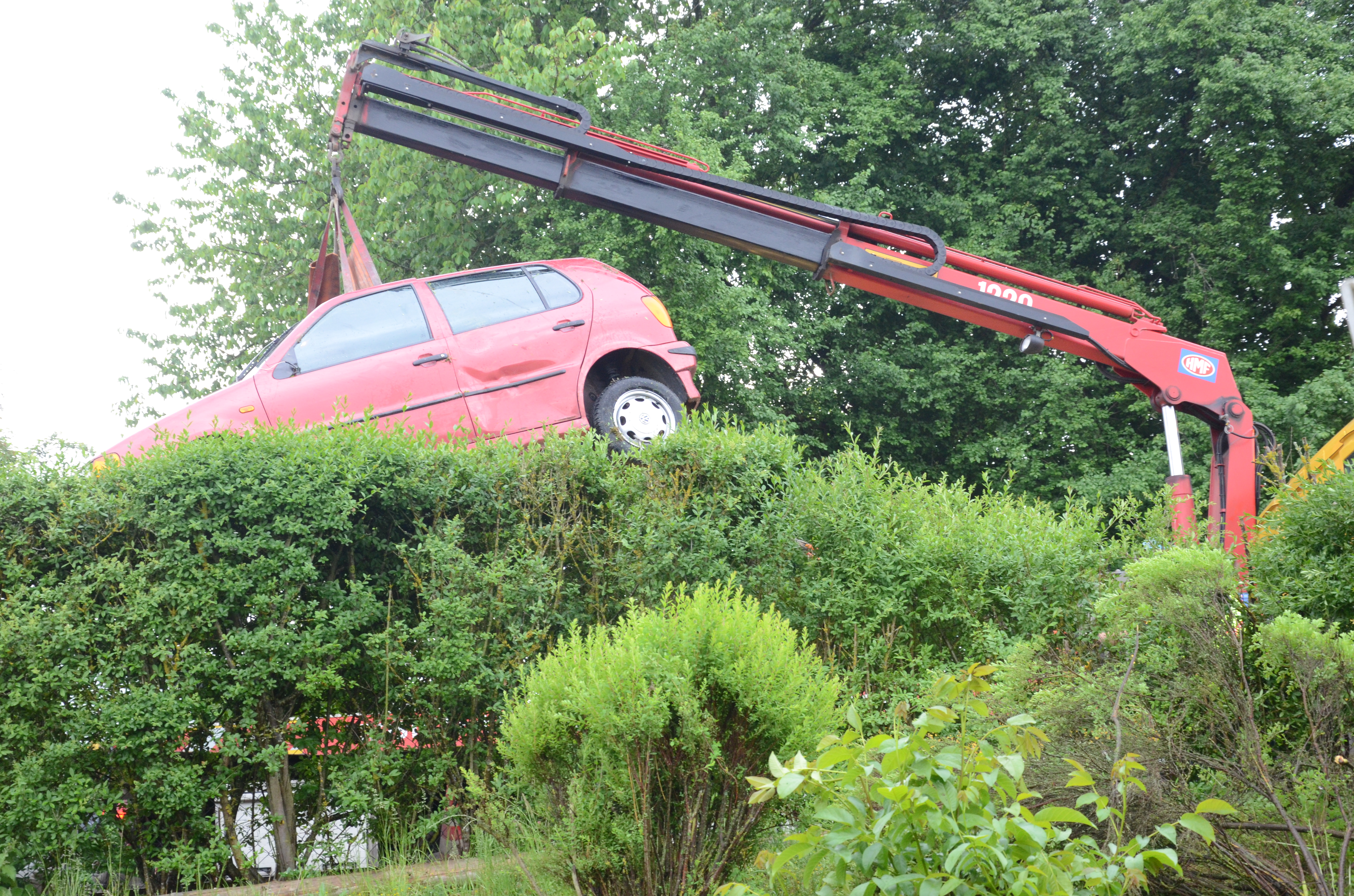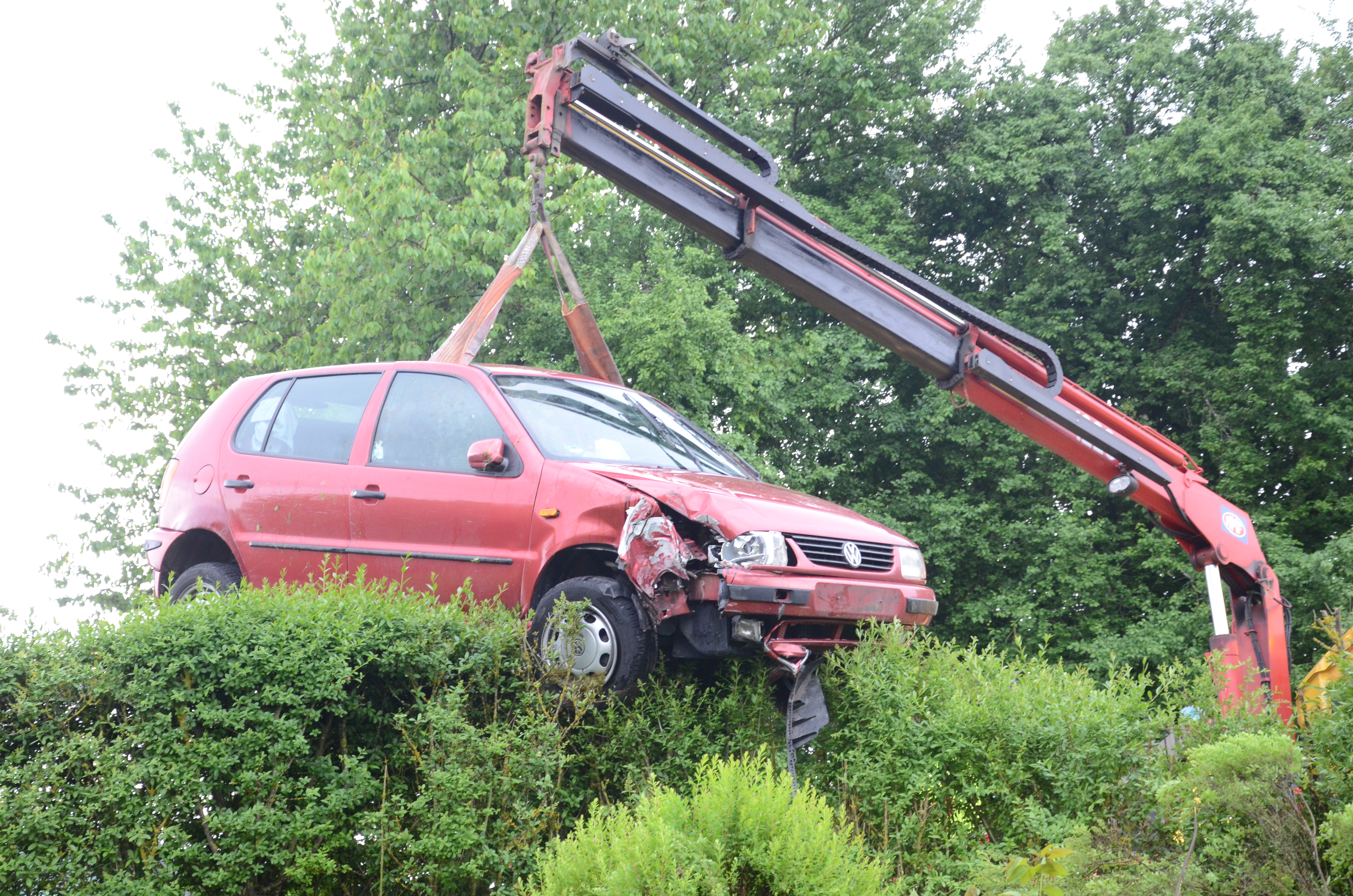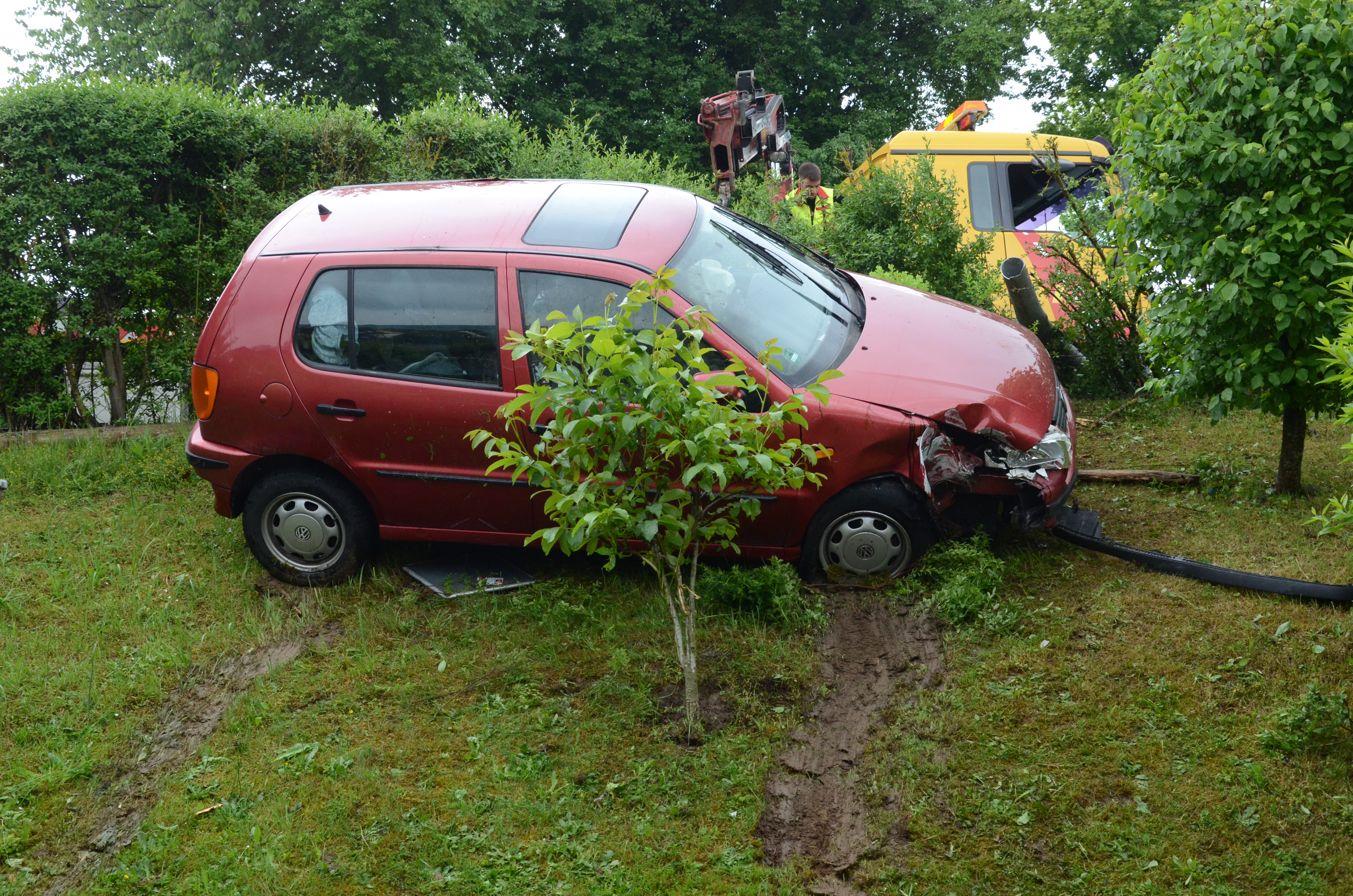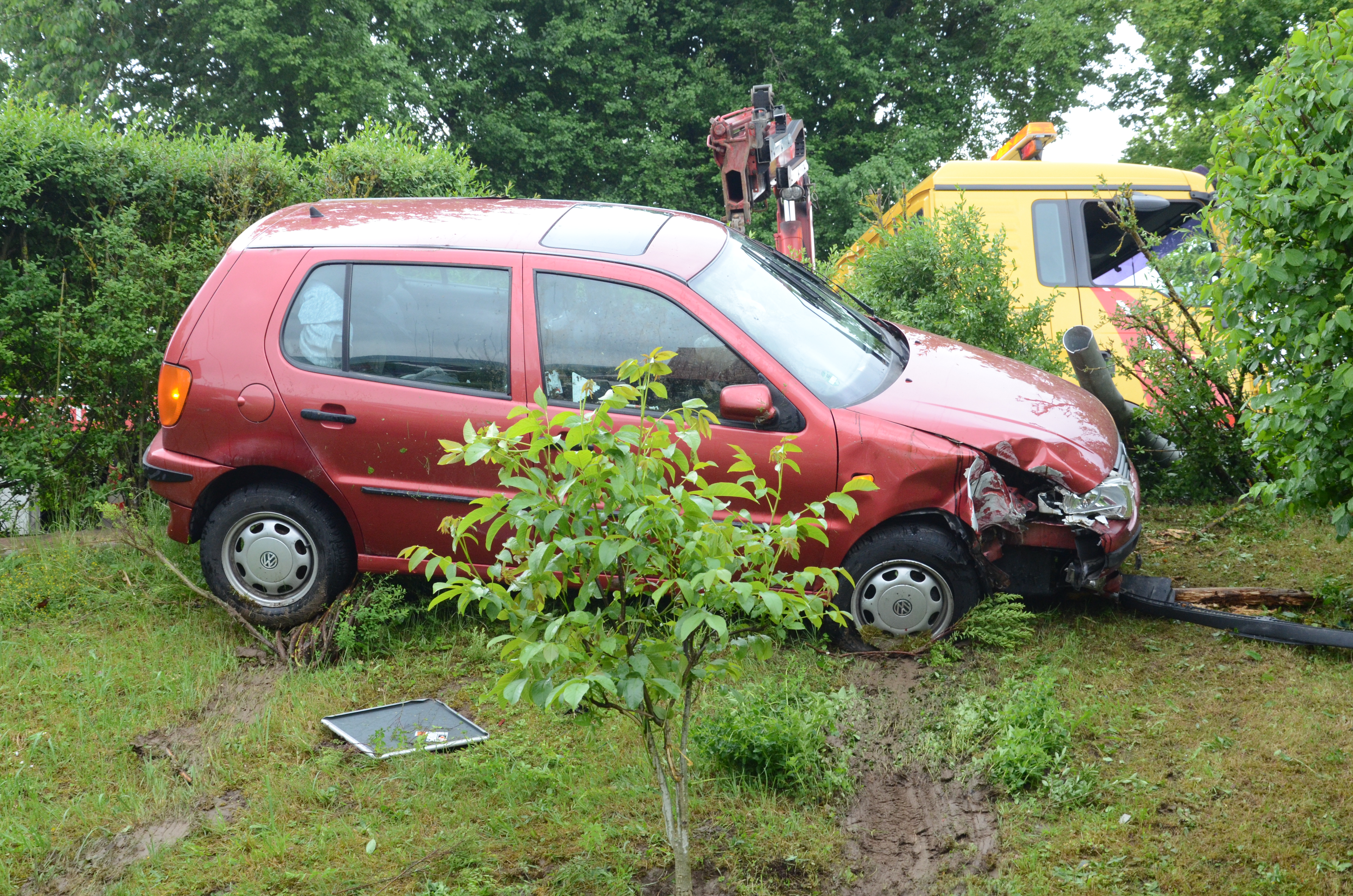 Der Wagen krachte zunächst gegen einen Lichtmasten, der dabei völlig demoliert wurde, durchbrach im Folgenden einen Gartenzaun und stürzte dann einen Hang hinab – in den mehrere Meter tiefer gelegenen Garten eines Wohnhauses. Nachdem sich das Auto dabei auch noch überschlagen hatte, blieb es letztlich seitlich an einem Gartenhäuschen liegen. Die kleine Holzhütte wurde durch den Aufprall um ungefähr 20 Zentimeter versetzt und dabei ebenfalls massiv beschädigt. Das Auto selbst dürfte nur mehr Schrottwert haben.