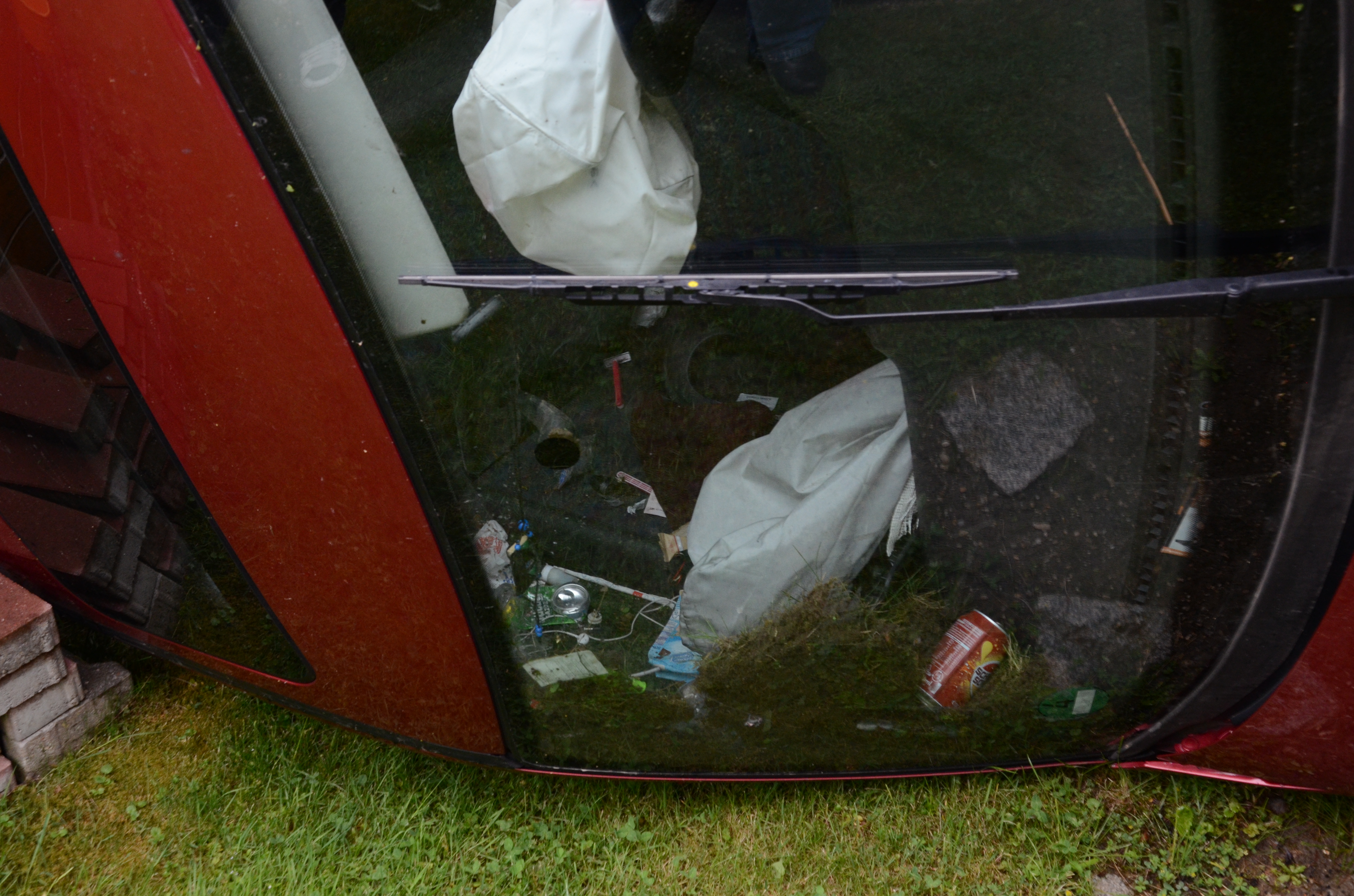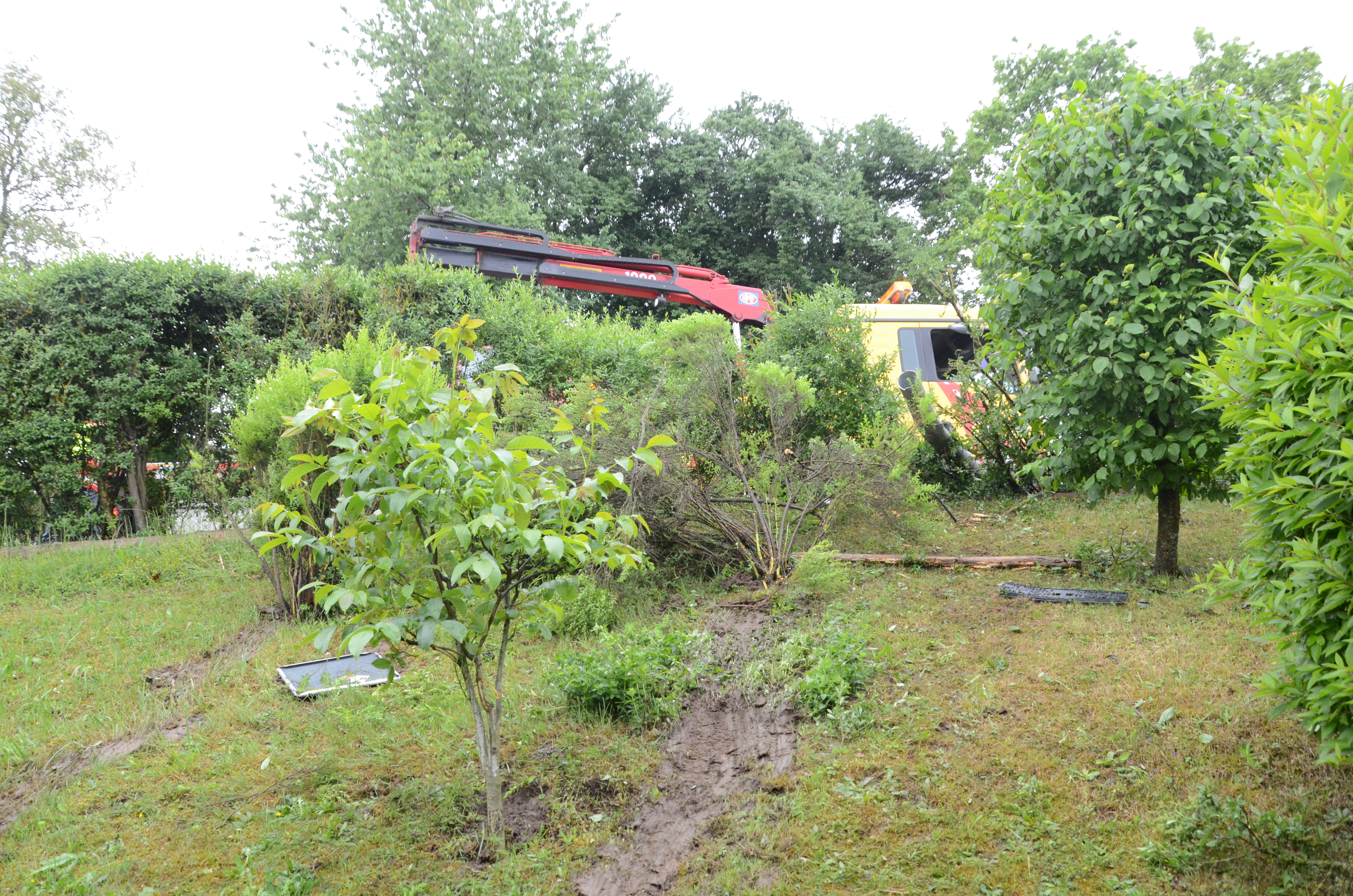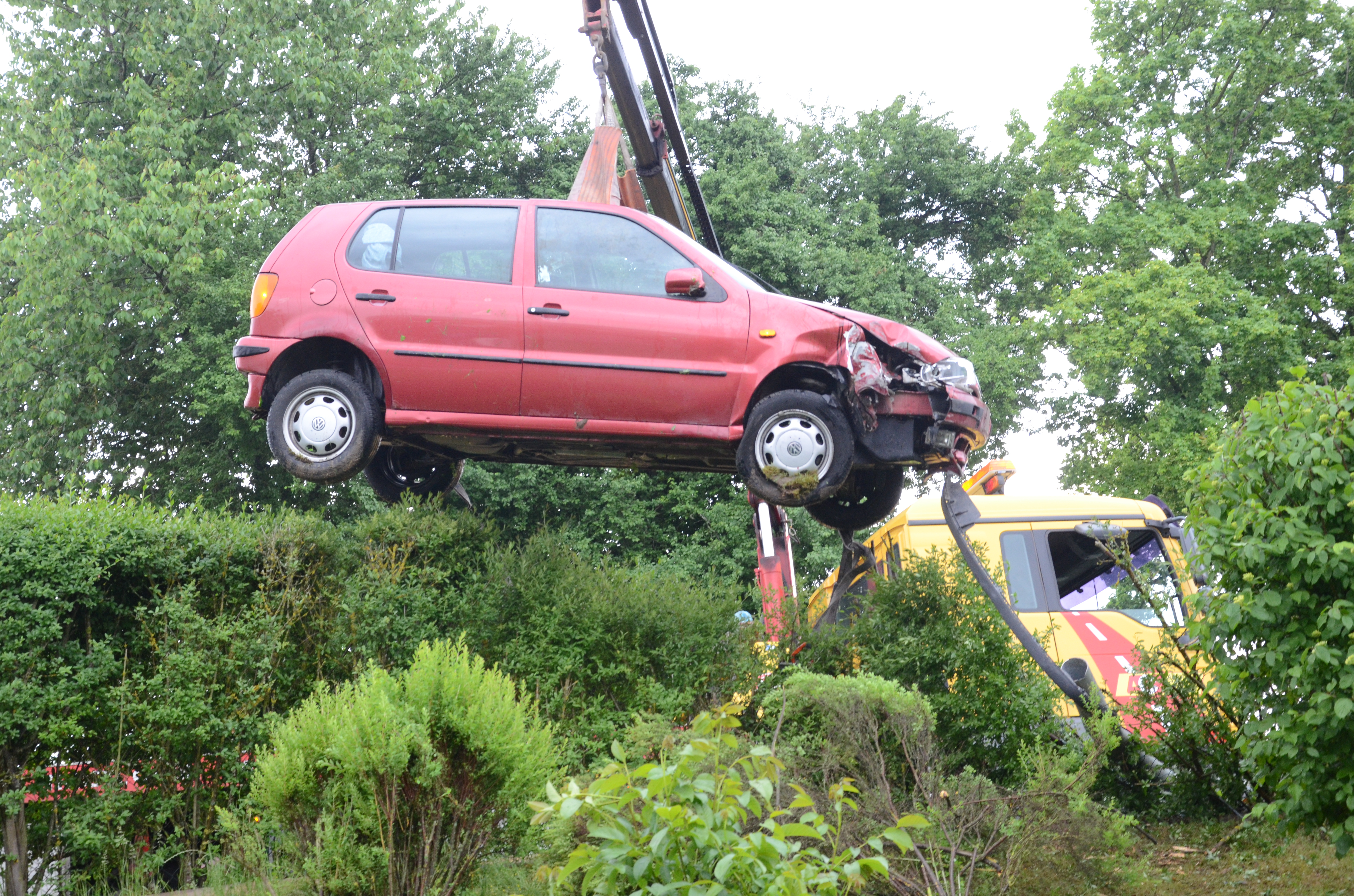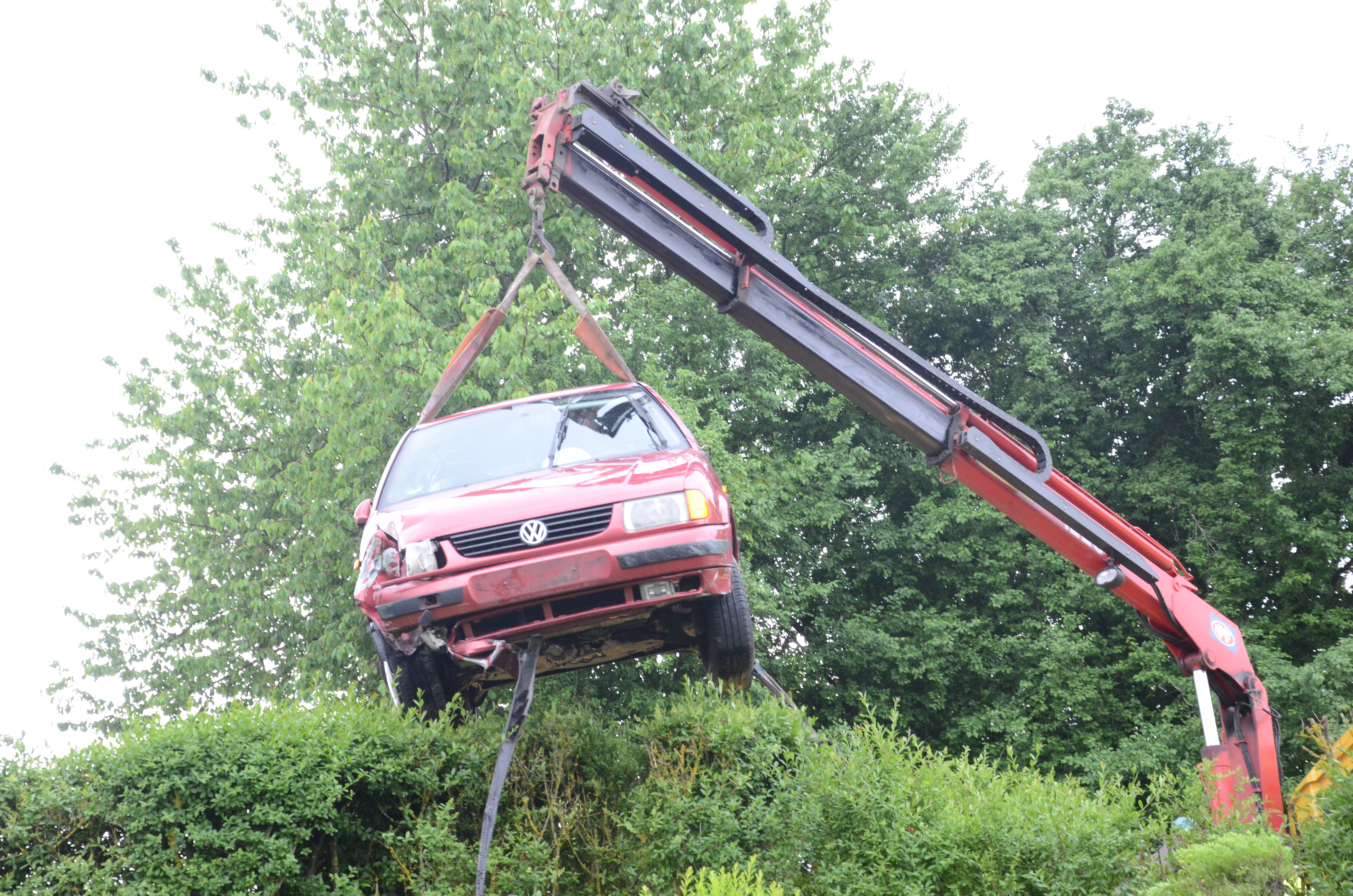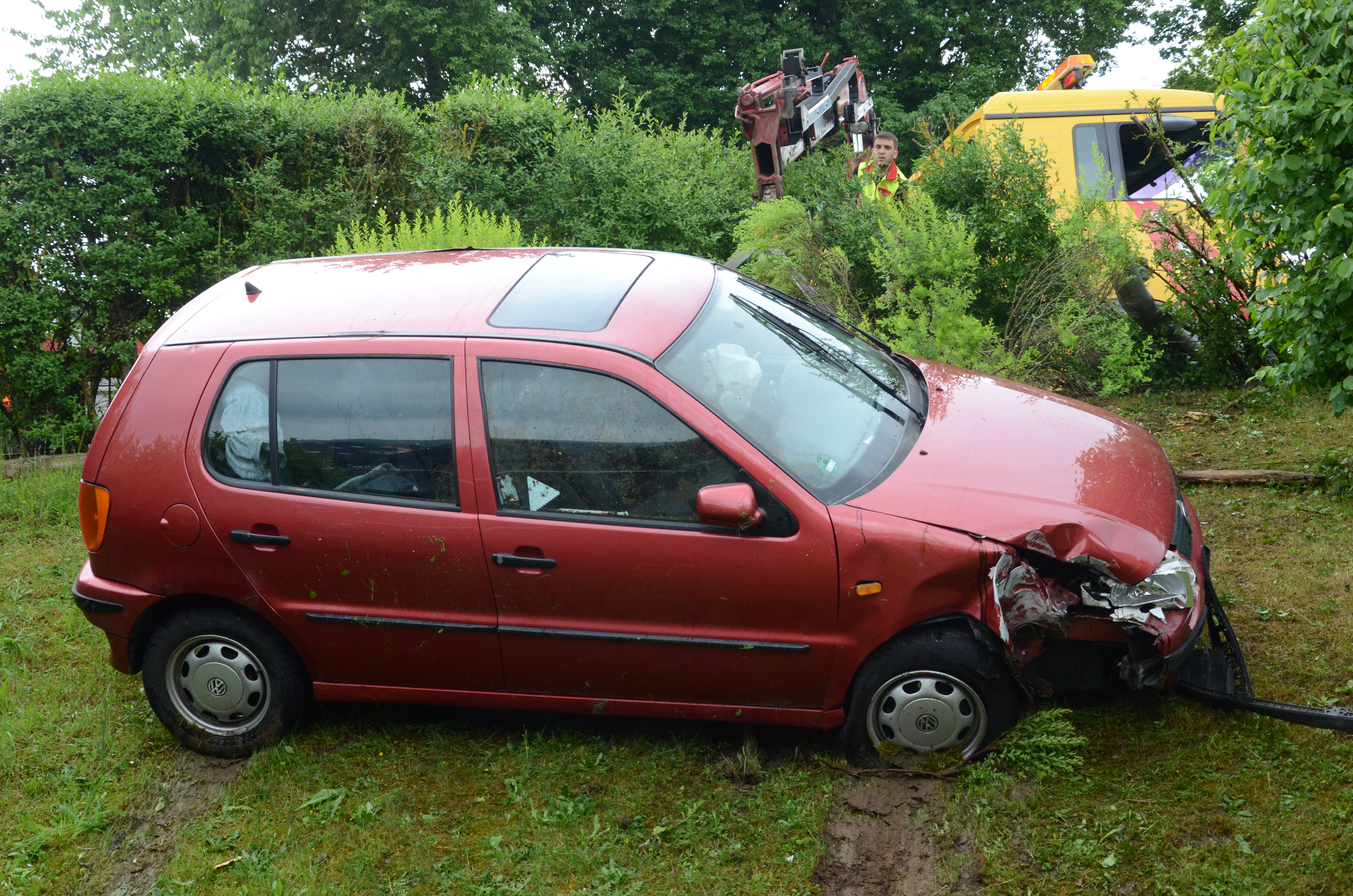 Der Wagen krachte zunächst gegen einen Lichtmasten, der dabei völlig demoliert wurde, durchbrach im Folgenden einen Gartenzaun und stürzte dann einen Hang hinab – in den mehrere Meter tiefer gelegenen Garten eines Wohnhauses. Nachdem sich das Auto dabei auch noch überschlagen hatte, blieb es letztlich seitlich an einem Gartenhäuschen liegen. Die kleine Holzhütte wurde durch den Aufprall um ungefähr 20 Zentimeter versetzt und dabei ebenfalls massiv beschädigt. Das Auto selbst dürfte nur mehr Schrottwert haben.