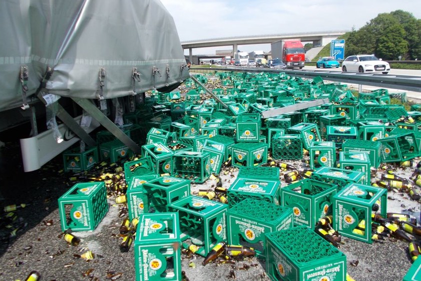 Im Bereich des Autobahn-Kreuzes Neufahrn kam es wegen dieses zweiten Unfalls am heutigen Nachmittag zu erheblichen Verkehrs-Behinderungen. Der Grund lag in der nötigen Vollsperrung der Überleitung von der A9 in Fahrtrichtung München auf die A92 in Richtung Unterschleißheim. Die Überleitung musste wegen der verlorenen Ladung in Form von jeder Menge gefüllten Bierkisten dicht gemacht werden. Ein Sattelzug, beladen mit insgesamt mehr als 30 Paletten Gerstensaft-Kisten, hatte nach Angaben der Freisinger Verkehrspolizei gegen 14.40 Uhr – in der Rechtskurve der Überleitung – zirka vier Paletten seiner fragilen Ladung verloren.