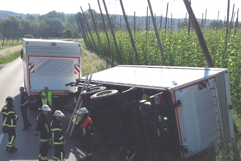 An dem Lastwagen-Gespann wurde lediglich der Anhänger ramponiert, da das Zugfahrzeug stehen geblieben war (siehe Foto). Der Schaden an dem Gespann wurde auf insgesamt zirka 20 000 Euro beziffert, auch an der Ware sei „erheblicher Schaden“ entstanden. Obendrein sind nach Angaben der Polizei auch der Hopfengarten und das Bankett in Mitleidenschaft gezogen worden. Zum Glück war der Lkw-Fahrer mit dem Schrecken davongekommen und unverletzt geblieben.