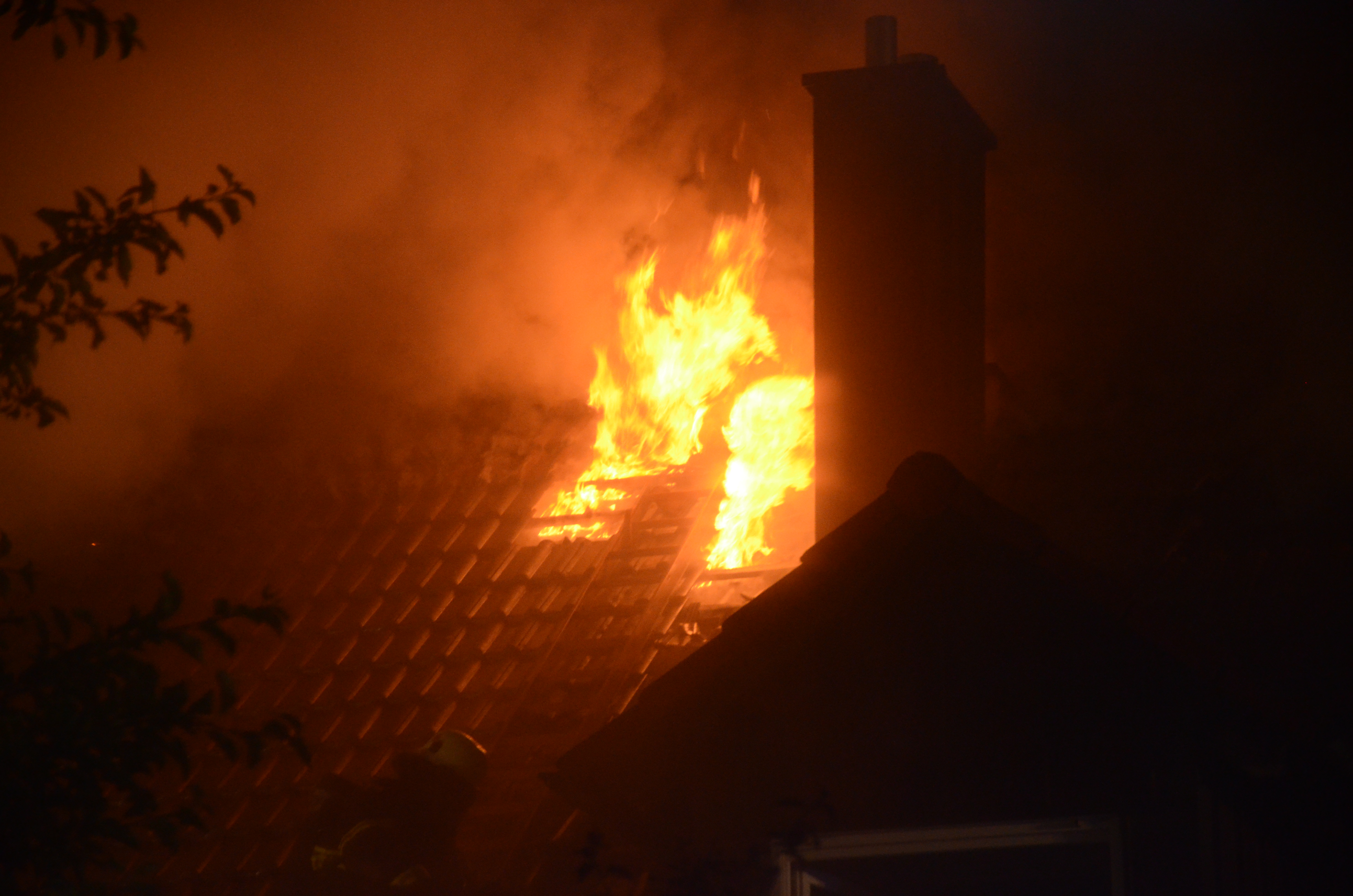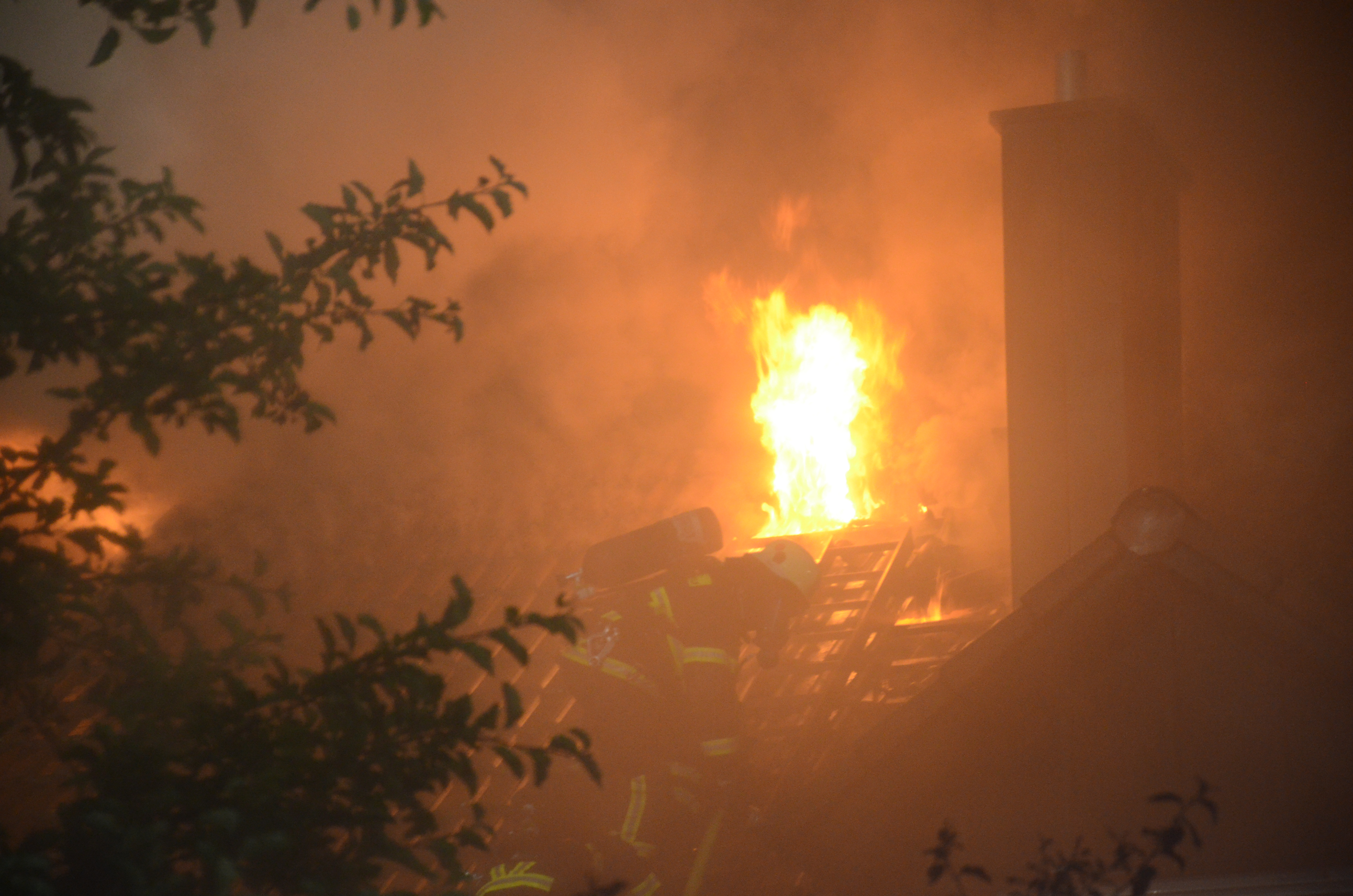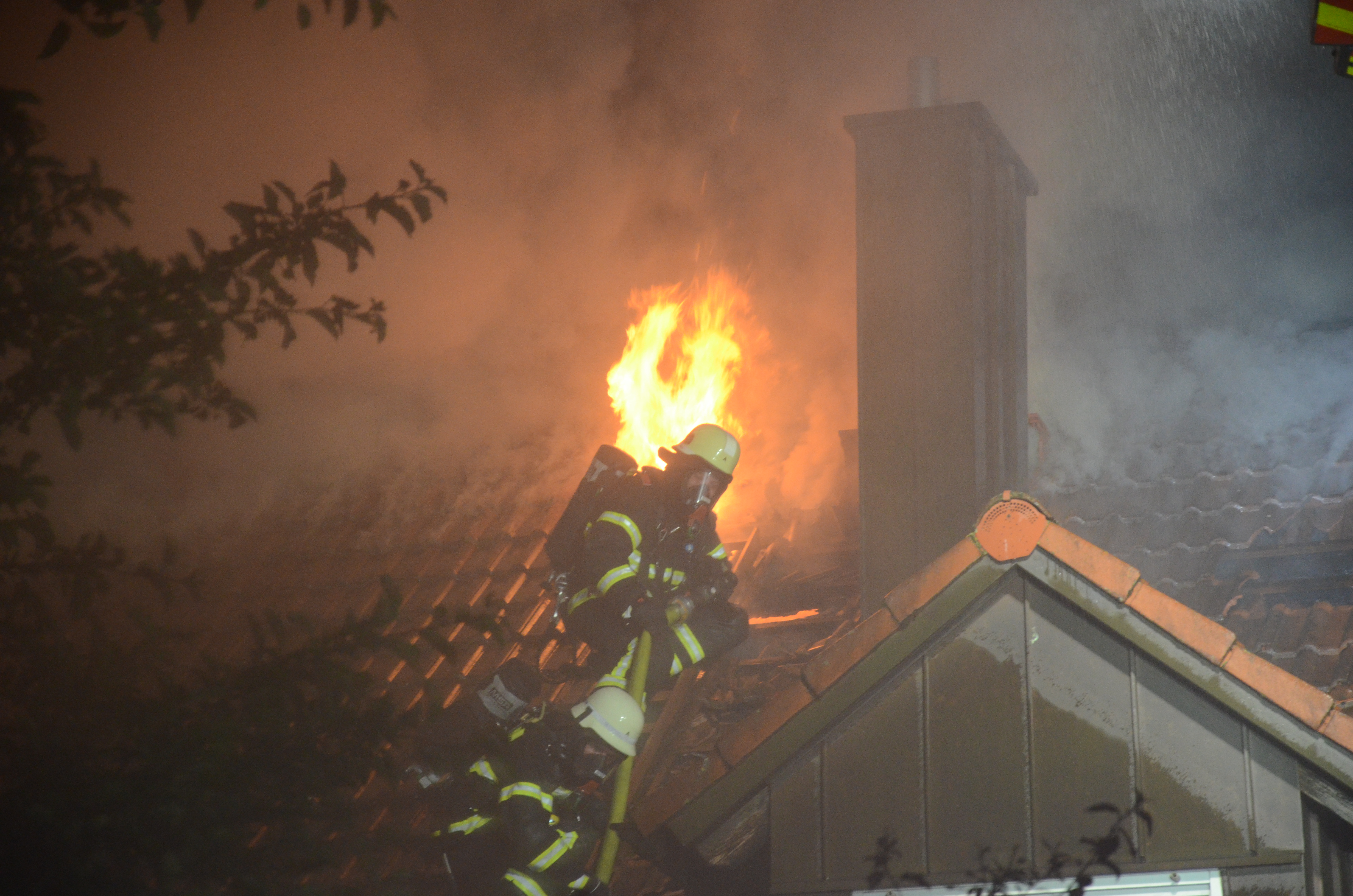 Drei Personen verletzt. Sachschaden vermutlich enorm. Ursache war offenbar ein Blitzschlag, Kripo ermittelt.