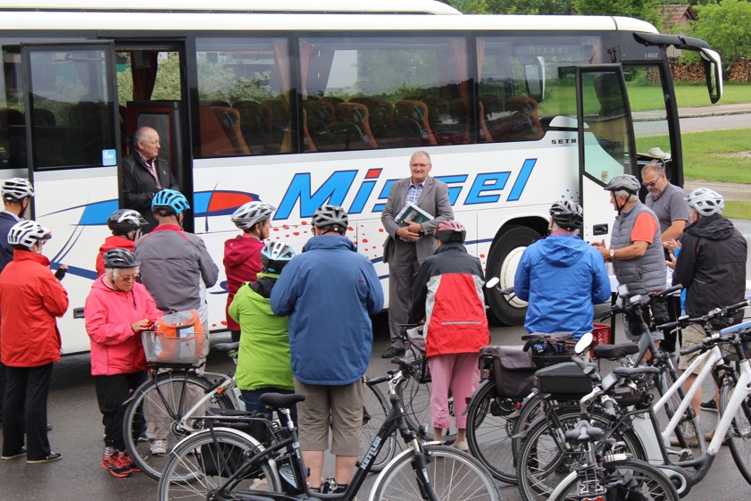 Nachdem jeder ein Geschenkpaket erhalten hatte, wurde in die Pedale getreten. Wenngleich der erste Abschnitt kurz war – ging es doch gerade mal bis zum Spargelhof Sigllechner, der mitten in Hohenwart liegt. Nach der Vorstellung des Betriebes und der Anlagen konnten die Gäste die verschiedenen frischen Spargelsorten kosten und kaufen. Weiter ging es über Waidhofen nach Schrobenhausen. Neben Geschichten über die Region und den „Oxenweg“ berichtete Tour-Guide Harry Müller auch über den Mehrfachmord von Hinterkaifeck – eines der schaurigsten Verbrechen in der bayerischen Kriminal-Geschichte. Nach dem Mittagessen in der Lenbachstadt ging es für die Radler weiter nach Kühbach. Später, nach einer Brotzeit in der Schlossbrauerei, stand die Heimfahrt mit dem Bus an.