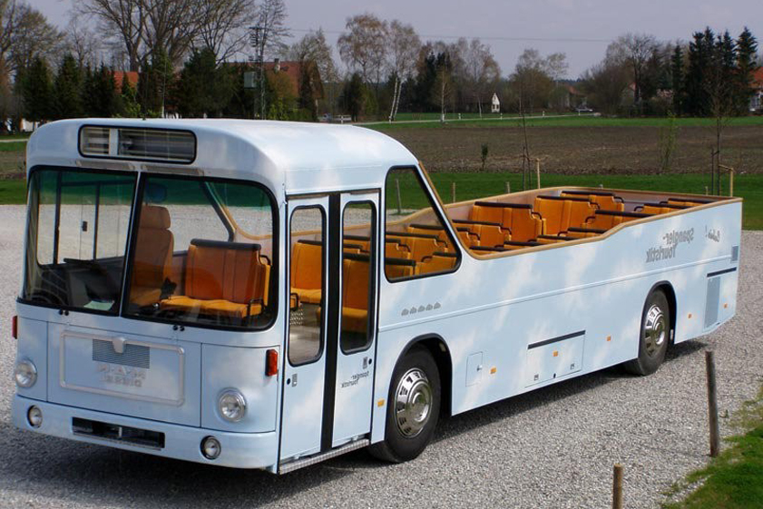 Mit einem Cabrio-Bus geht es zu den verschiedenen Unternehmen.