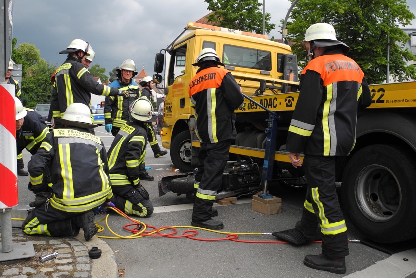 Nur mit Hilfe der Floriansjünger konnte der schwer verletzte Mann, der nach Angaben Polizei aus Marzling stammt, befreit werden. „Dazu mussten sowohl der Abschleppwagen als auch das Motorrad mit Hebekissen und Hydraulikwinden angehoben werden“, berichtete heute ein Sprecher der Freisinger Feuerwehr. „Zuvor hatten Ersthelfer des nahegelegenen Autohauses bereits vergeblich versucht, mit einem Gabelstapler Hilfe zu leisten.“ Der Motorrad-Fahrer wurde nach seiner Rettung vom Notarzt ins örtliche Klinikum transportiert.