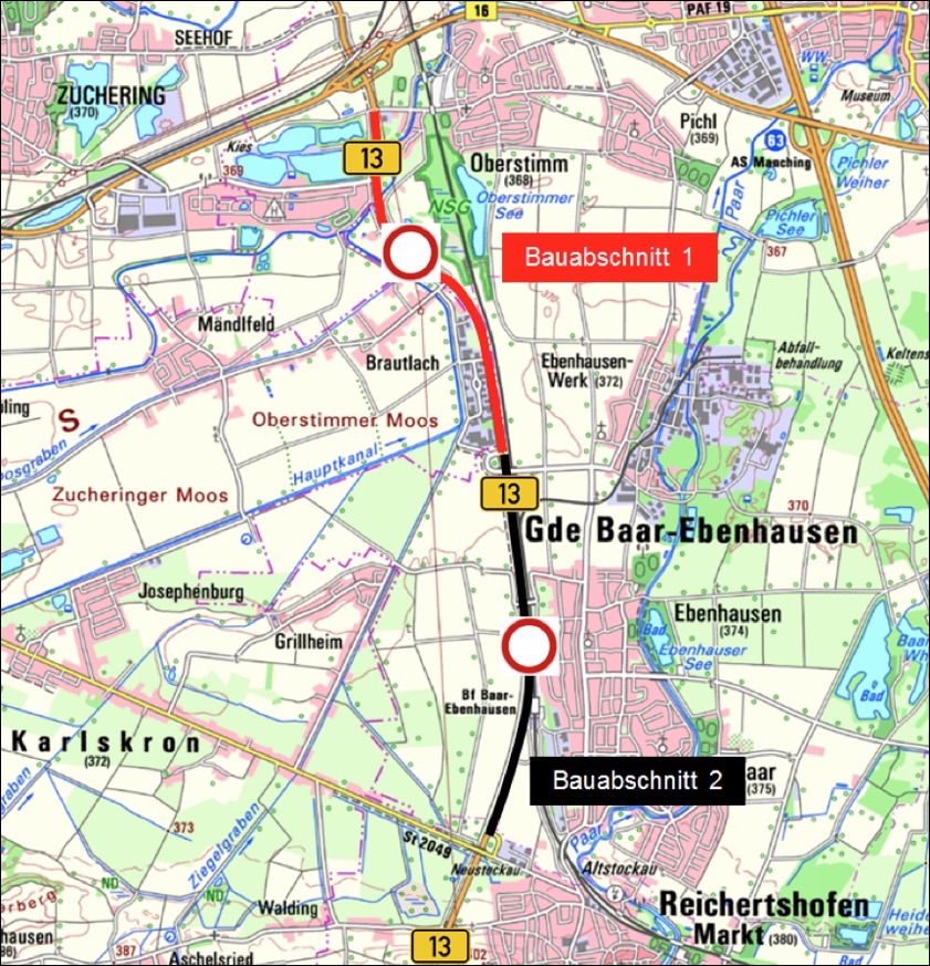 Aus dieser Karte gehen die beiden Bauabschnitte hervor (Quelle: Staatliches Bauamt Ingolstadt).