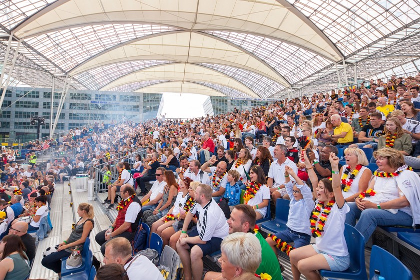 (ty) Jetzt erst recht: Nach der Auftakt-Niederlage bei der Fußball-WM gegen Mexiko benötigt das deutsche Fußball-Nationalteam am kommenden Samstag, 23. Juni, gegen Schweden volle Unterstützung. Schon beim ersten Spiel des deutschen Teams drückten in der ausverkauften "Public Viewing Arena" im Forum des "München Airport Centers" rund 2000 Fans auf der Tribüne Jogi Löws Mannschaft die Daumen (Foto oben). Auf einer 40 Quadratmeter großen LED-Wand werden sämtliche Begegnungen des Turniers übertragen.