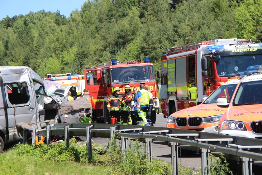 (aa) Gegen 12.30 Uhr kam es heute auf der A93 in Fahrtrichtung Regensburg kurz nach Regenstauf zu einem schweren Unfall. Gemeldet worden waren mehrere eingeklemmte Personen, woraufhin ein Großaufgebot von Rettungskräften alarmiert wurde. Auch ein Rettungshubschrauber landete auf der Autobahn. Was war passiert? Ein Sprinter-Fahrer mit einem leeren Pkw-Anhänger im Schlepptau verlor direkt auf Höhe eines Autobahn-Parkplatzes die Kontrolle über sein Gespann, riss rund 100 Meter Leitplanke nieder und überschlug sich mehrfach.