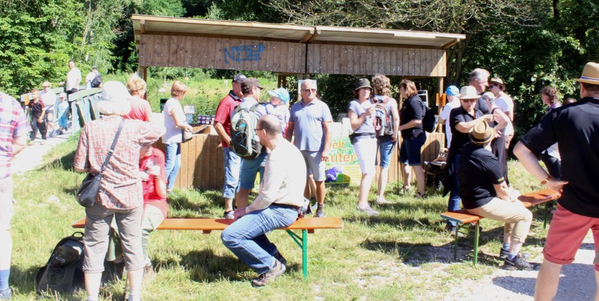 Erster Haltepunkt auf dem Nikolaus-Kapellenweg, war der Stand des Kräuter-Pädagogen Helmut Löffler am blauen Brückerl, das bereits nach kurzer Wanderung erreicht wurde. Unter Anleitung und mit Begeisterung bastelten die Kinder, während sich die älteren Teilnehmer erholen sowie mit Kräuterkuchen, Salbei-, Hibiskus- oder Pfefferminz-Limonade stärkten. Im Anschluss an den ersten Halt teilten sich die Strecken. So trafen nach und nach alle im Garten des Pfarrheims ein, wo sie vom Team des Wander- und Verschönerungsvereins mit Würsten, Steaksemmeln, Kaffee und Kuchen versorgt wurden.