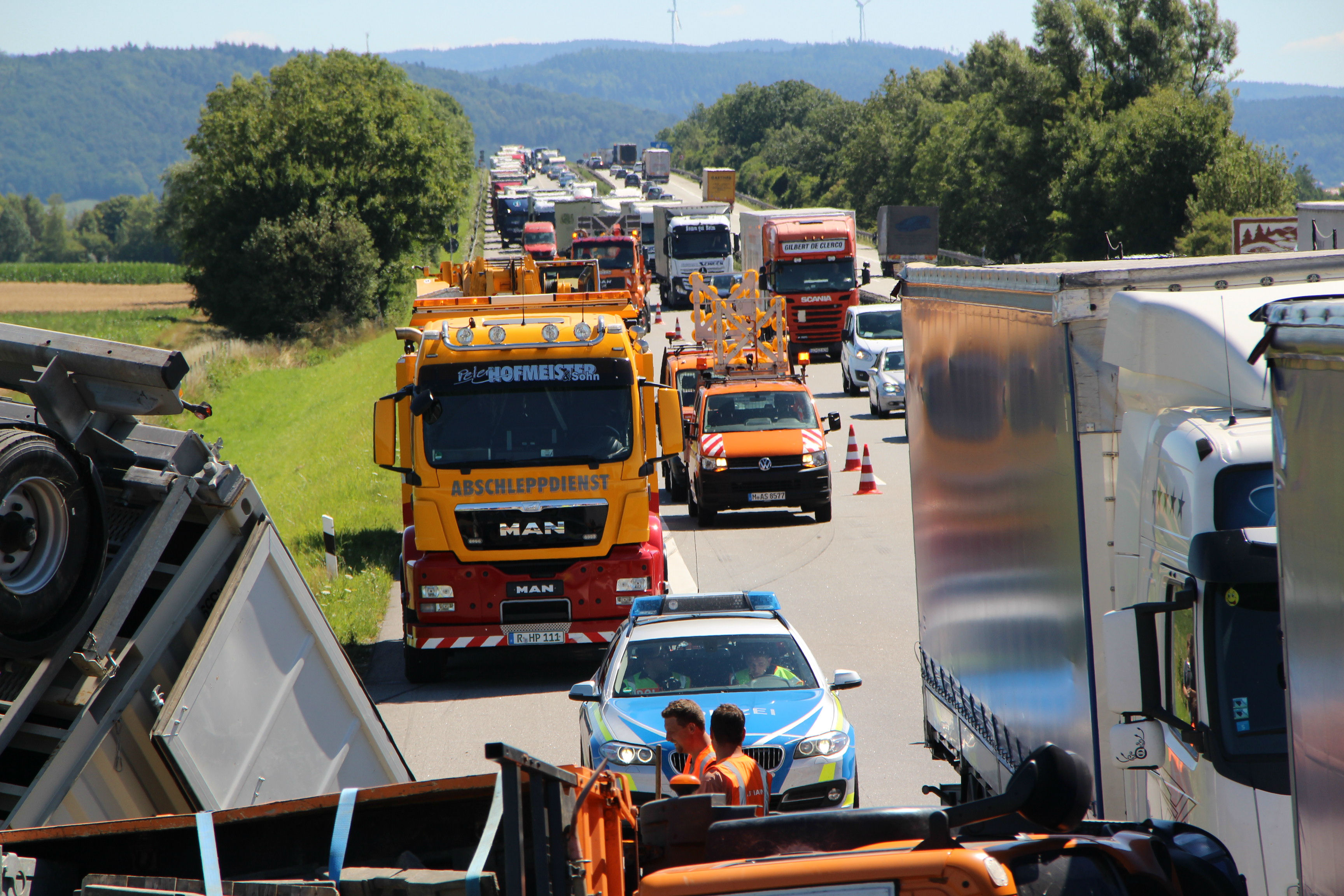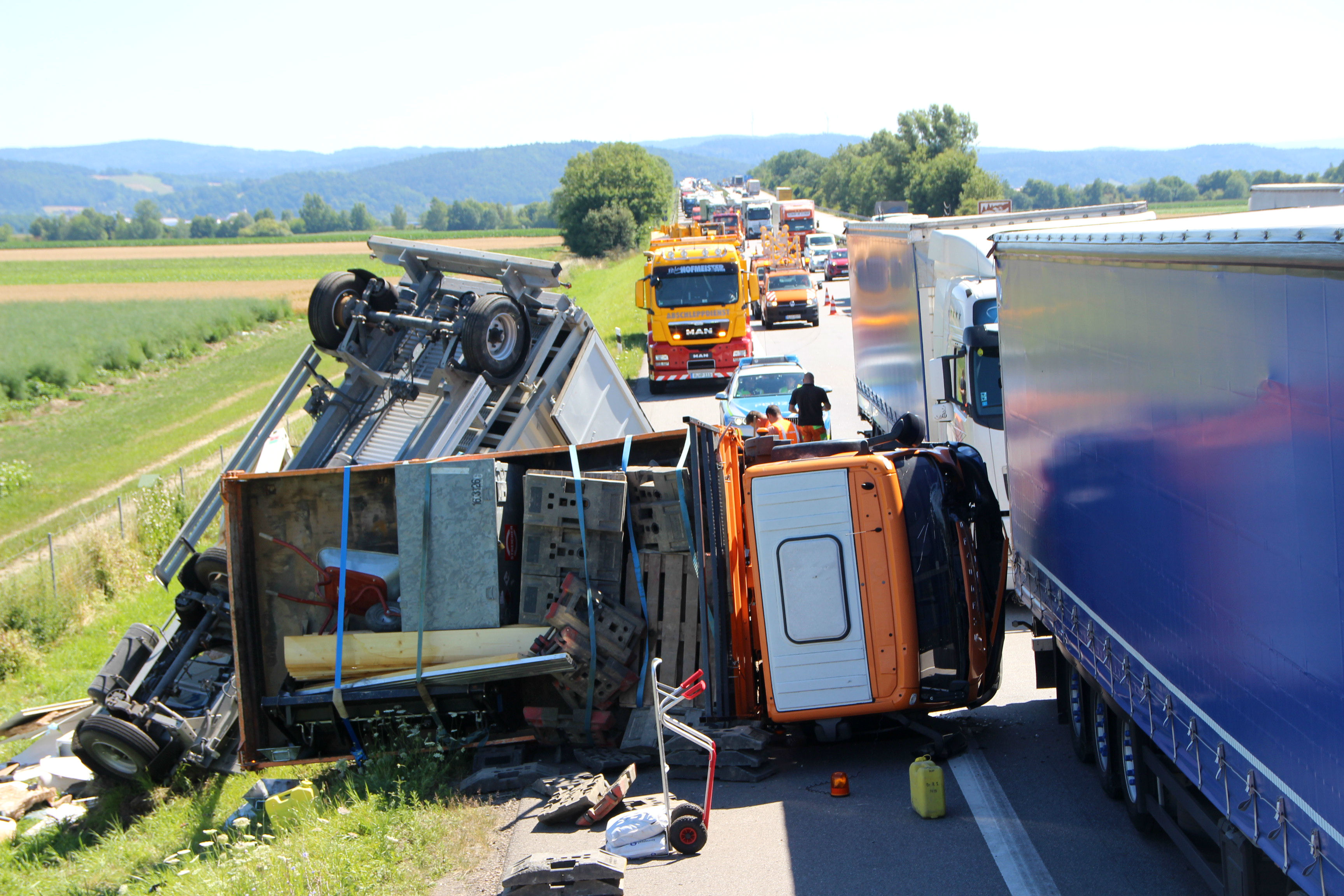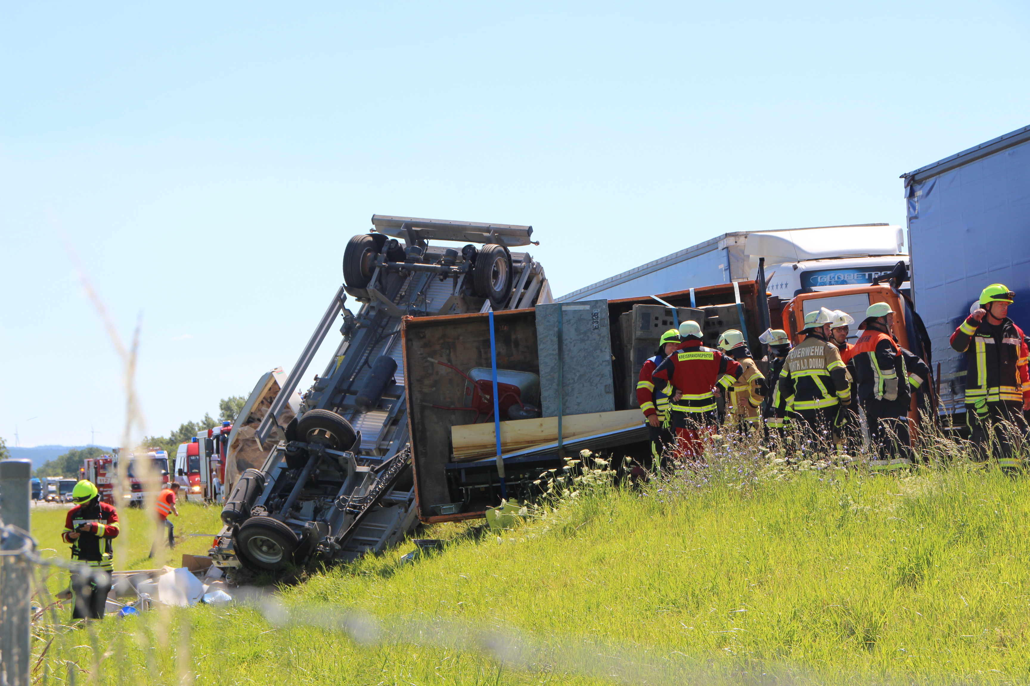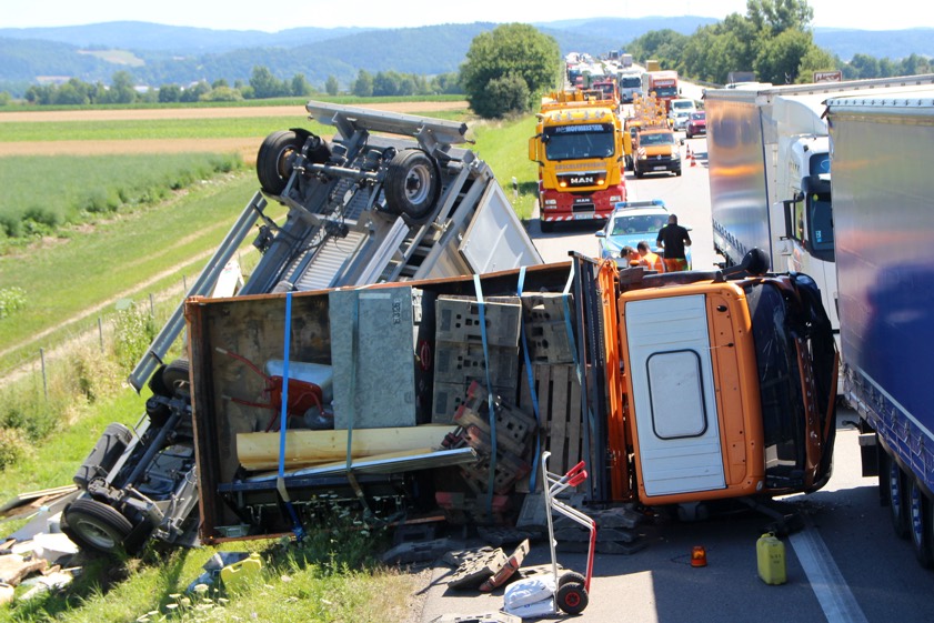 (ty) Heute Vormittag gegen 9.45 Uhr war ein 50-jähriger Tscheche mit seinem Lastwagen auf der Autobahn A3 in Richtung Nürnberg unterwegs, als es im Landkreis Regensburg zu dem heftigen Unfall kam. Zirka einen Kilometer nach der Donaubrücke – zwischen den Anschlussstellen Wörth/Wiesent und Rosenhof – übersah er nach Angaben der Polizei das Stau-Ende auf der rechten Spur. Er lenkte seinen Lkw-Kipper samt Anhänger daraufhin auf den Pannenstreifen und konnte somit einen Auffahr-Unfall mit einem Lkw verhindern – kollidierte allerdings dann mit einem im Stau stehenden Klein-Laster leicht, woraufhin sein 40-Tonnen-Zug nach rechts umkippte und auf der Standspur liegenblieb.