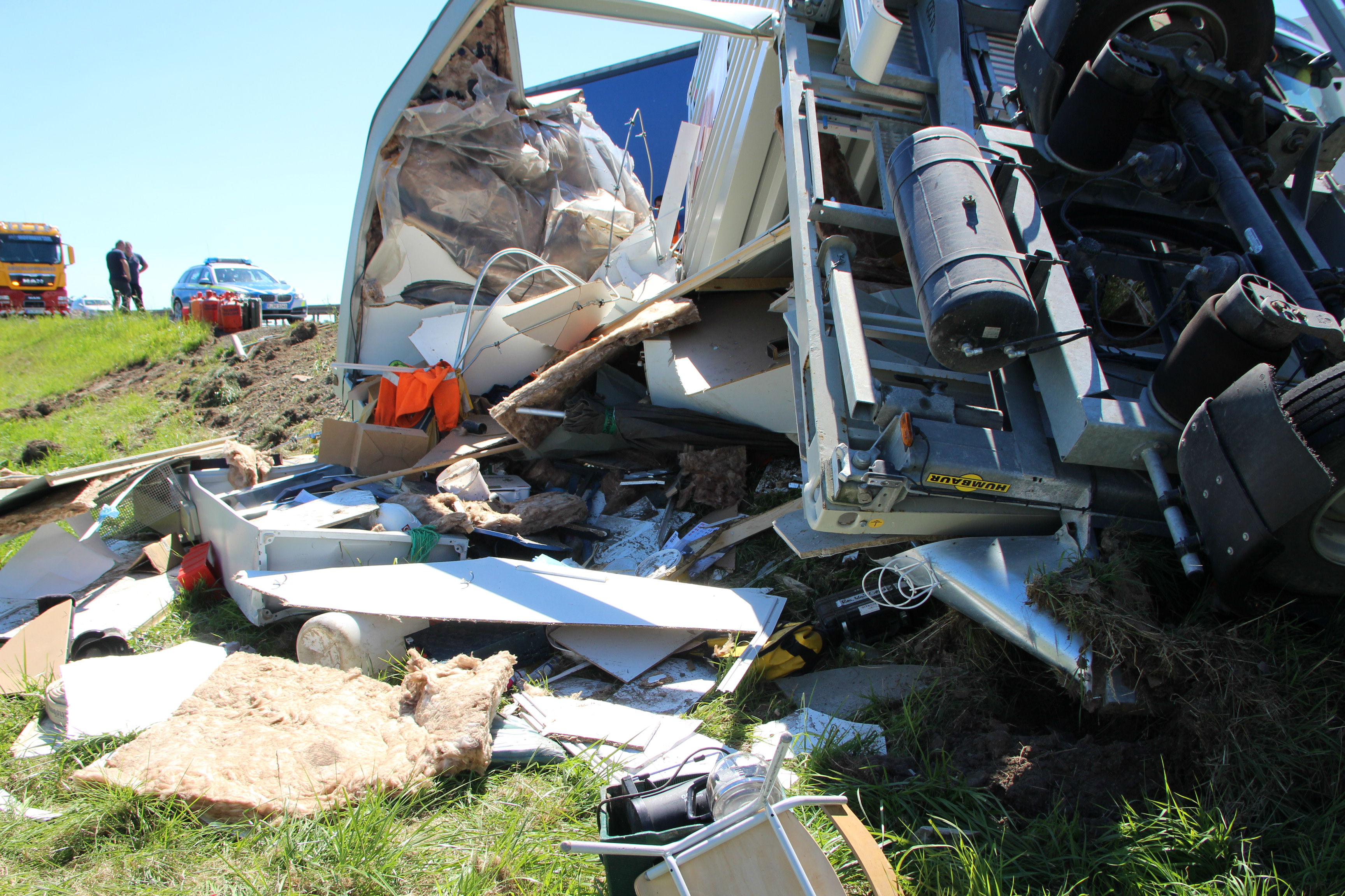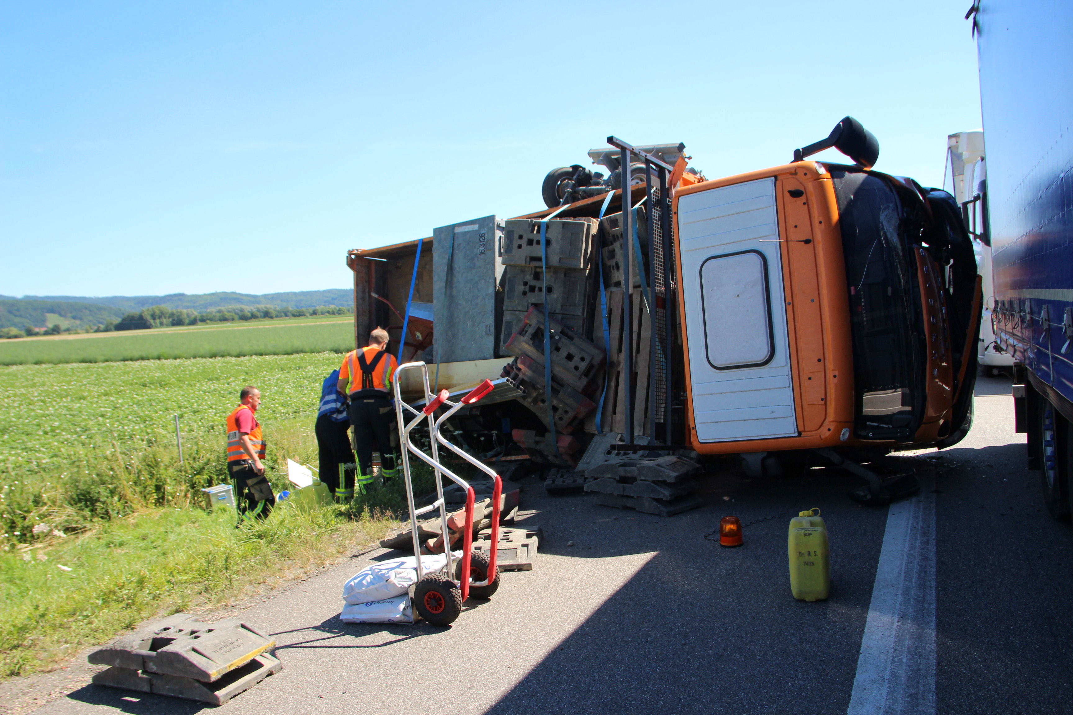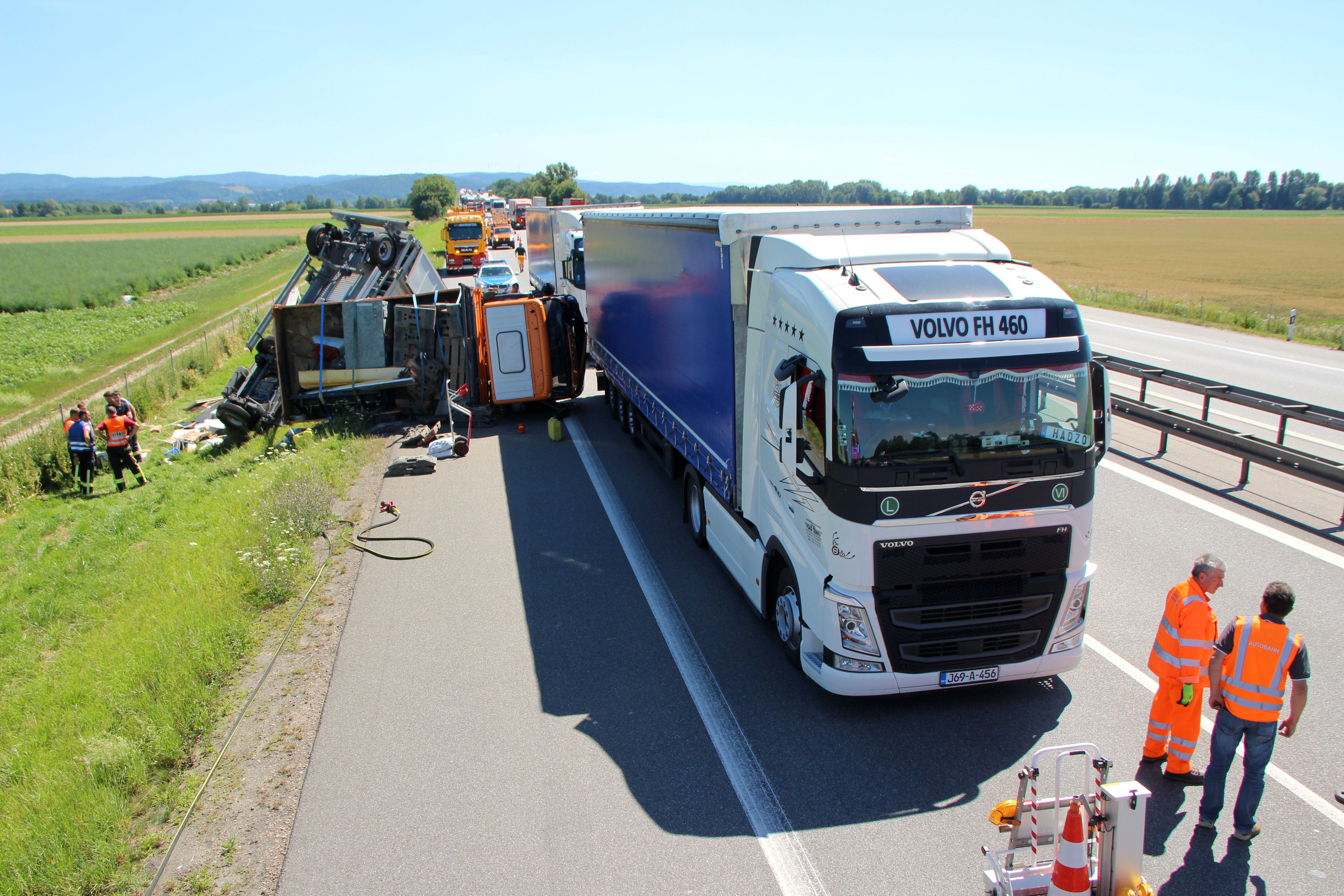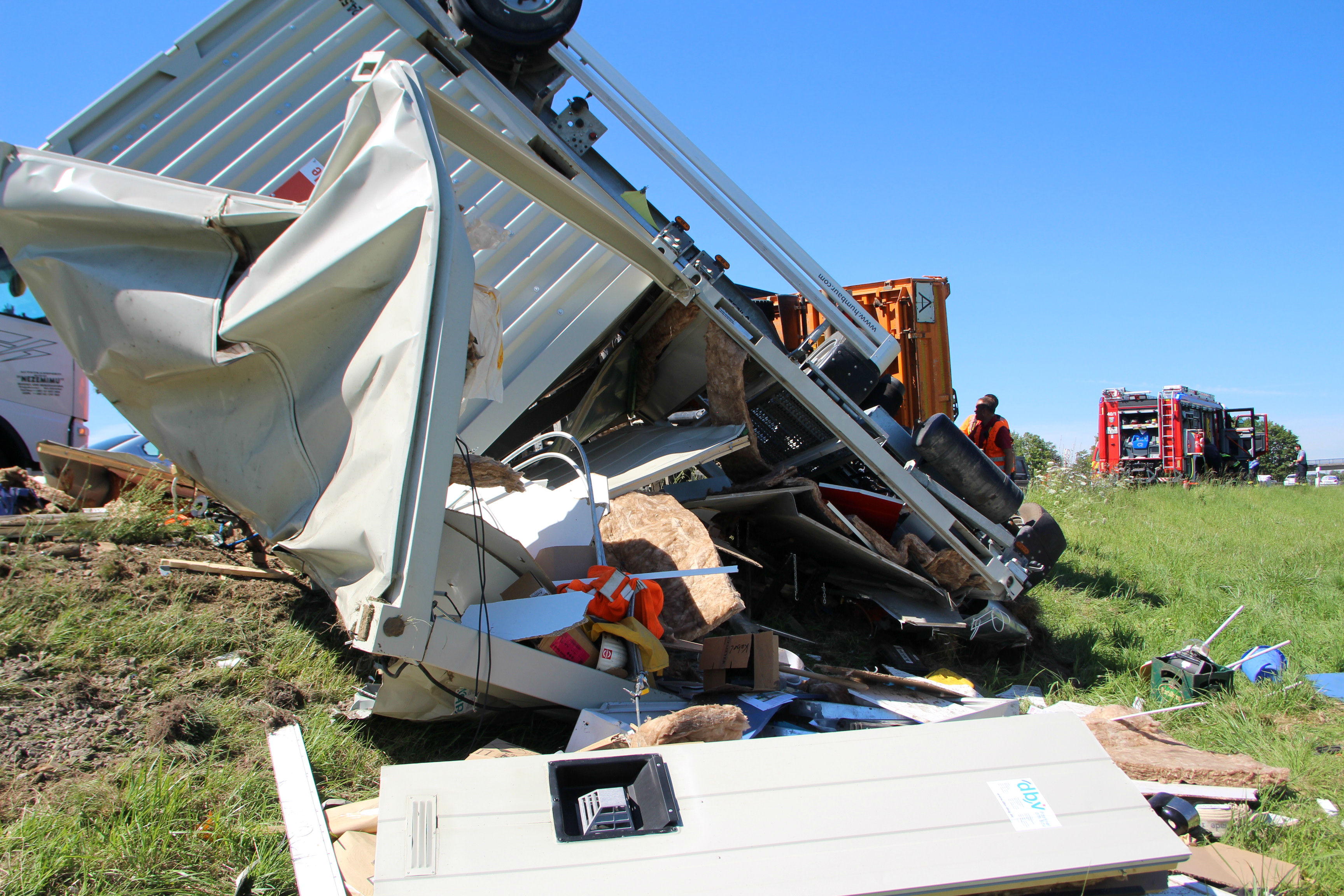 (ty) Heute Vormittag gegen 9.45 Uhr war ein 50-jähriger Tscheche mit seinem Lastwagen auf der Autobahn A3 in Richtung Nürnberg unterwegs, als es im Landkreis Regensburg zu dem heftigen Unfall kam. Zirka einen Kilometer nach der Donaubrücke – zwischen den Anschlussstellen Wörth/Wiesent und Rosenhof – übersah er nach Angaben der Polizei das Stau-Ende auf der rechten Spur. Er lenkte seinen Lkw-Kipper samt Anhänger daraufhin auf den Pannenstreifen und konnte somit einen Auffahr-Unfall mit einem Lkw verhindern – kollidierte allerdings dann mit einem im Stau stehenden Klein-Laster leicht, woraufhin sein 40-Tonnen-Zug nach rechts umkippte und auf der Standspur liegenblieb.
