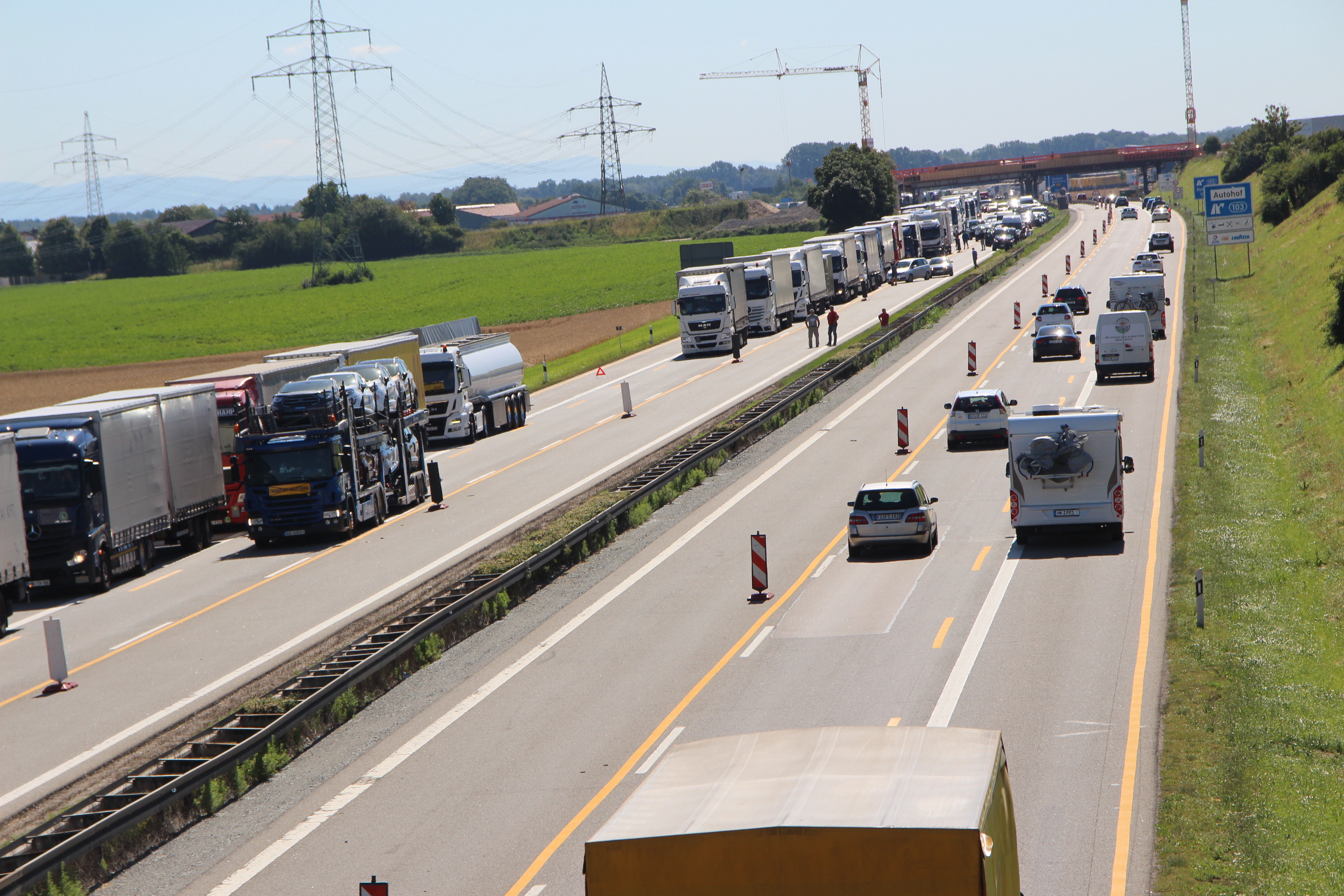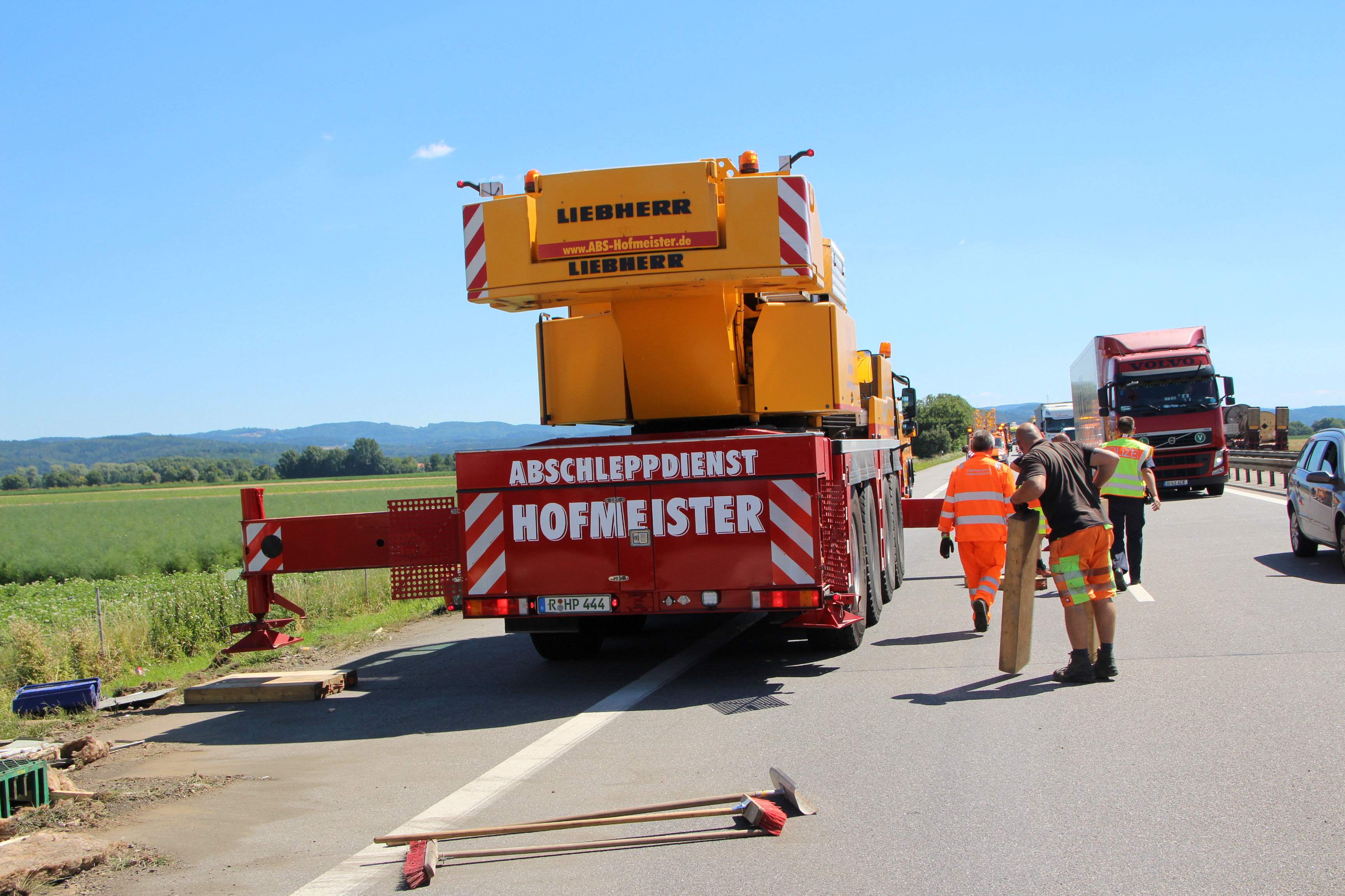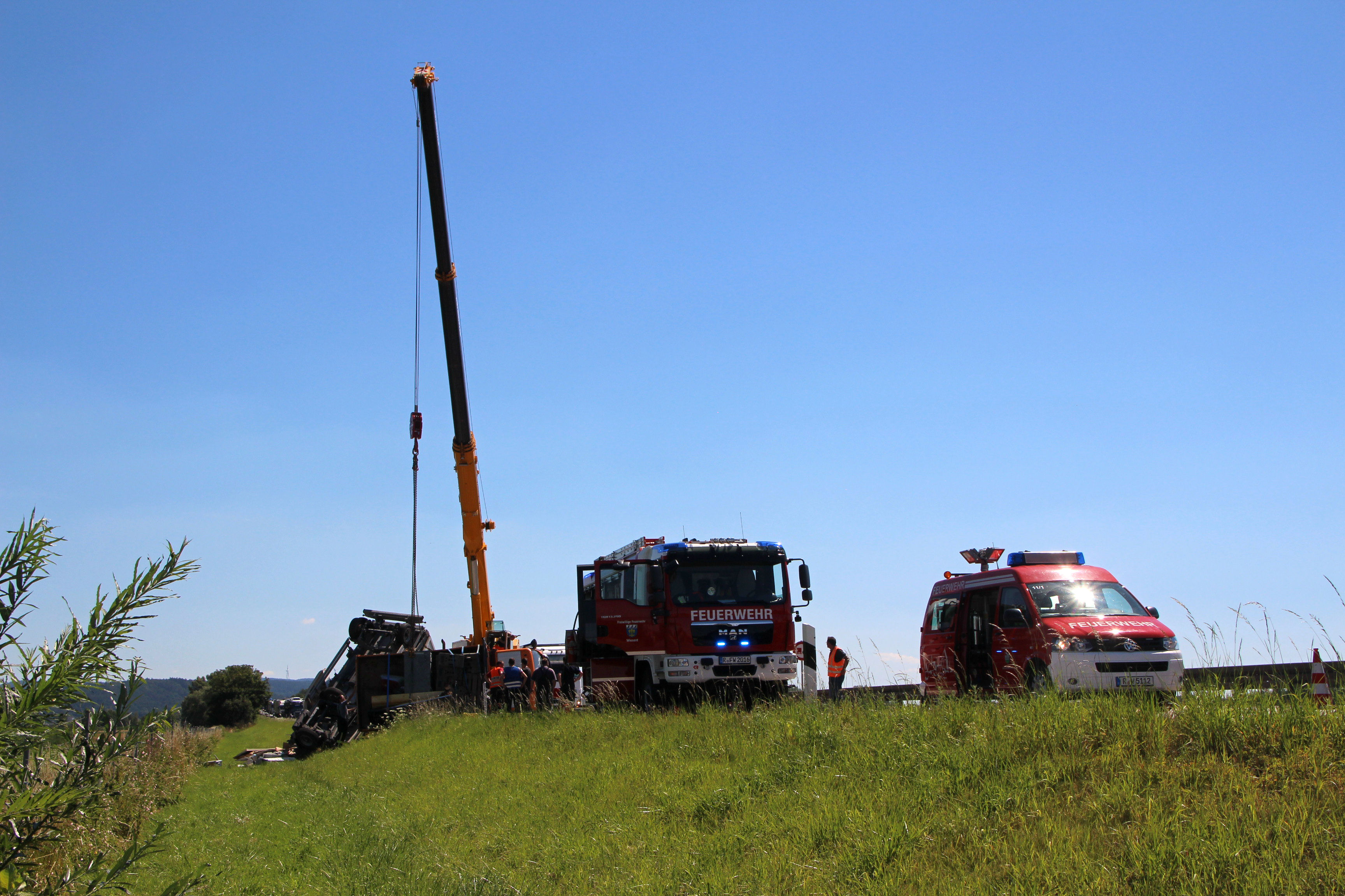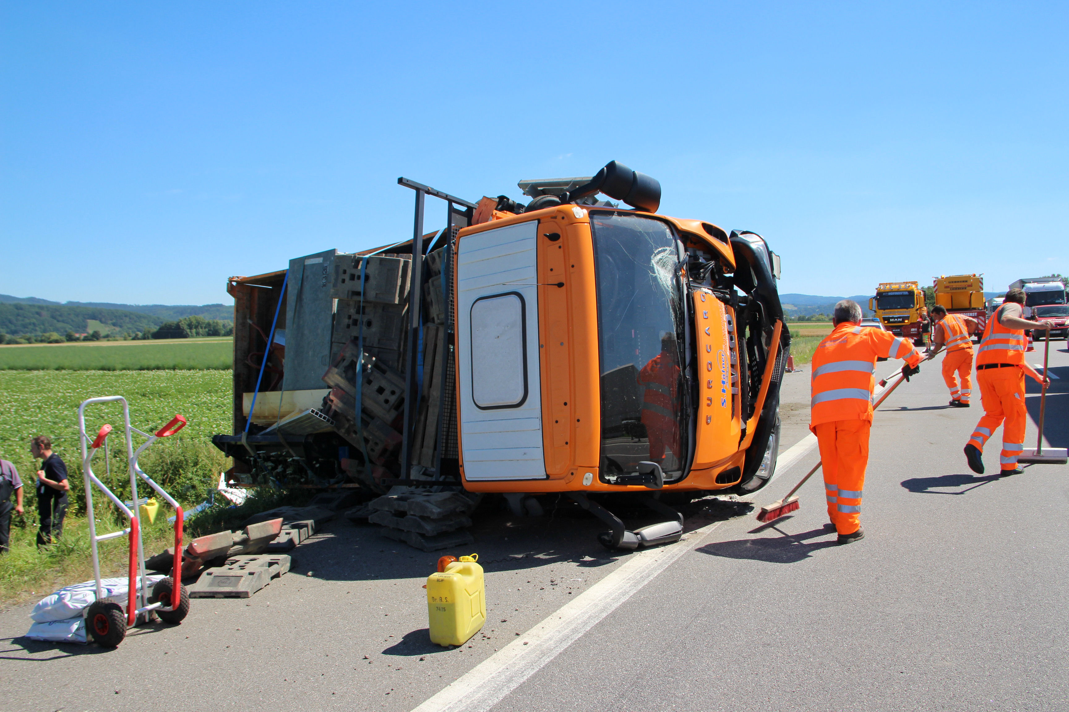 (ty) Heute Vormittag gegen 9.45 Uhr war ein 50-jähriger Tscheche mit seinem Lastwagen auf der Autobahn A3 in Richtung Nürnberg unterwegs, als es im Landkreis Regensburg zu dem heftigen Unfall kam. Zirka einen Kilometer nach der Donaubrücke – zwischen den Anschlussstellen Wörth/Wiesent und Rosenhof – übersah er nach Angaben der Polizei das Stau-Ende auf der rechten Spur. Er lenkte seinen Lkw-Kipper samt Anhänger daraufhin auf den Pannenstreifen und konnte somit einen Auffahr-Unfall mit einem Lkw verhindern – kollidierte allerdings dann mit einem im Stau stehenden Klein-Laster leicht, woraufhin sein 40-Tonnen-Zug nach rechts umkippte und auf der Standspur liegenblieb.