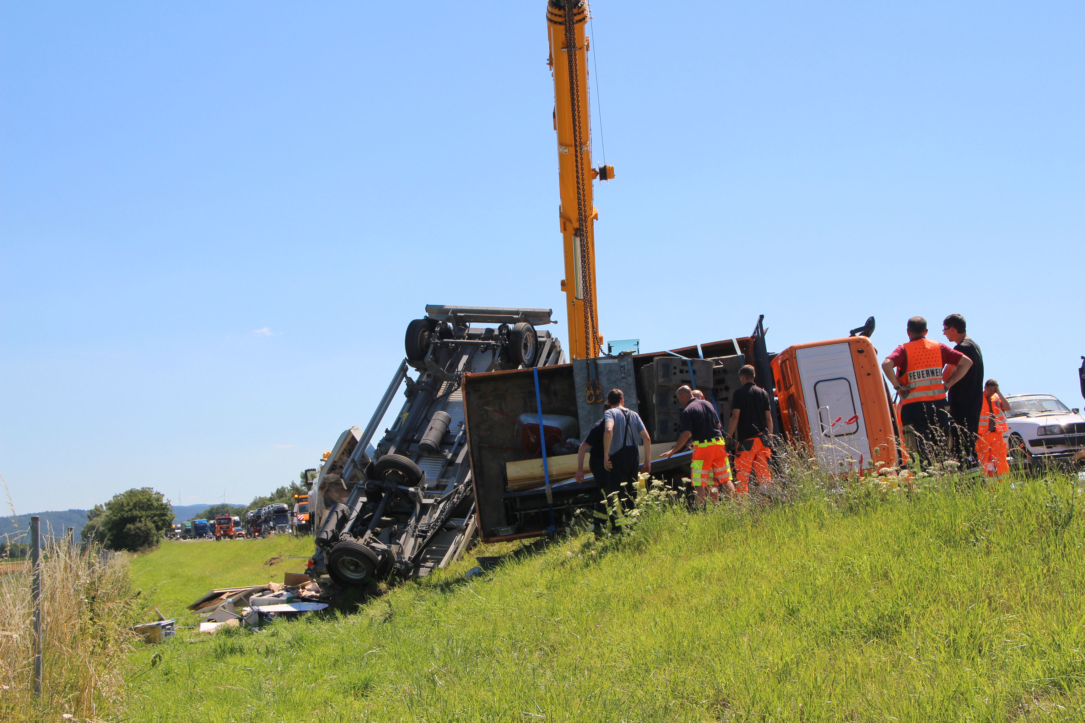 40-Tonner-Fahrer übersah heute Vormittag das Stau-Ende: Er wich noch aus, kollidierte dann mit einem Klein-Laster und sein Gespann kippte um.