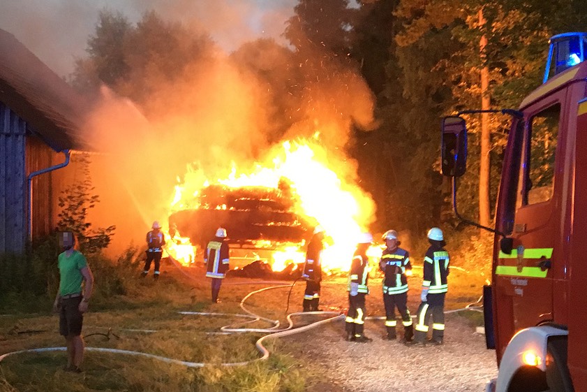 (ty) Am gestrigen Abend gegen 21.20 Uhr hatte ein Passant das große Feuer bei einer Scheune auf freiem Feld neben der B301 nördlich von Freising entdeckt und sofort Alarm geschlagen. Wie sich herausstellen sollte, brannte ein mit Stroh-Quadern beladener landwirtschaftlicher Anhänger bereits lichterloh. Ein Übergreifen der Flammen auf den Stadel konnte zum Glück verhindert werden. Um die Wasserversorgung sicherzustellen, setzte die Feuerwehr zahlreiche Löschfahrzeuge im Pendelverkehr ein. Die Polizei beziffert den Schaden auf zirka 1500 Euro. Die Ursache sei bislang nicht geklärt, es gebe jedoch keine Hinweise auf Brandstiftung.