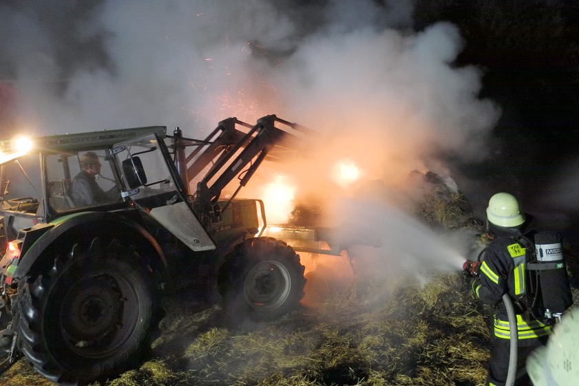Direkt neben einer mit Stroh gefüllten Scheune bei Freising war gestern Abend ein Stroh-Anhänger in Brand geraten.